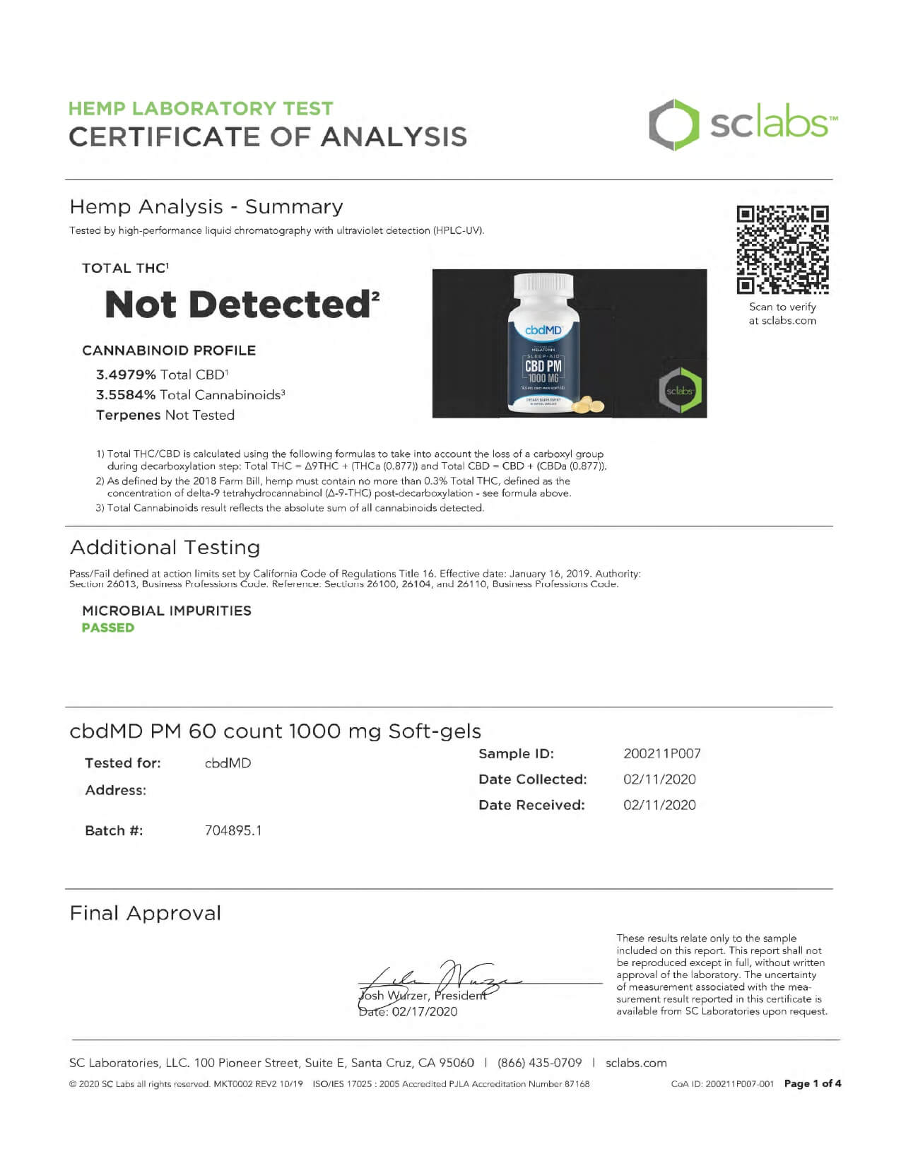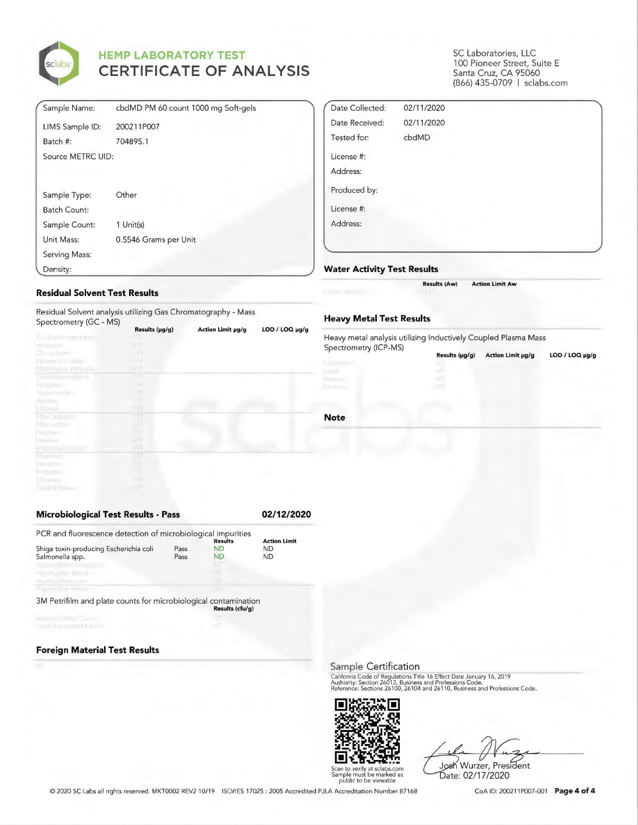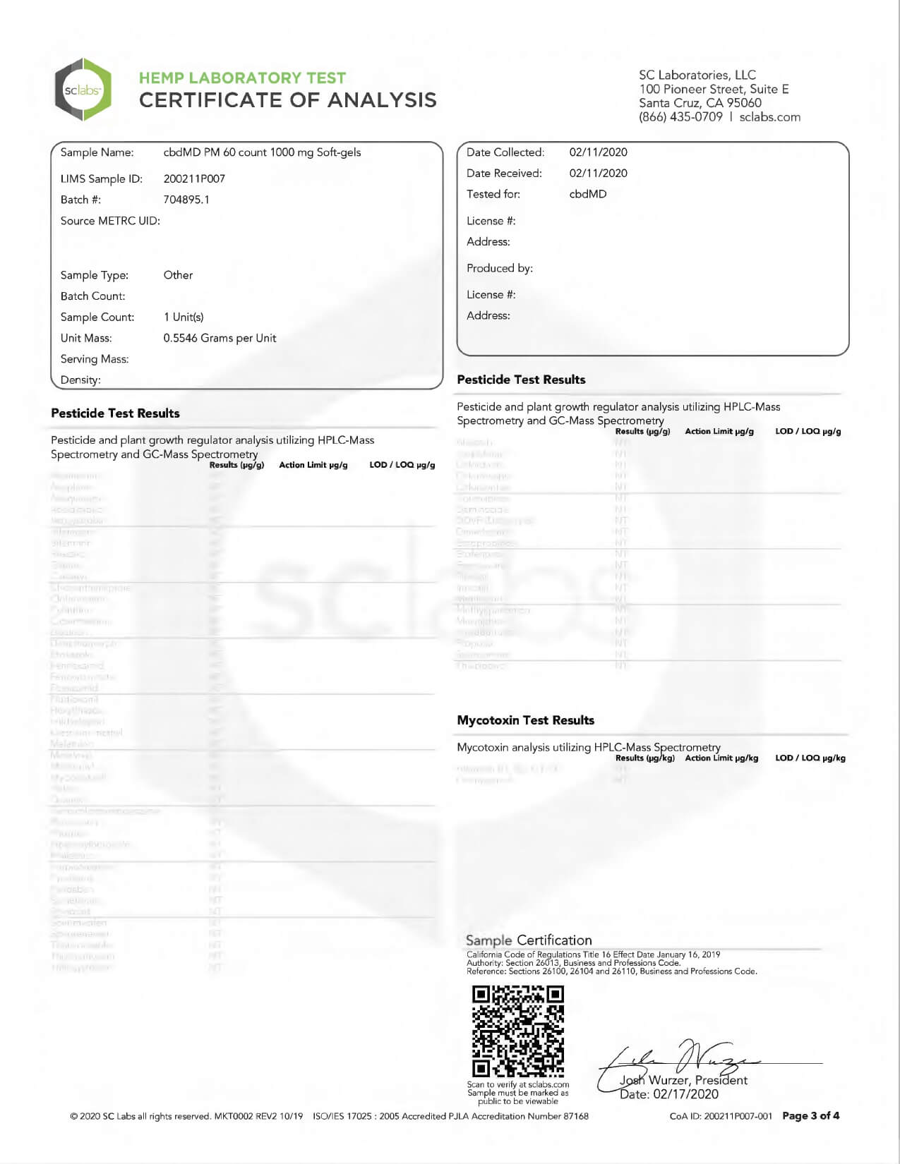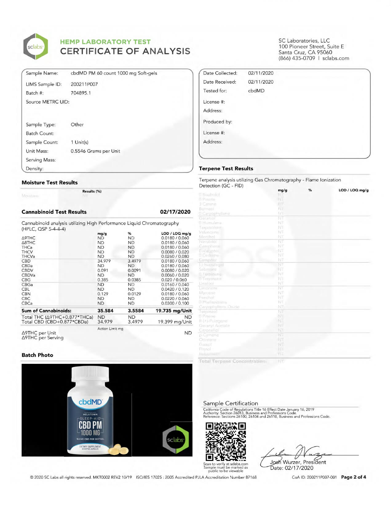 cbdMD CBD Softgels PM Softgel Capsules 1000mg Lab Report