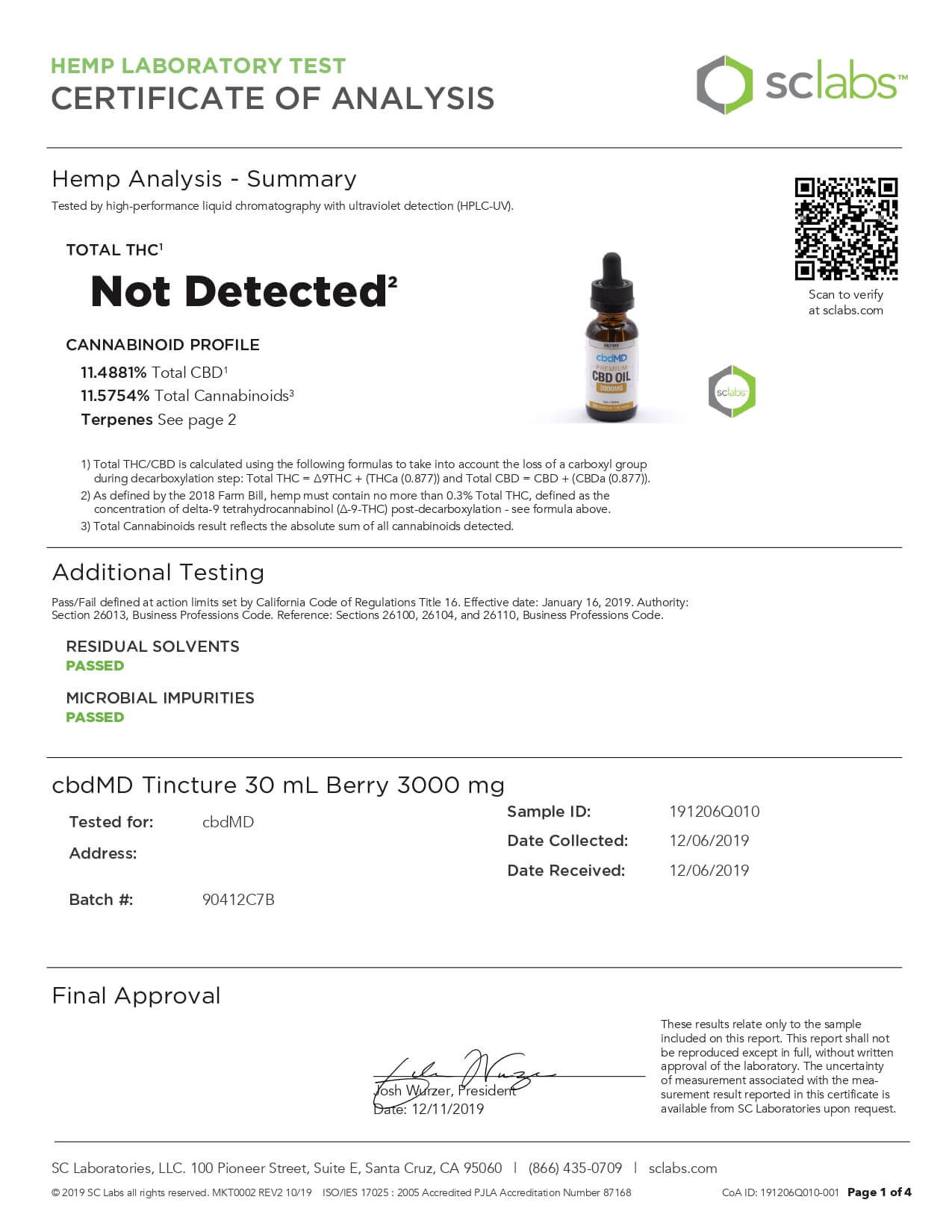 cbdMD CBD Tincture Broad Spectrum Berry 30ml 3000mg Lab Report
