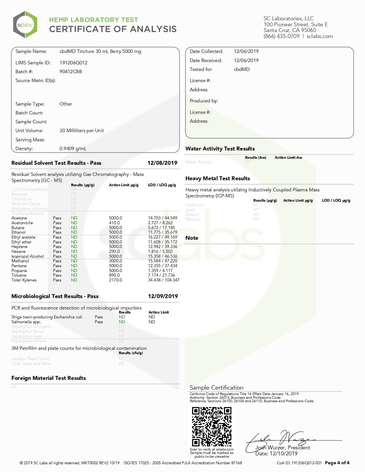 cbdMD CBD Tincture Broad Spectrum Berry 30ml 5000mg Lab Report