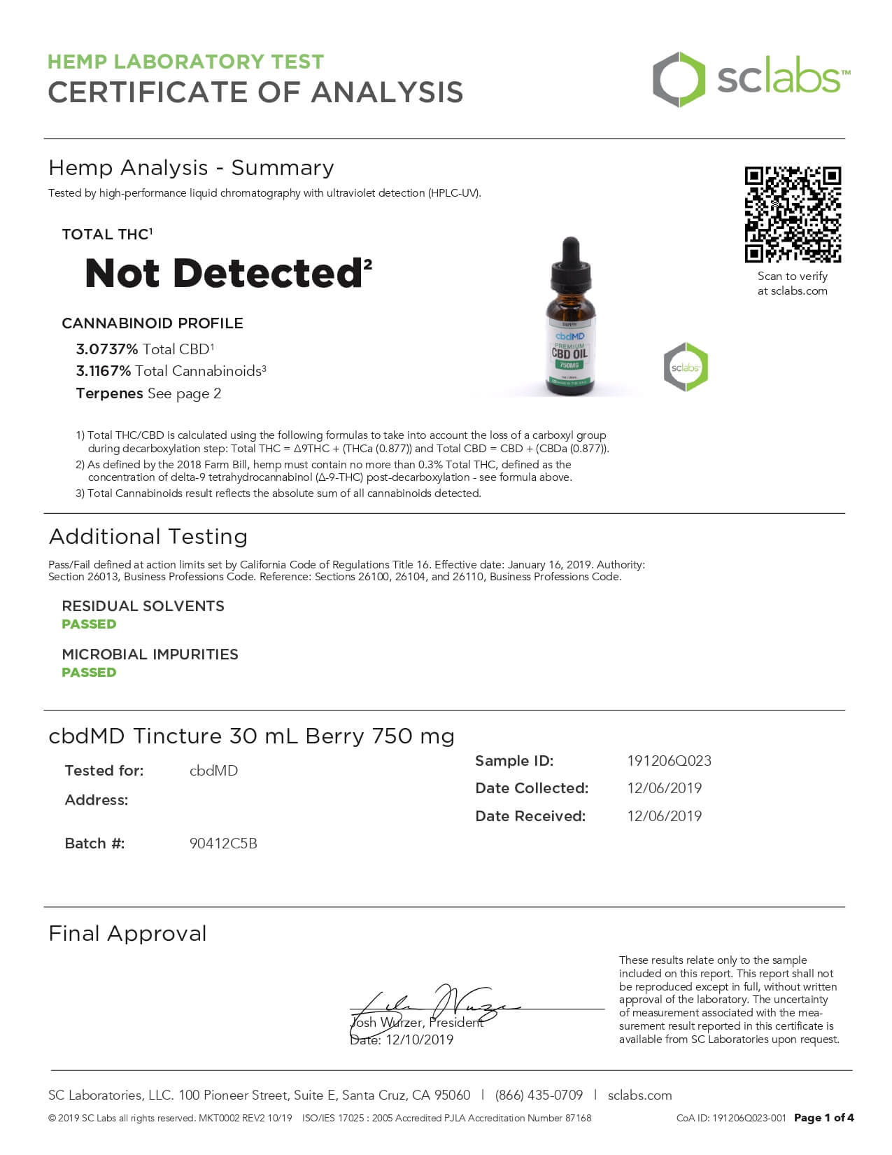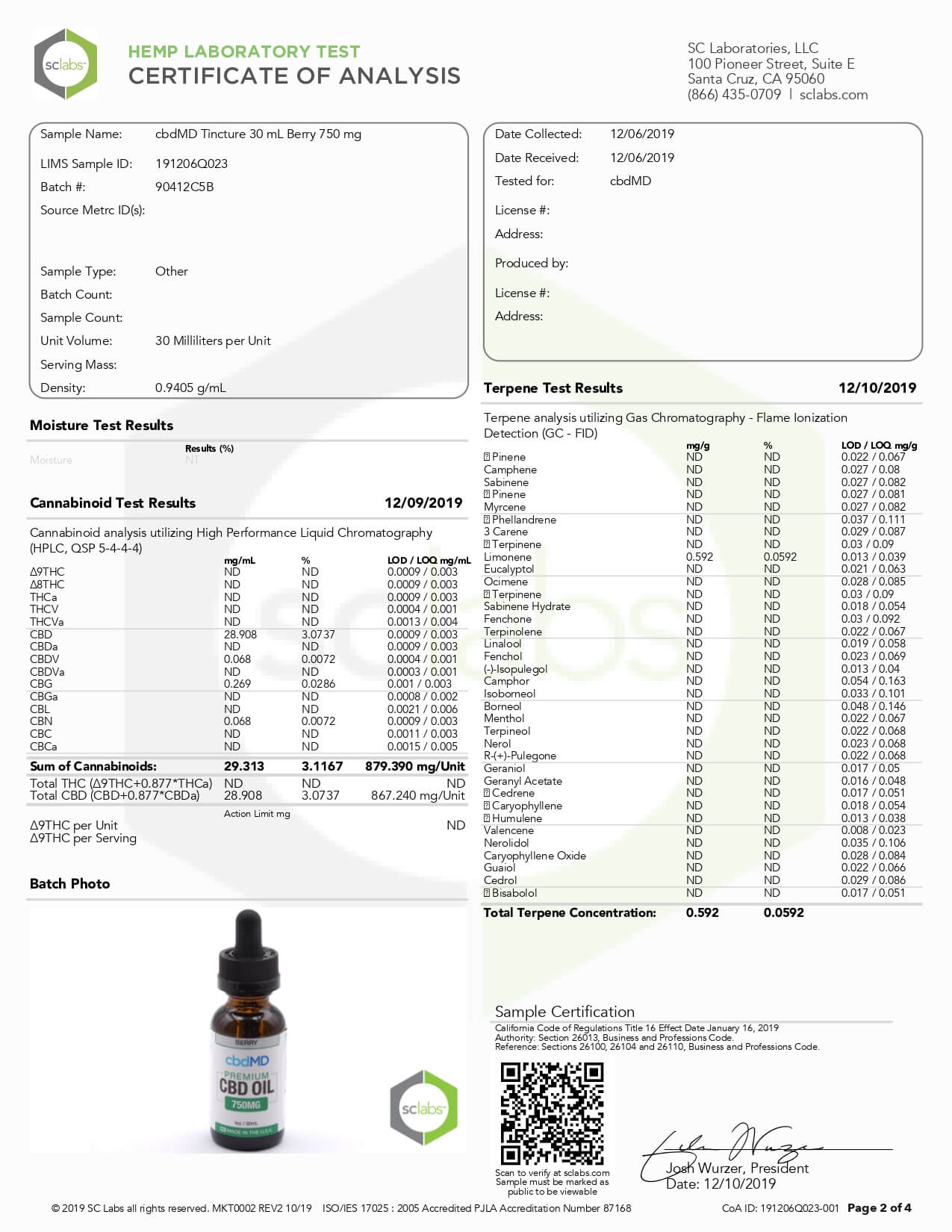 cbdMD CBD Tincture Broad Spectrum Berry 30ml 750mg Lab Report