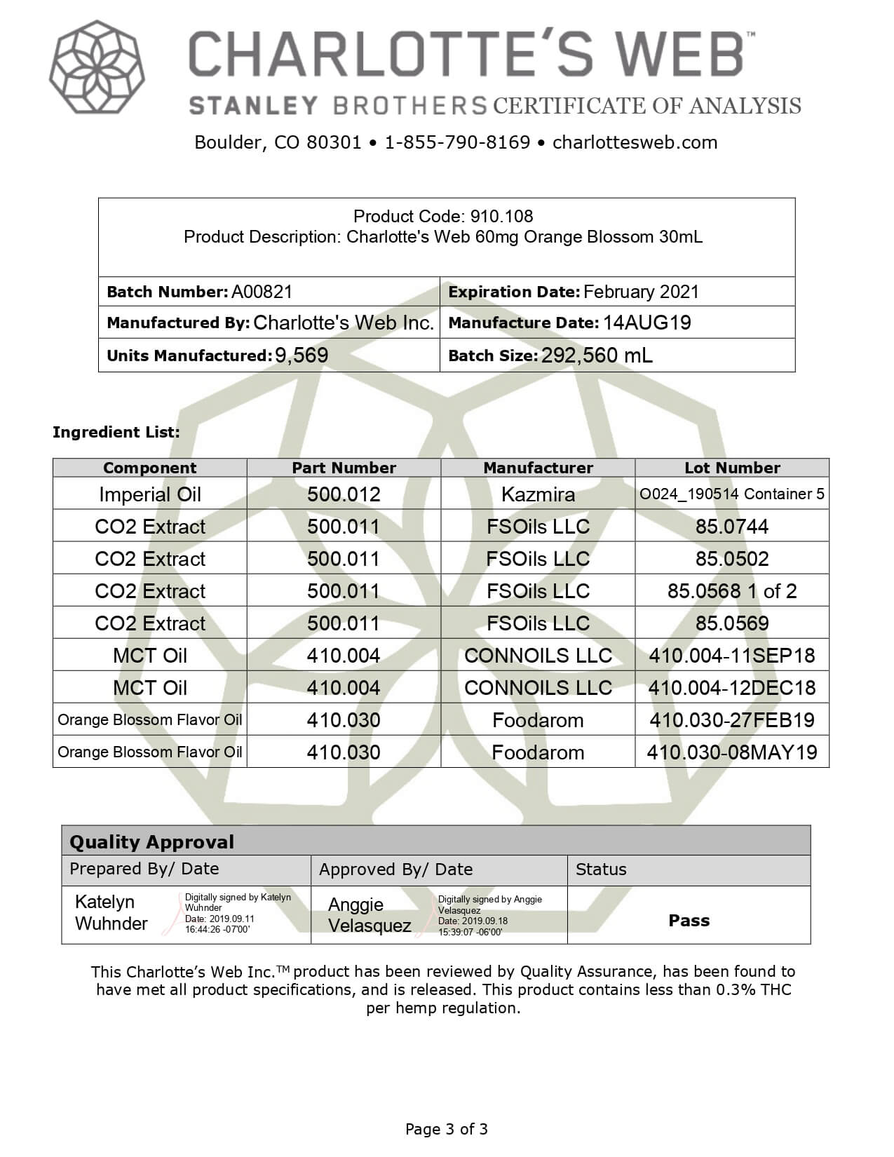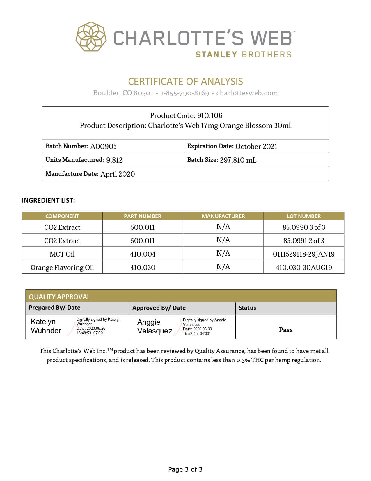 Charlottes Web Full Spectrum Orange Blossom 17mg 1ml Lab Report