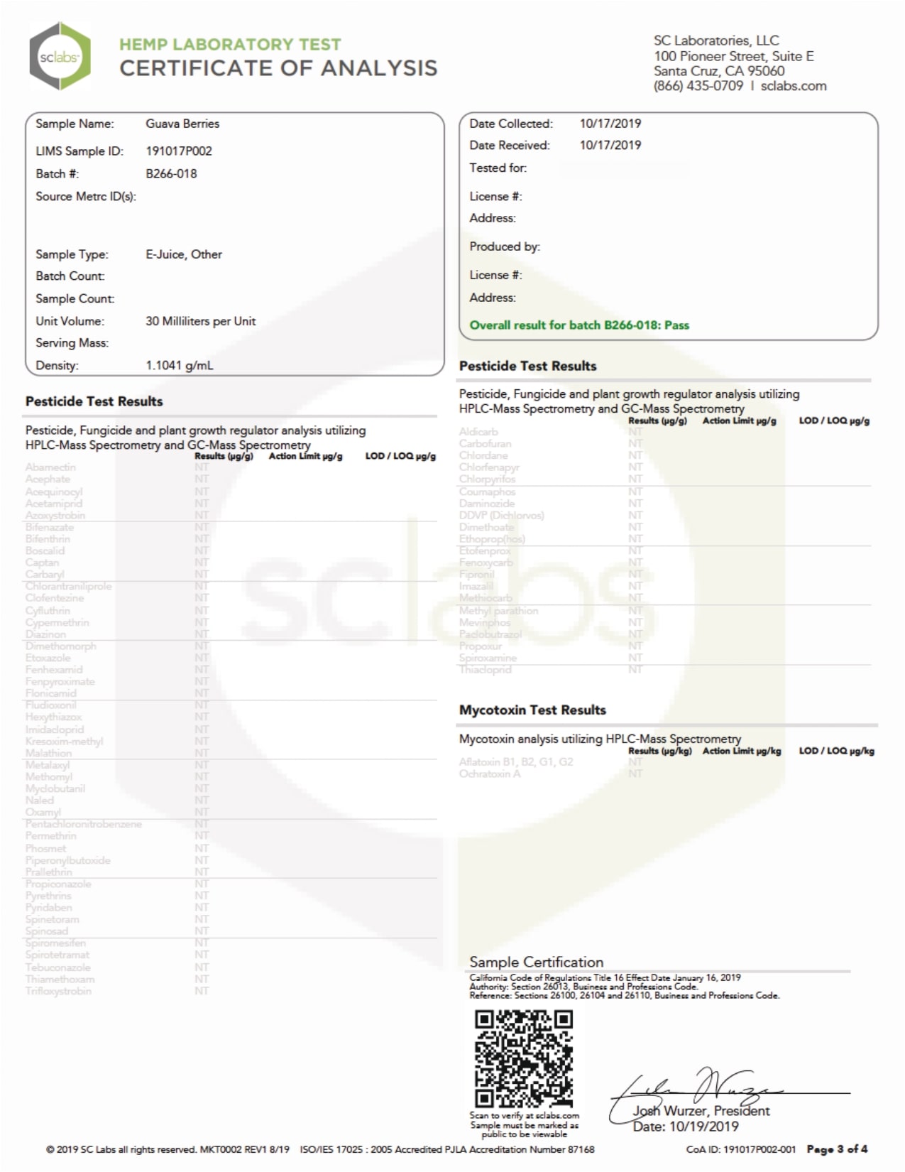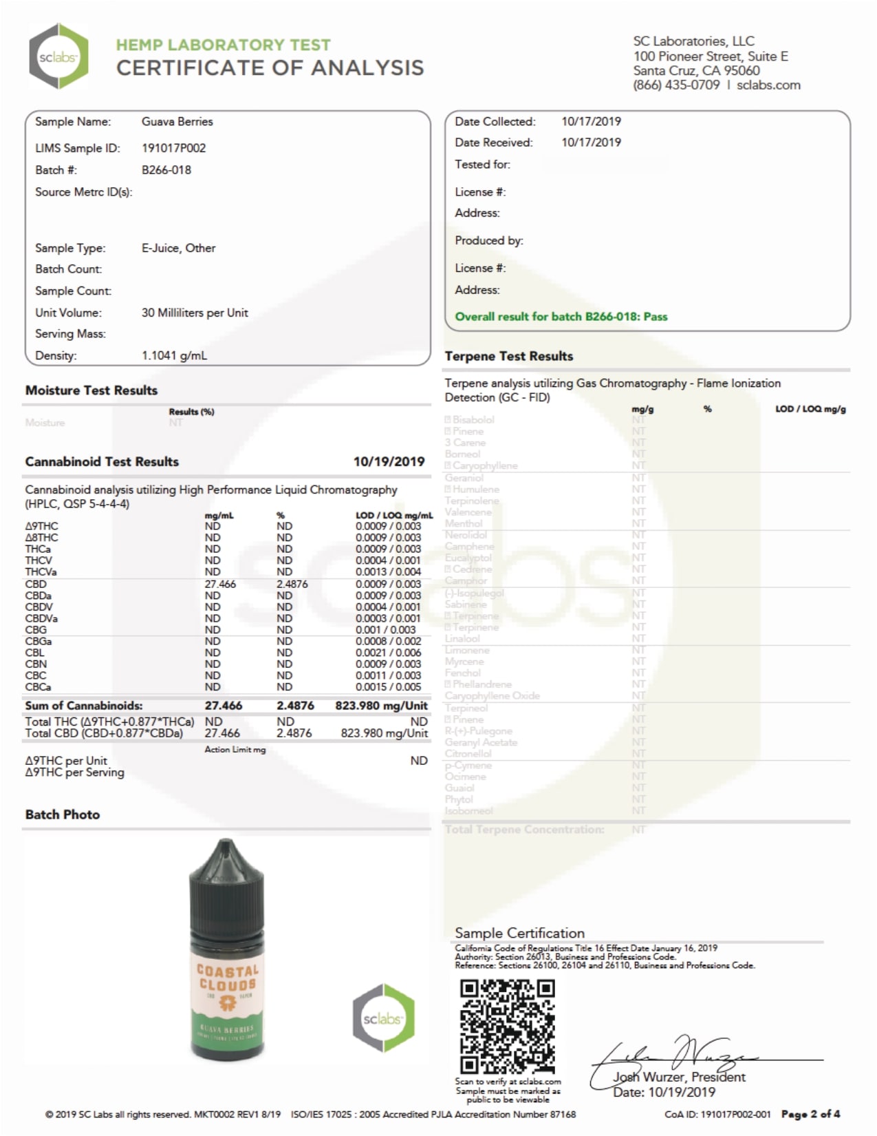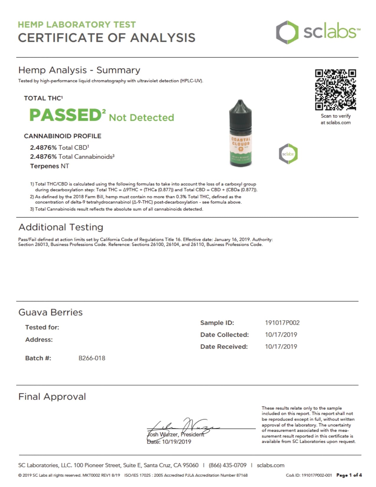Coastal Clouds CBD Guava Berries Vape Juice Lab Report is provided for your best interest in regards to vaping products.