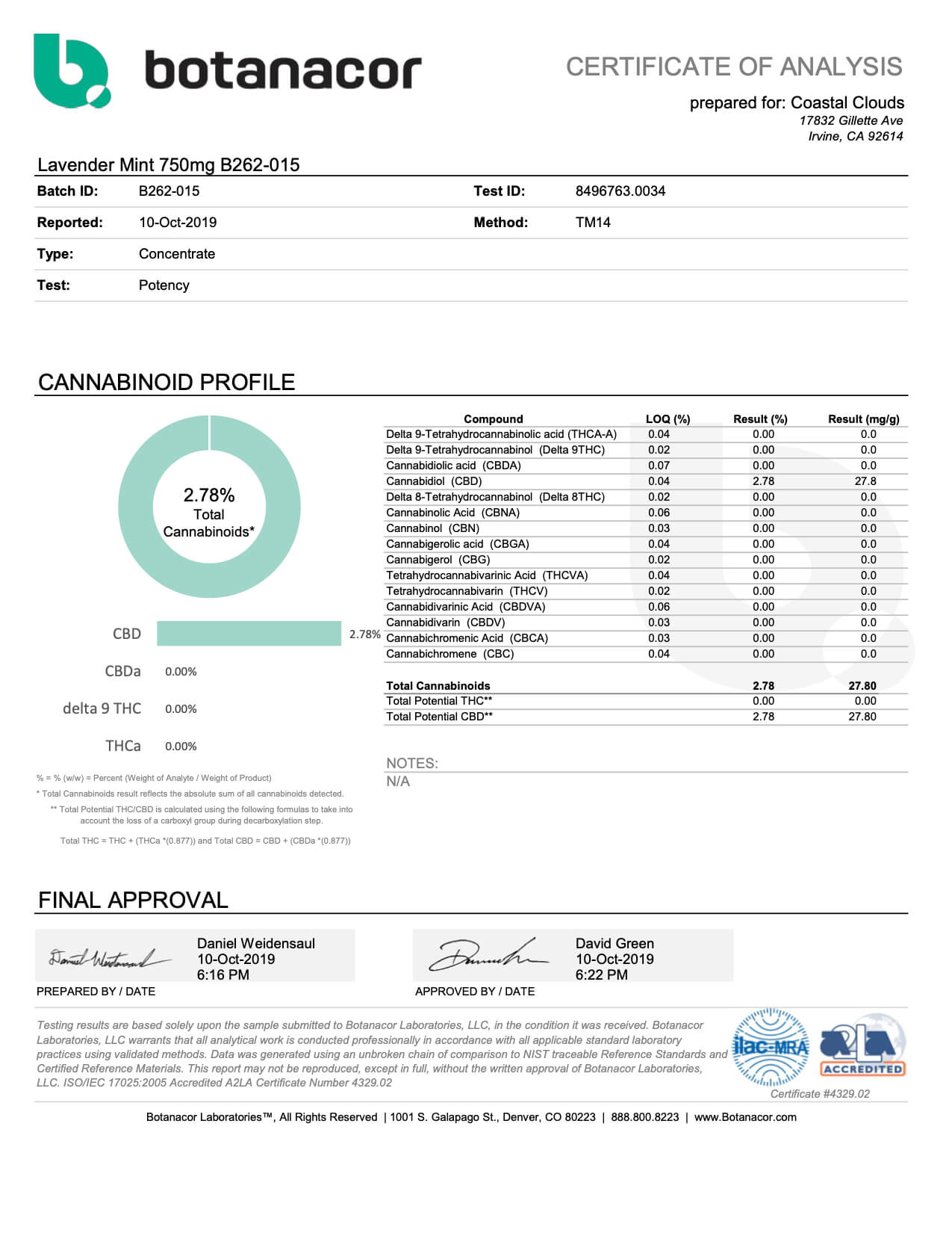 Coastal Clouds CBD Oil Tincture Lavender Mint distinctive lab report delivered as your guide related to vaping products.