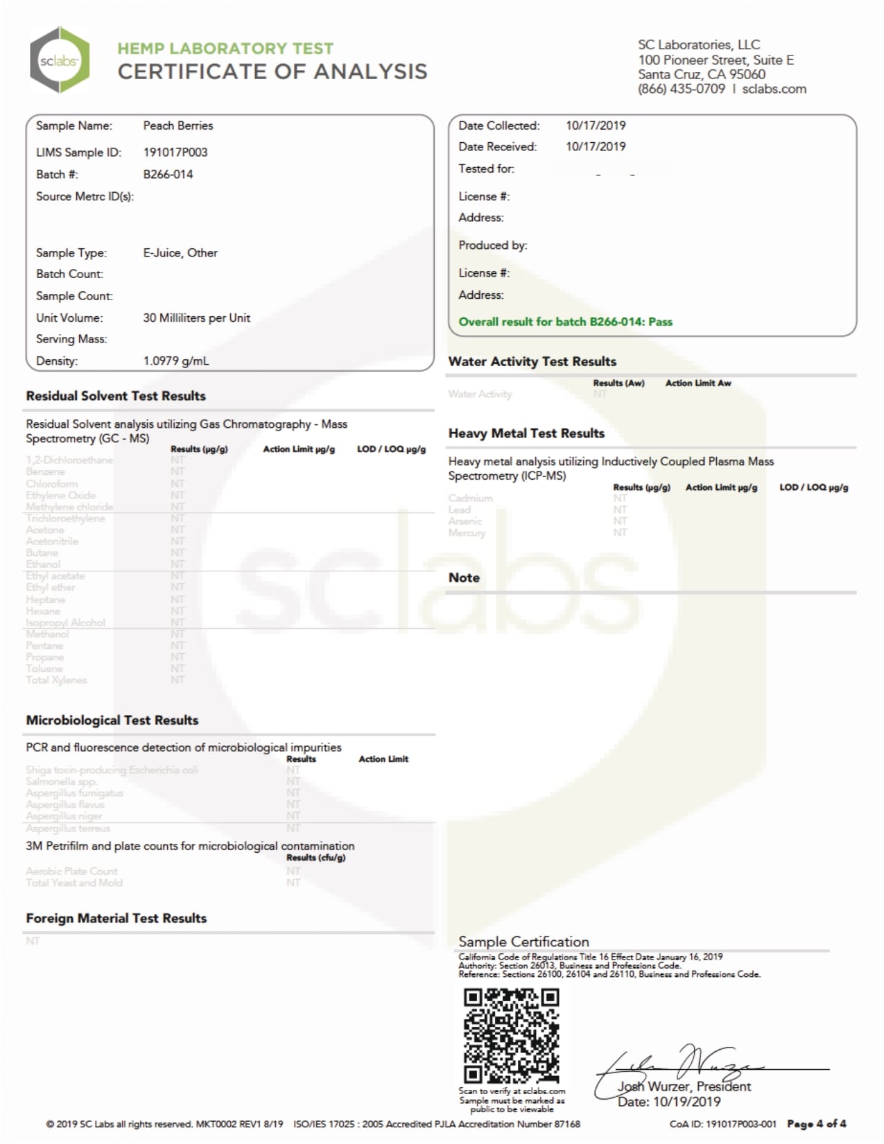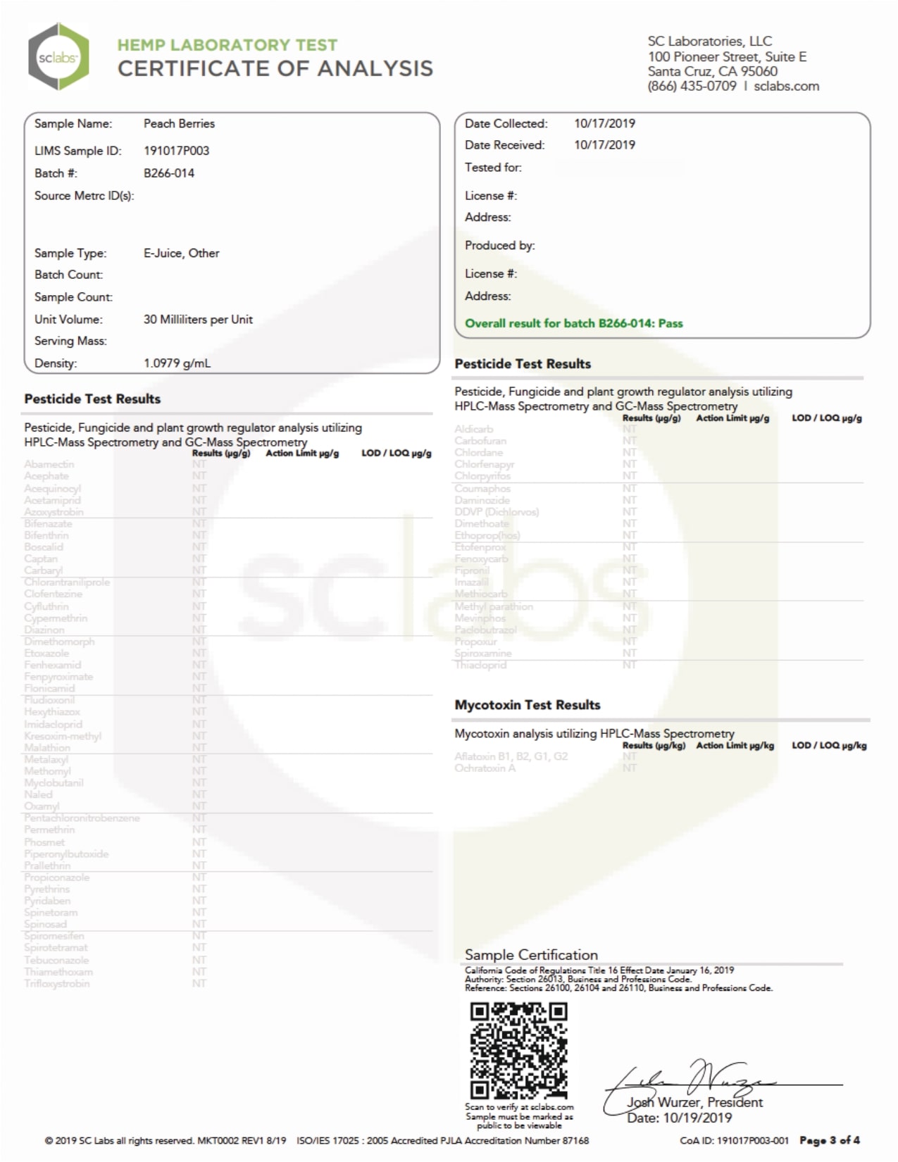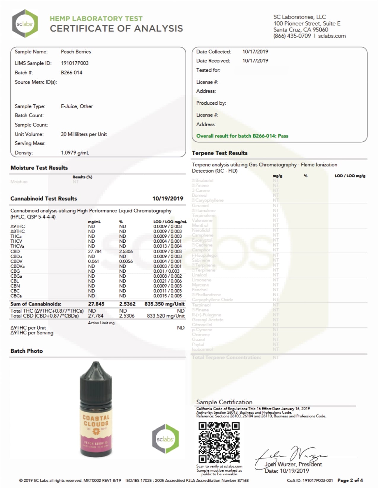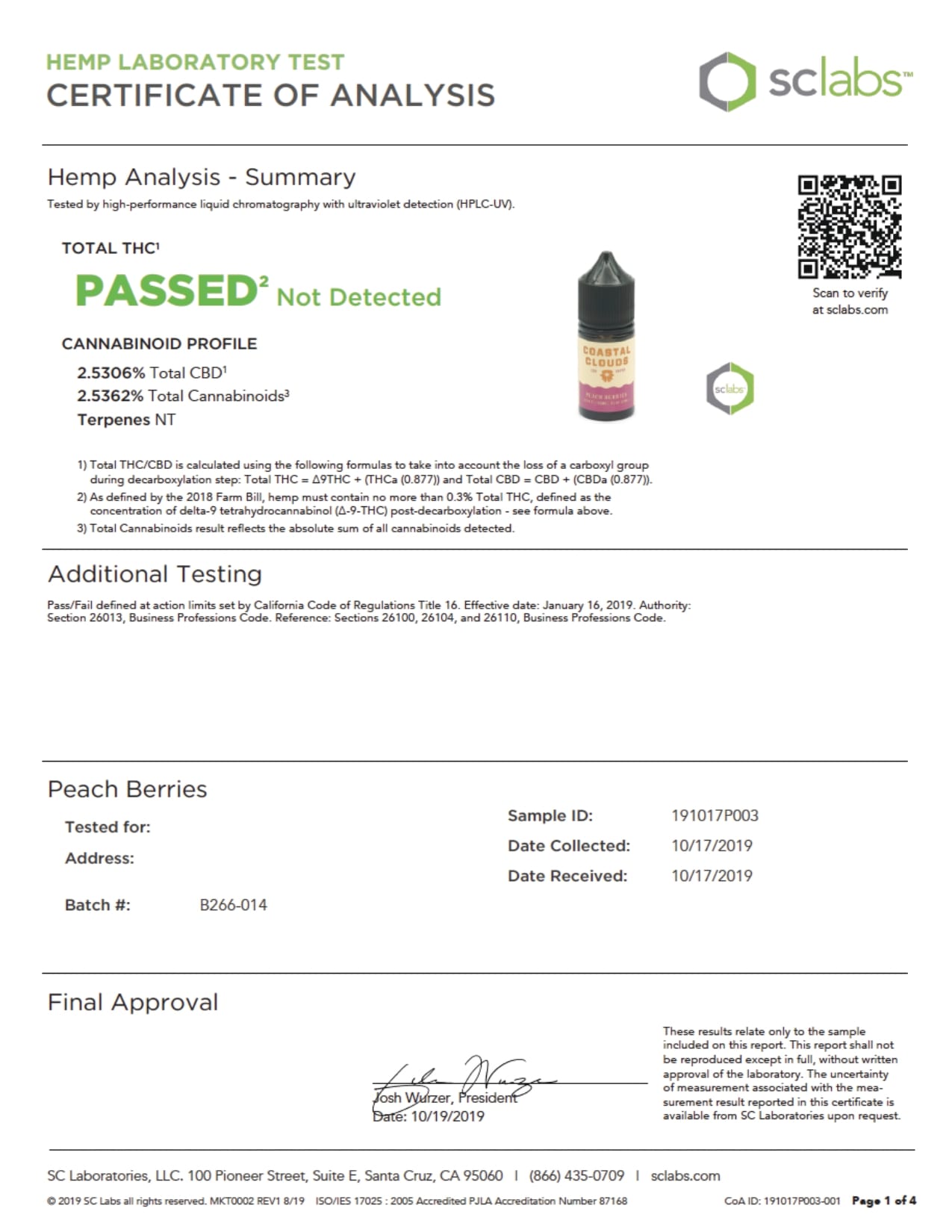 Coastal Clouds CBD Peach Berries Vape Juice Lab Report is provided for your best interest in regards to vaping products.