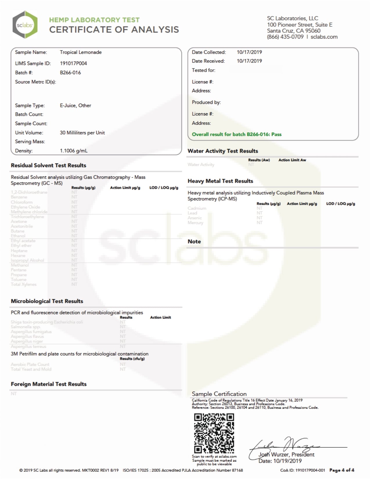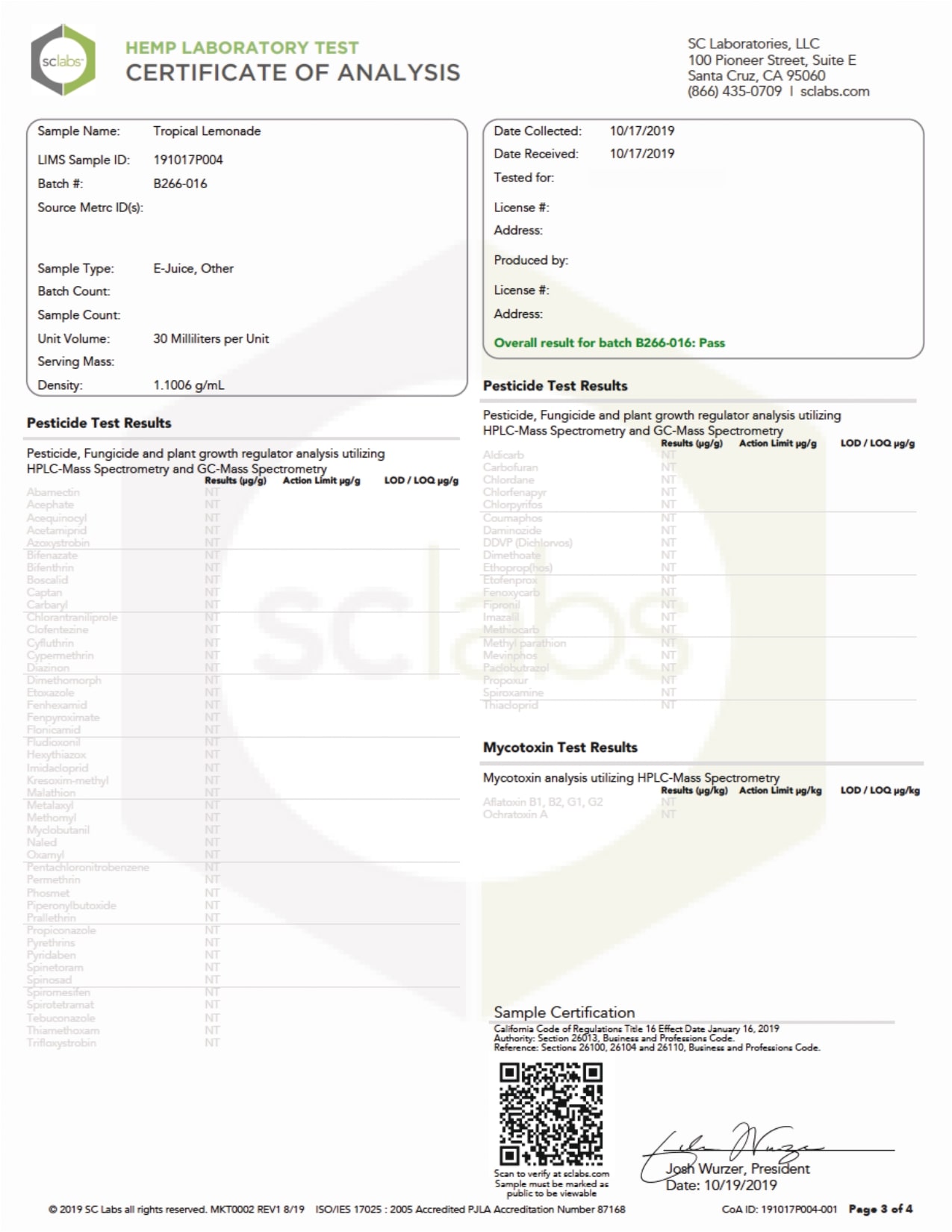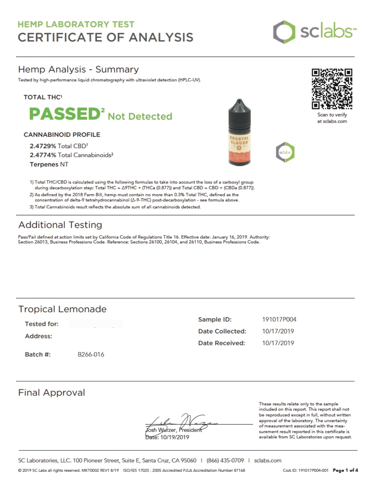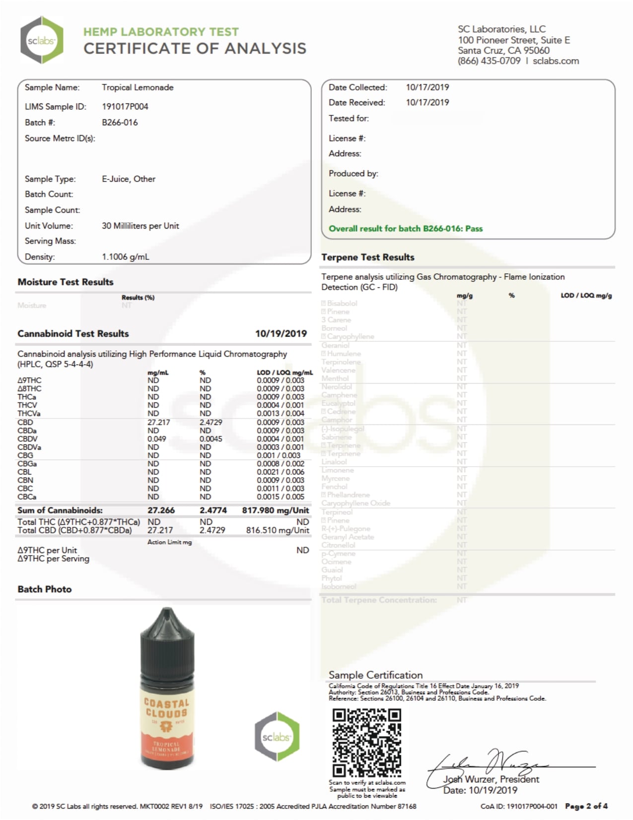 Coastal Clouds CBD Tropical Lemonade Vape Juice Lab Report is provided for your best interest in regards to vaping products.