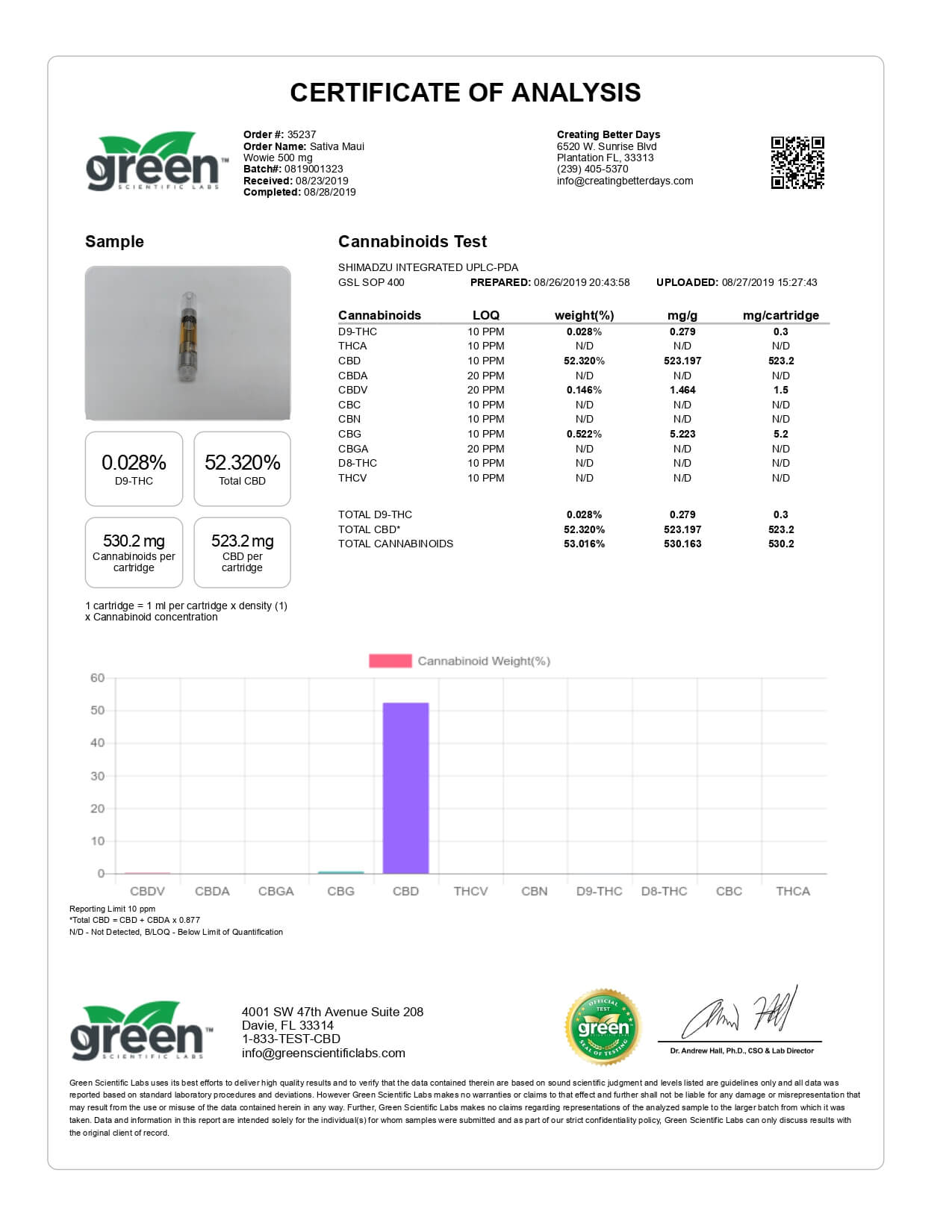 Creating Better Days CBD Cartridge Full Spectrum Maui Wowie Lab Report important details about vaping products.