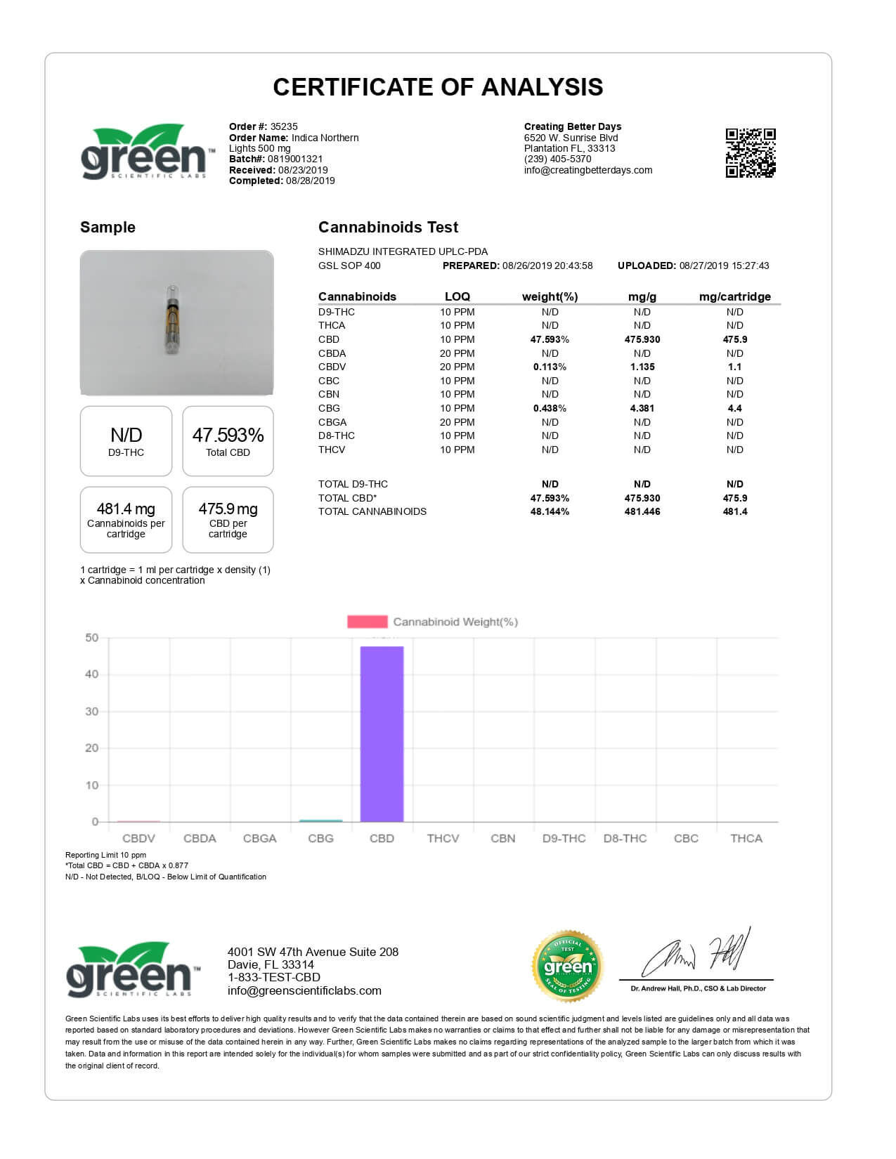 Creating Better Days CBD Cartridge Full Spectrum Northern Lights Lab Report important details about vaping products.