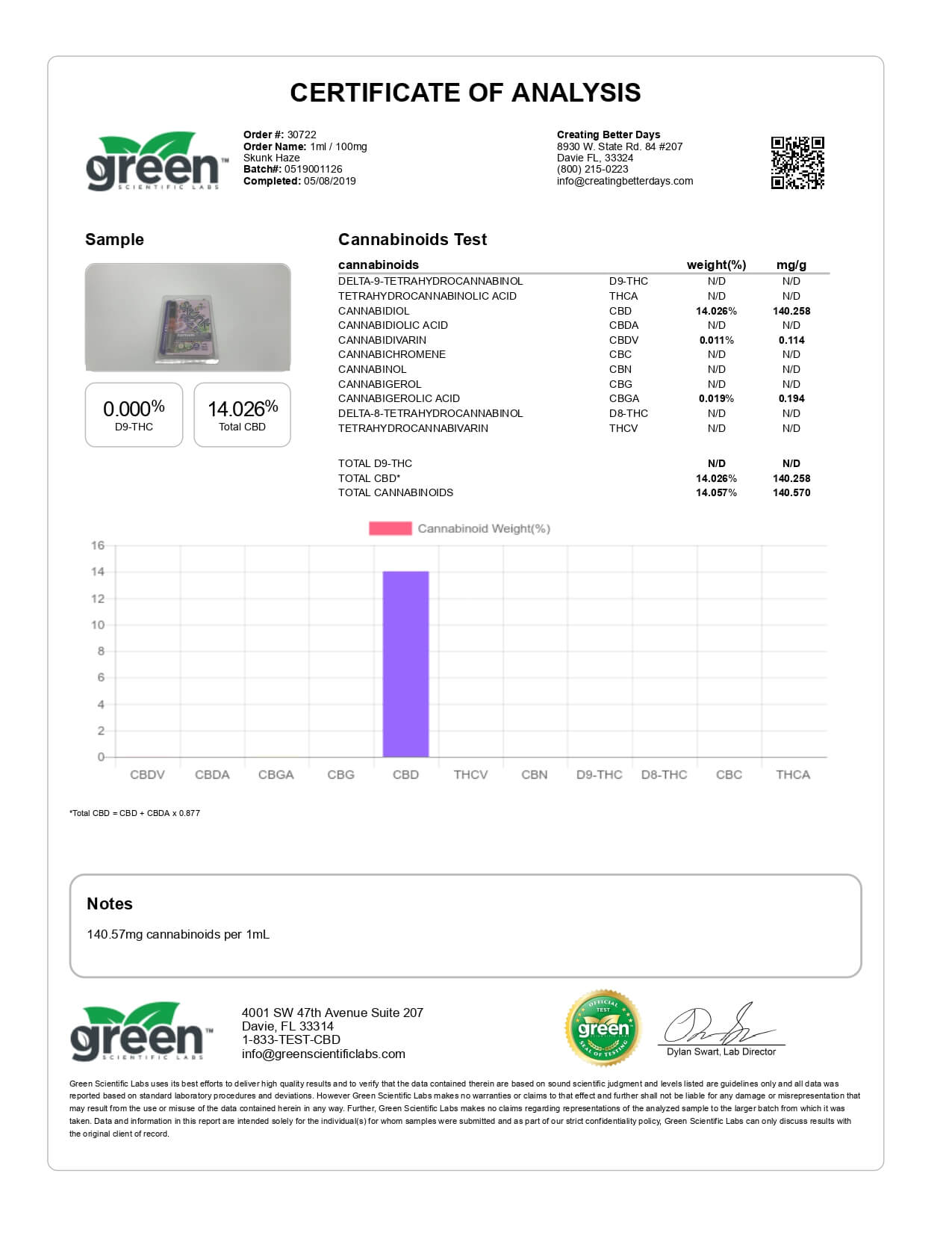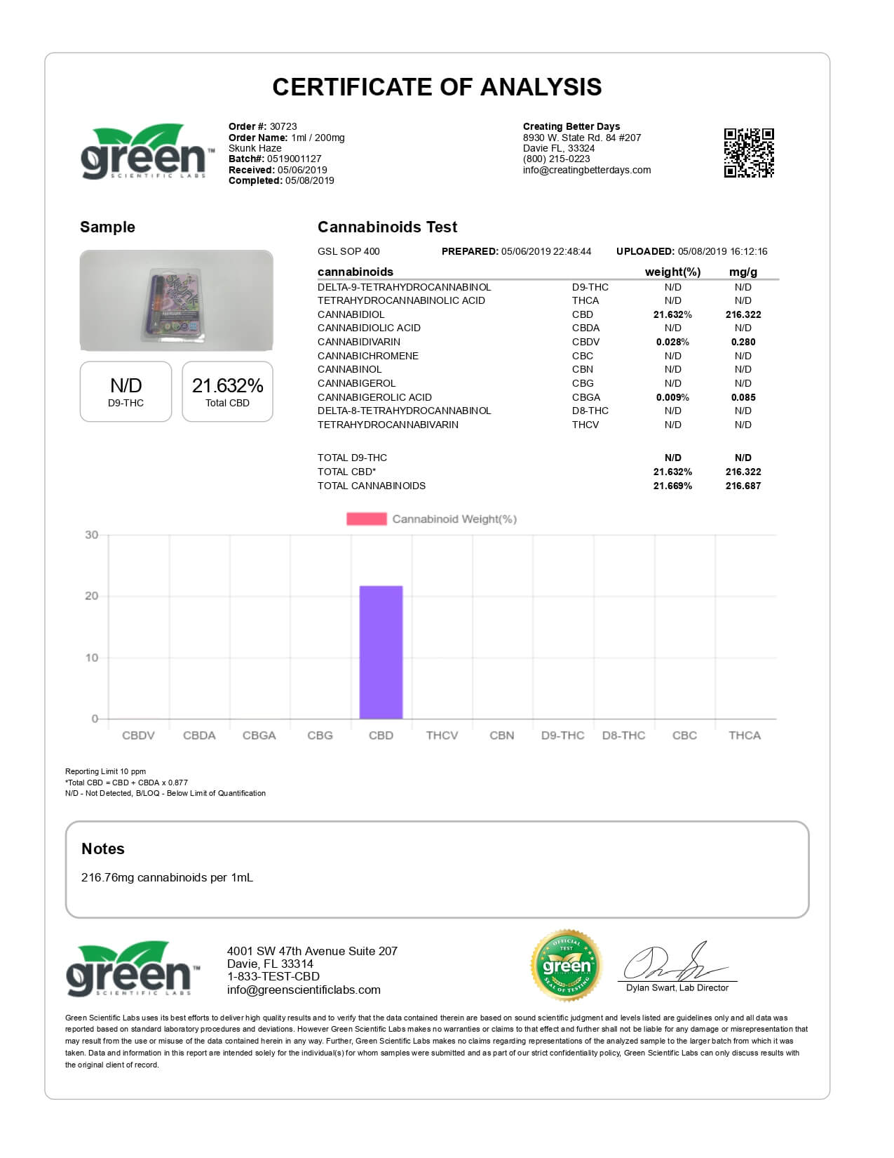 Creating Better Days CBD Cartridge Skunk Haze Lab Report important details about vaping products.