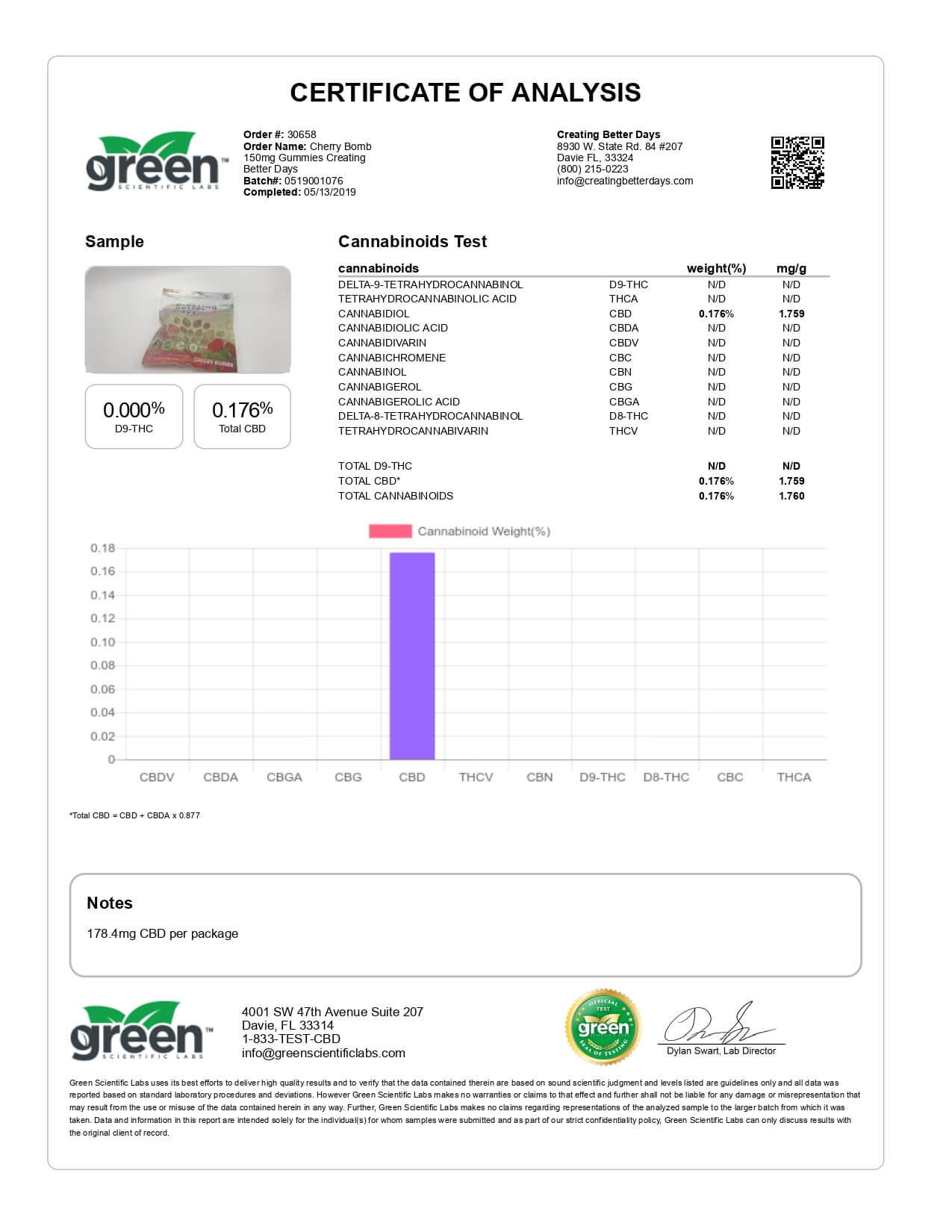 Creating Better Days CBD Edible Cherry Bombs Gummies Lab Report important details about vaping products.