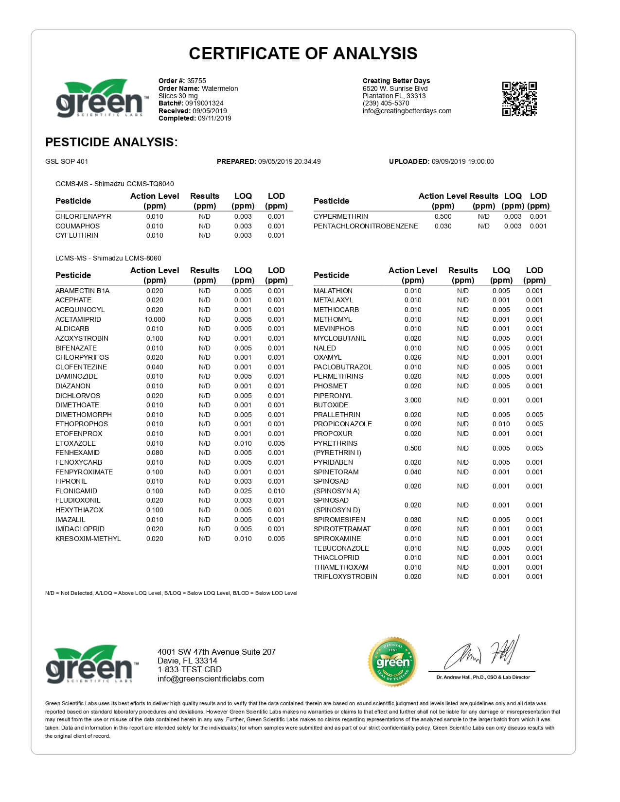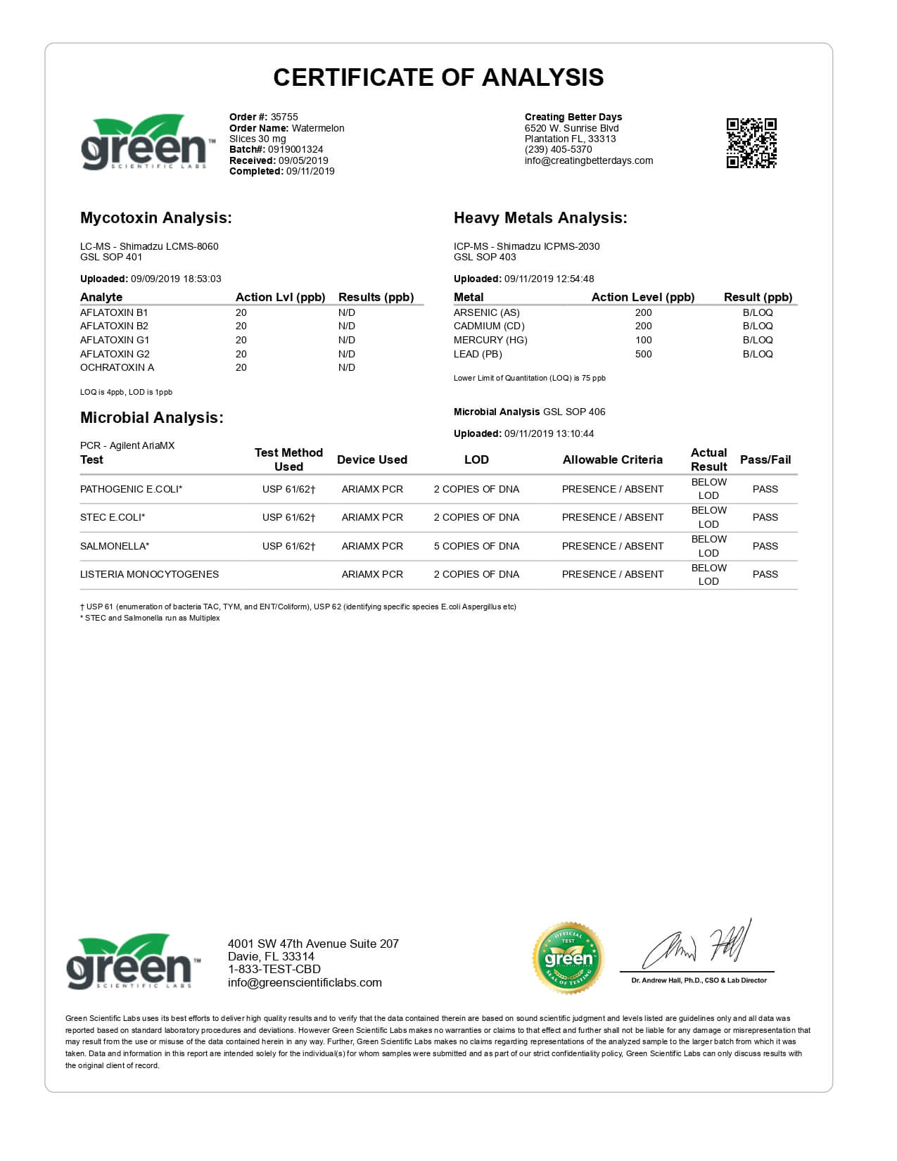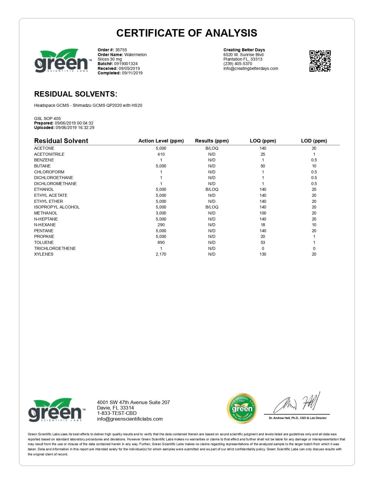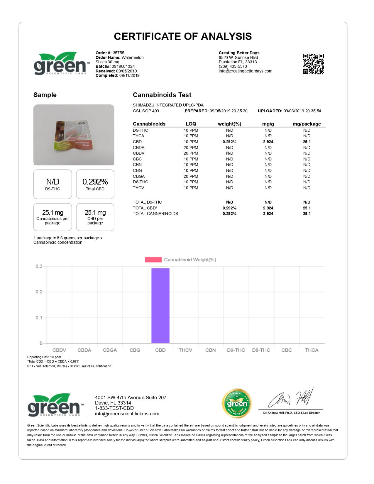 Creating Better Days CBD Edible Go! Nano-CBD Watermelon Slices Lab Report important details about vaping products.