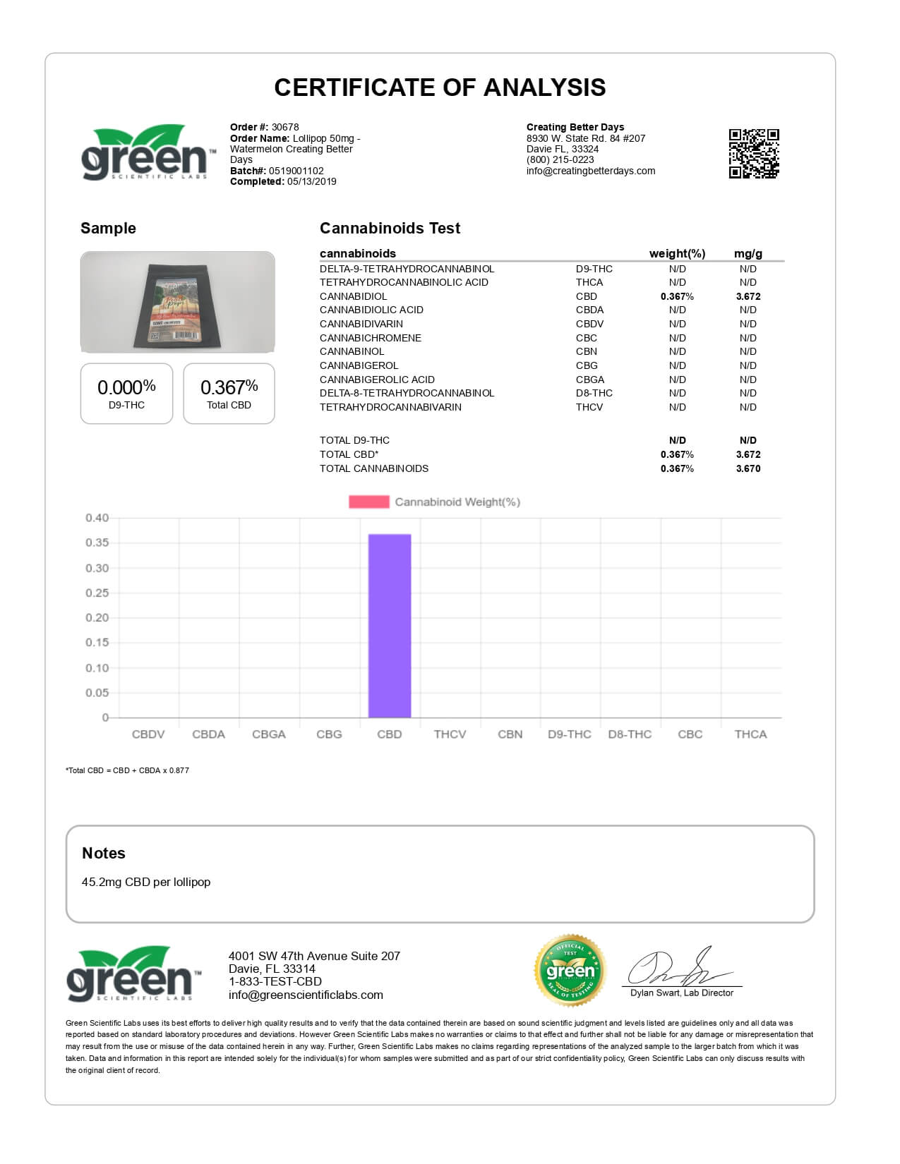Creating Better Days CBD Edible Peace Pops Mellow Watermelon Lab Report important details about vaping products.