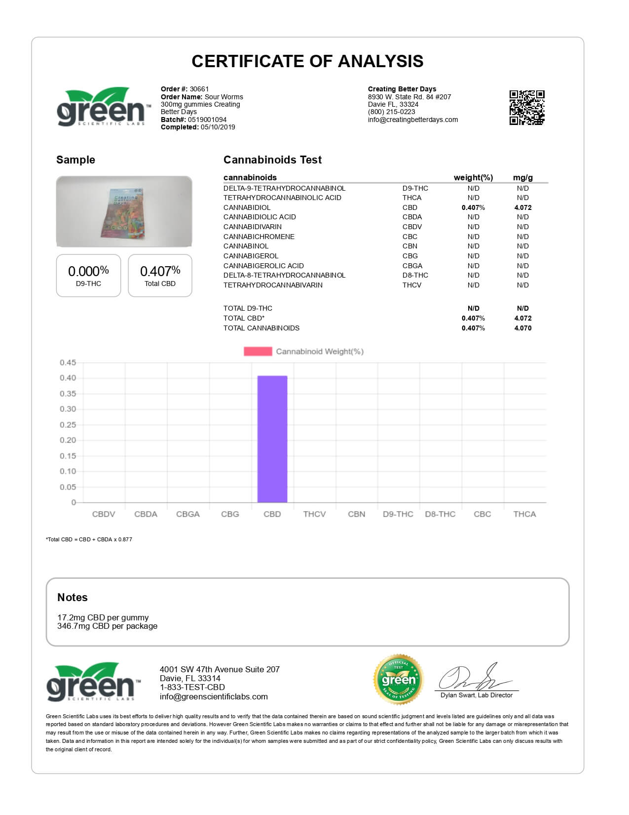 Creating Better Days CBD Edible Sour Worms Gummies Lab Report important details about vaping products.