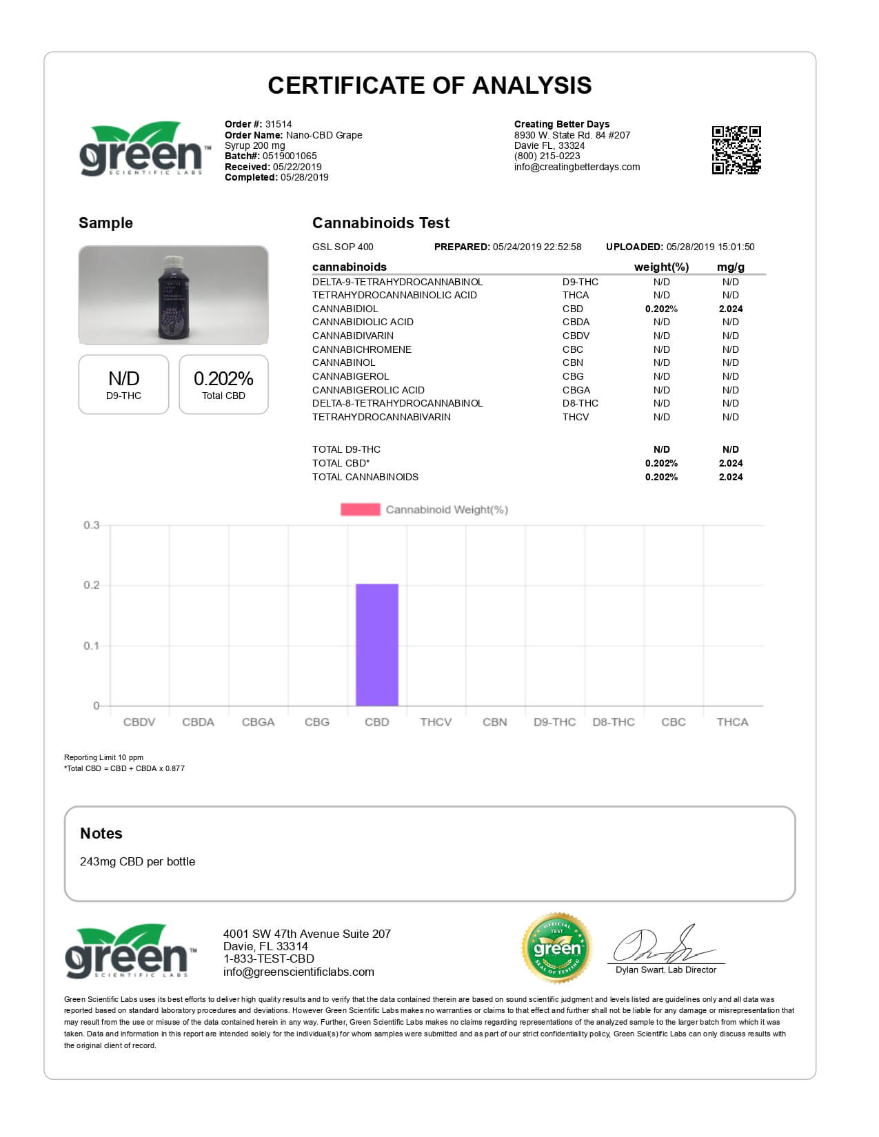 Creating Better Days CBD Melatonin Syrup Grape Lab Report important details about vaping products.