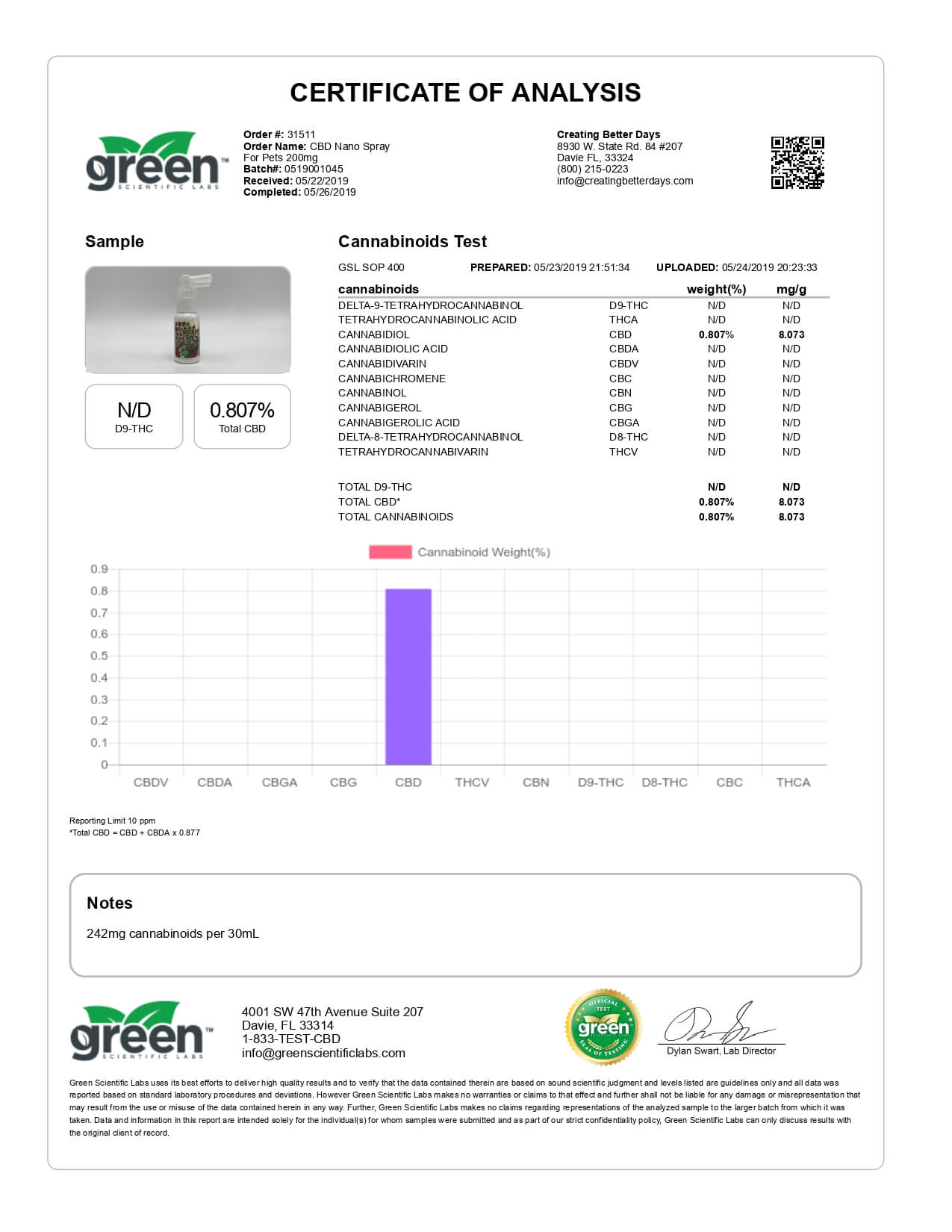 Creating Better Days CBD Pet Spray Mist Spray Lab Report