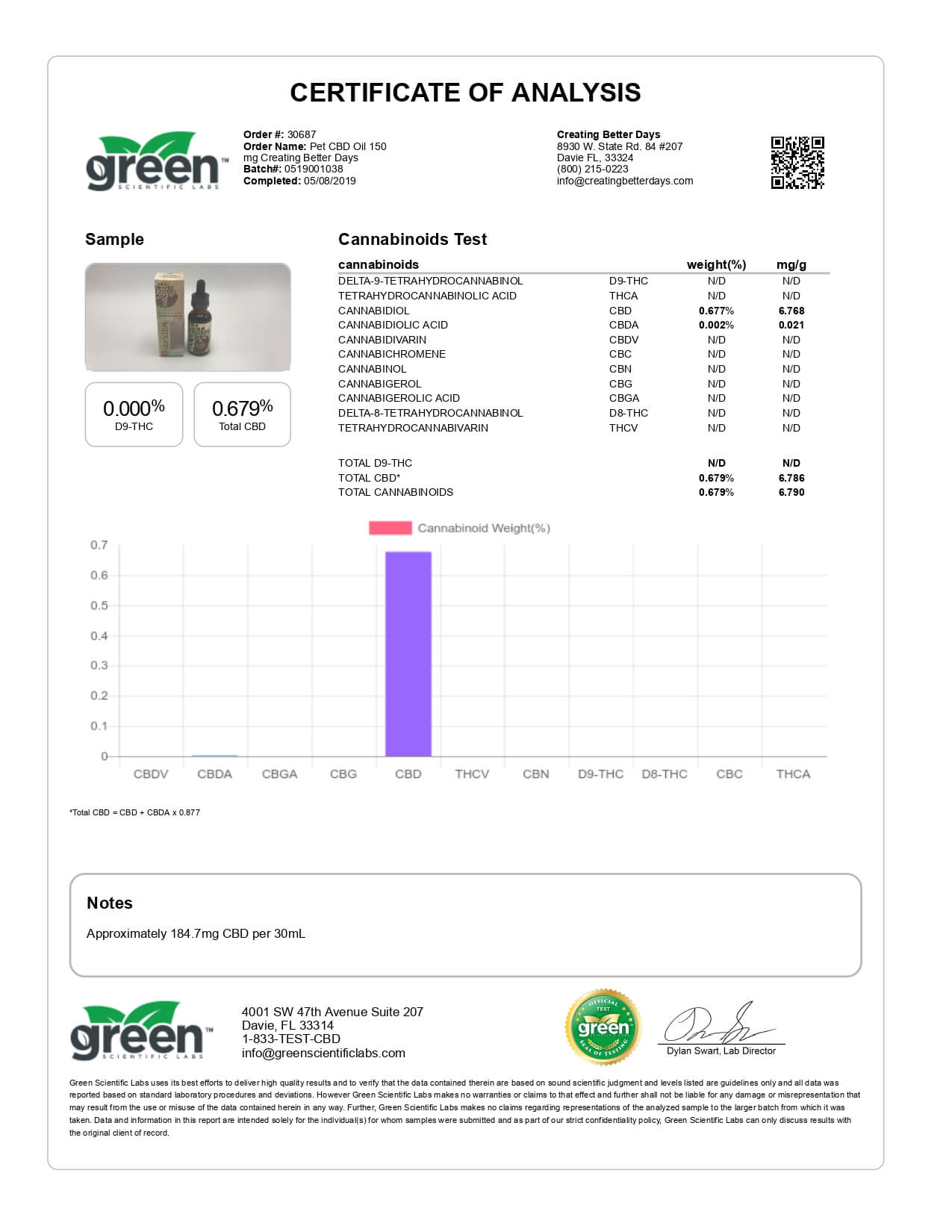 Creating Better Days CBD Pet Tincture 150mg Lab Report
