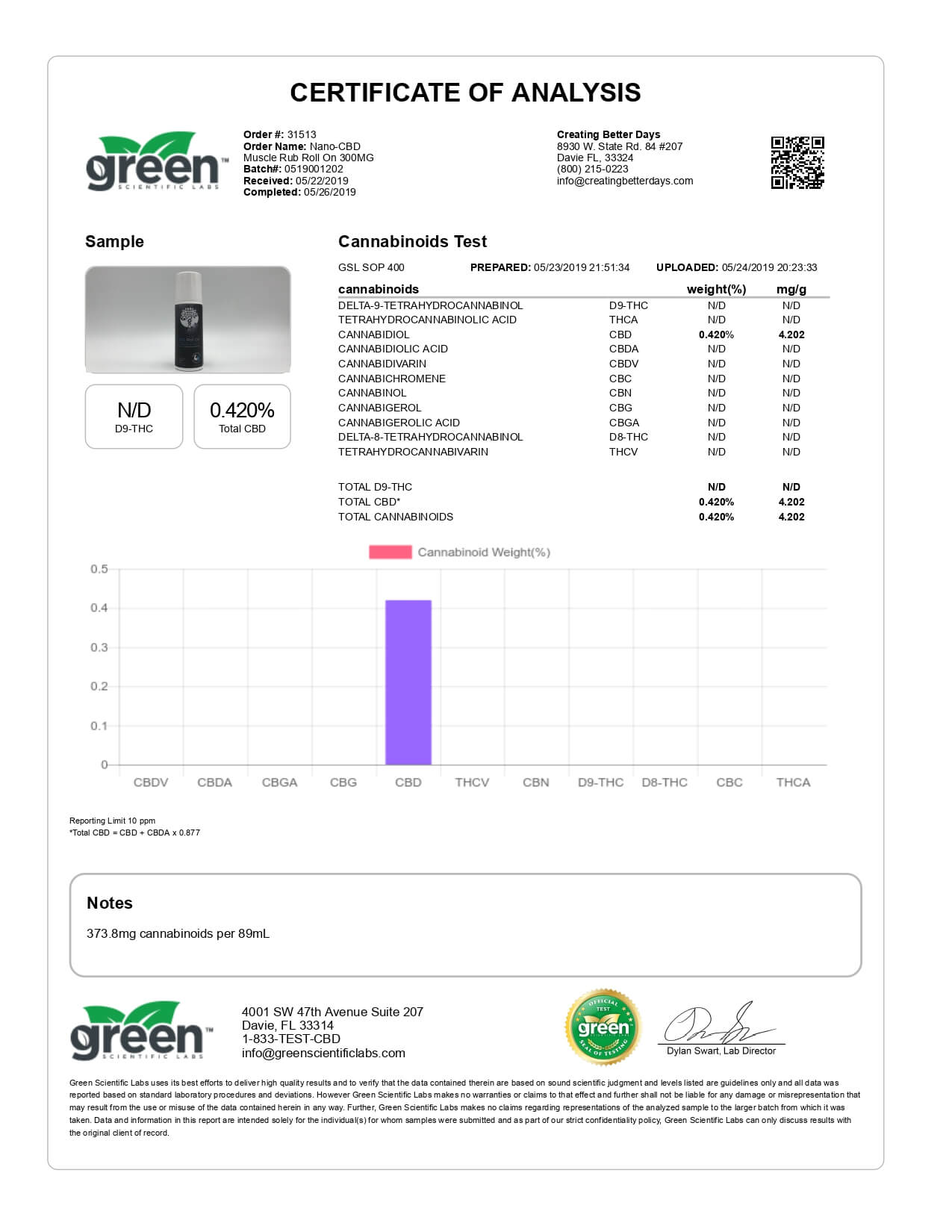 Creating Better Days CBD Topical Muscle Rub Roll-On Lab Report important details about vaping products.