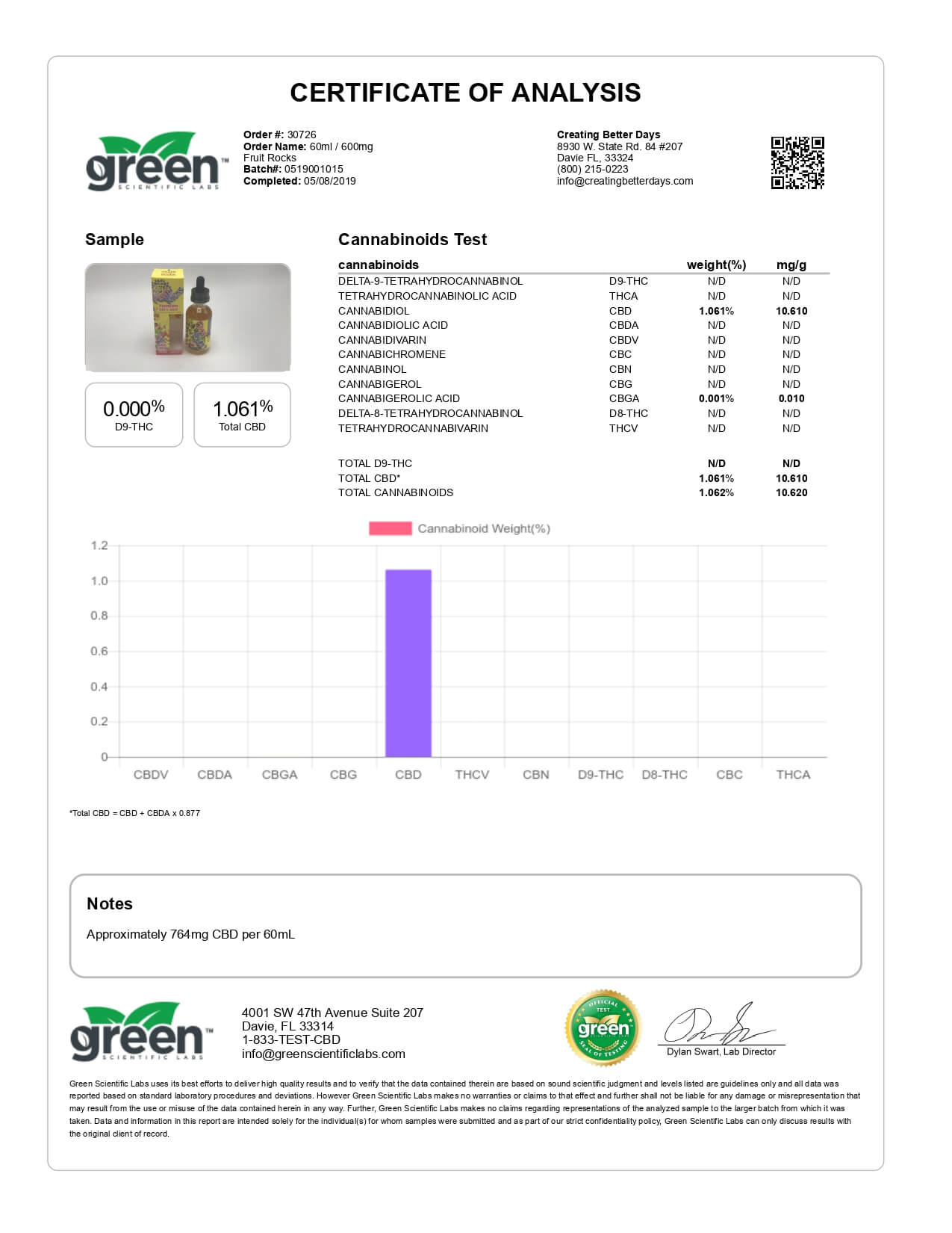 Creating Better Days CBD Vape Fruit Rocks Lab Report important details about vaping products.