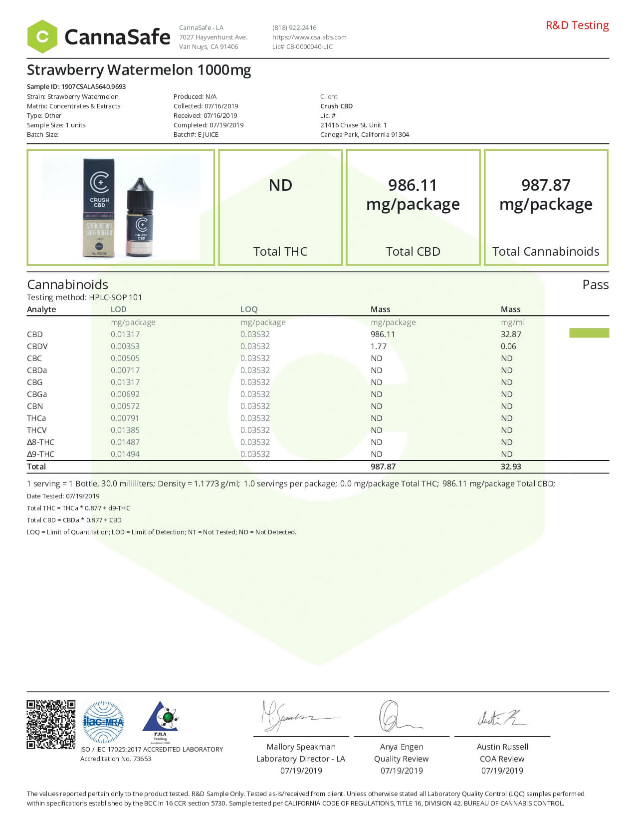 Crush CBD Vape Juice Strawberry Watermelon Lab Report