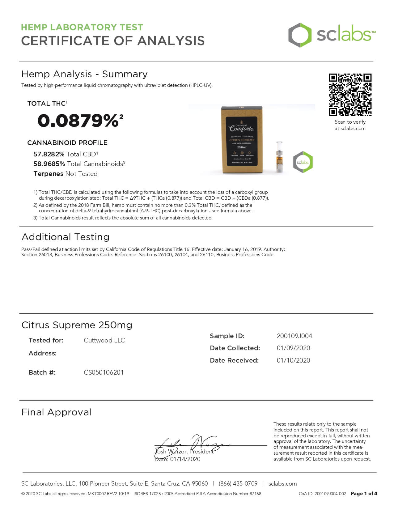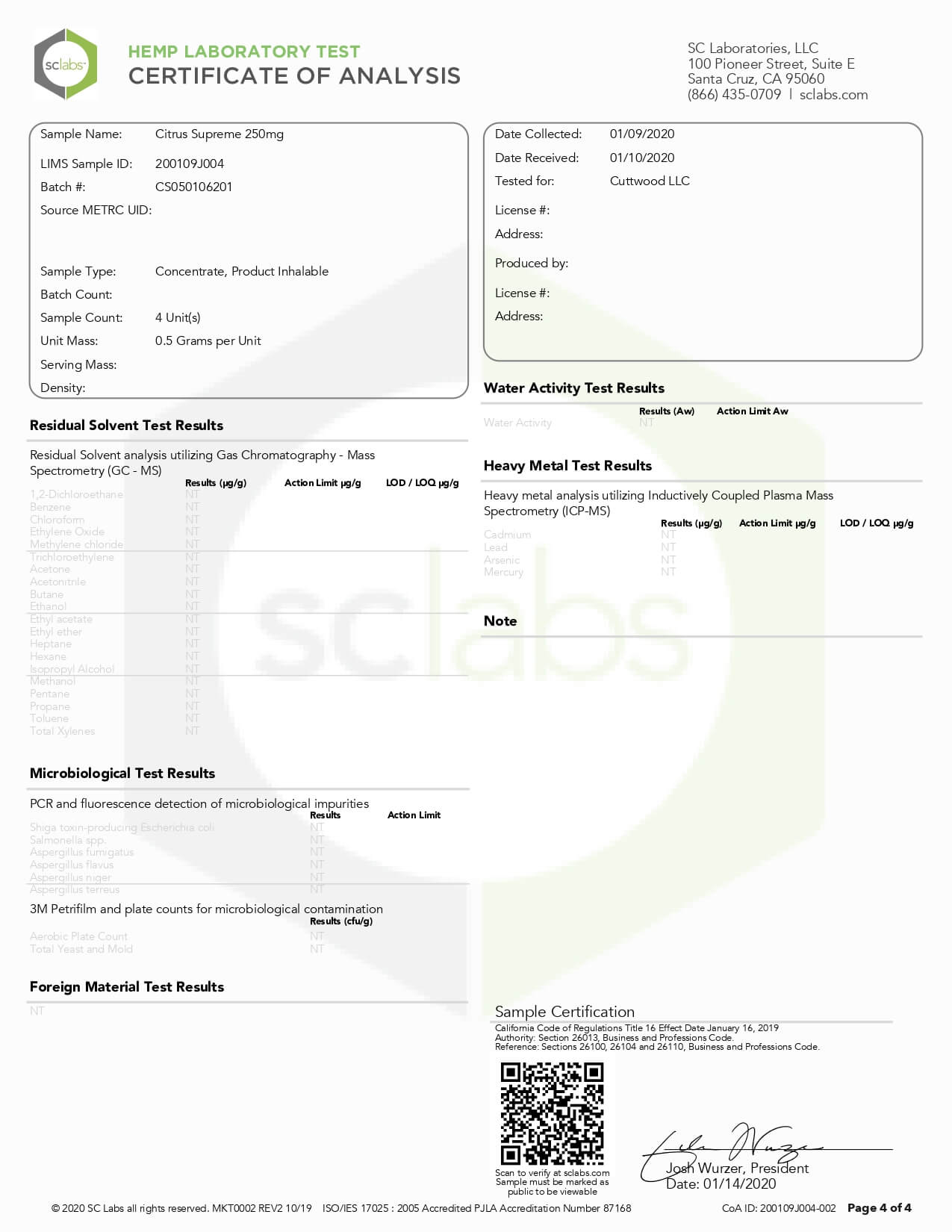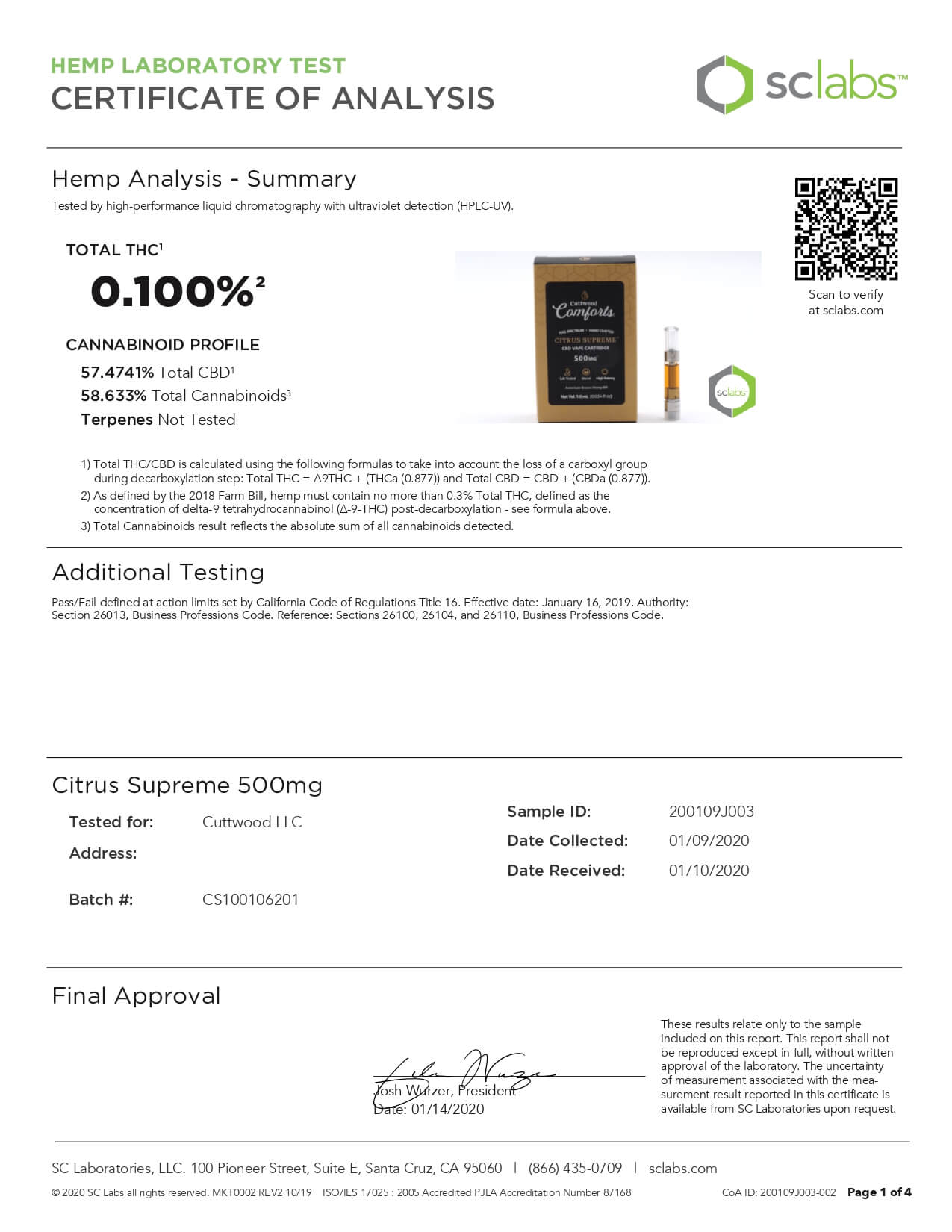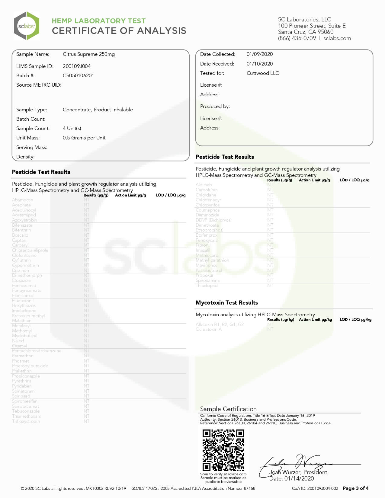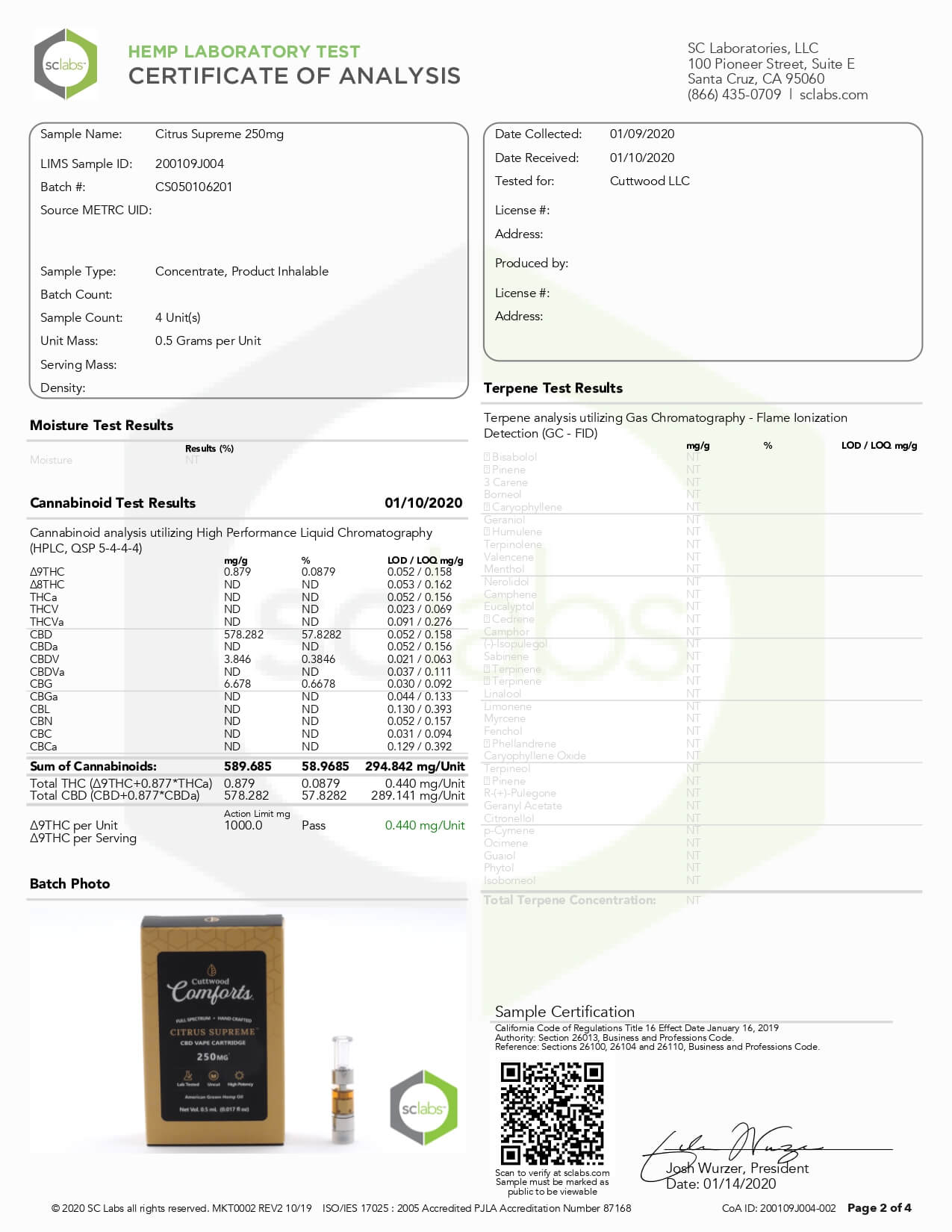 Cuttwood Comforts CBD Vape Cartridge Full Spectrum Citrus Supreme Lab Report important details about vaping products.