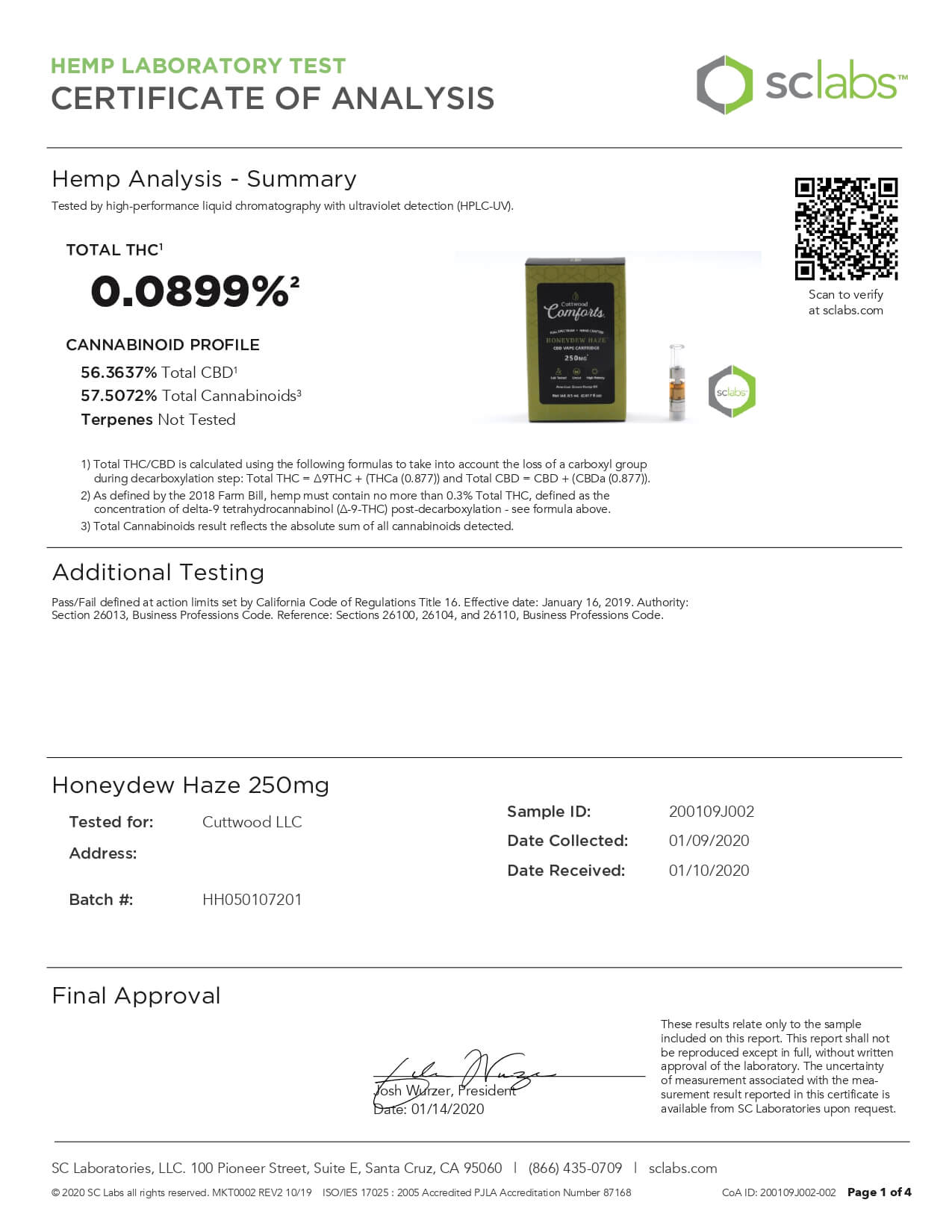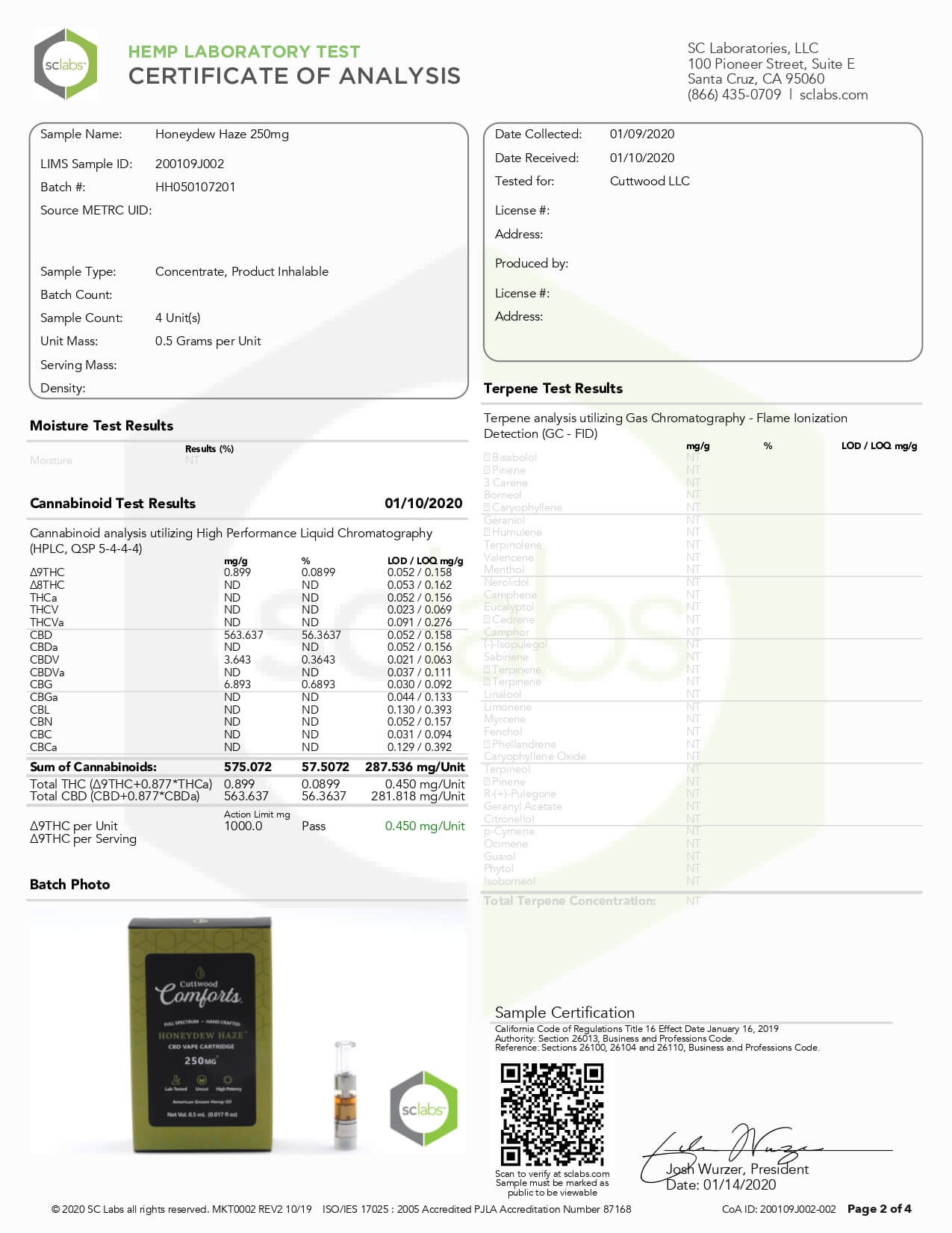 Cuttwood Comforts CBD Vape Cartridge Full Spectrum Honeydew Haze Lab Report important details about vaping products.