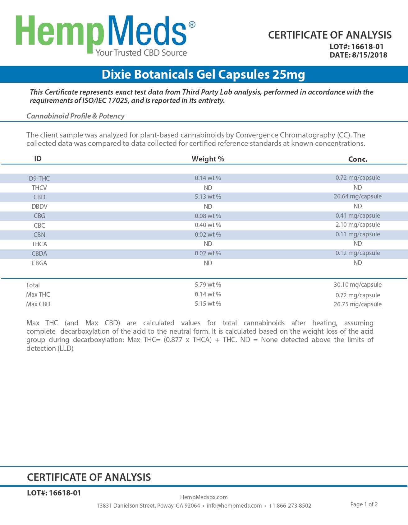 Dixie Botanicals CBD Gel Capsules Lab Report