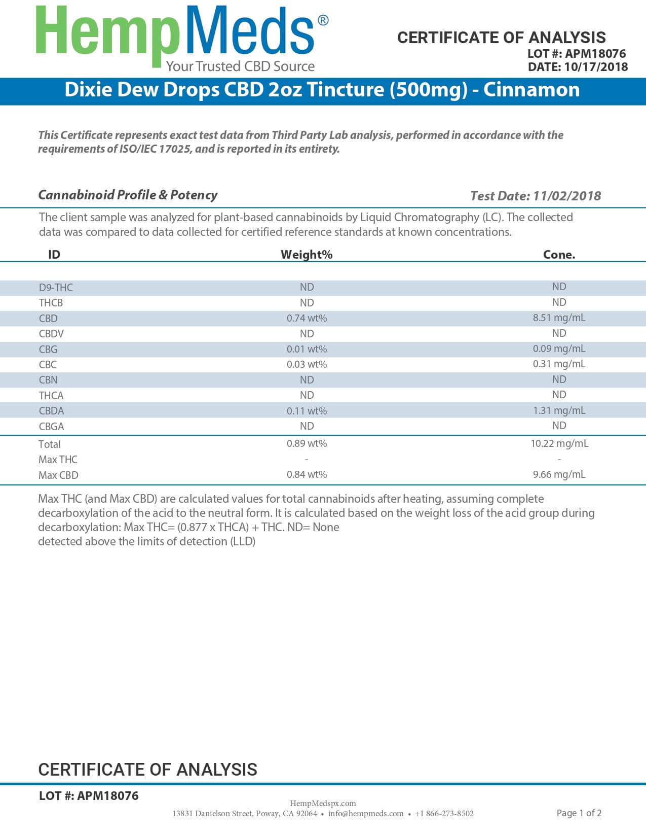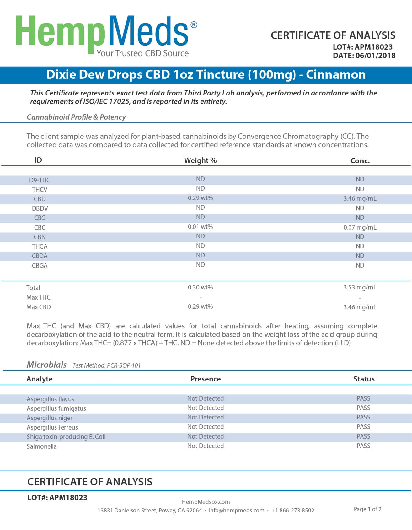 Dixie Botanicals CBD Tincture Cinnamon Lab Report