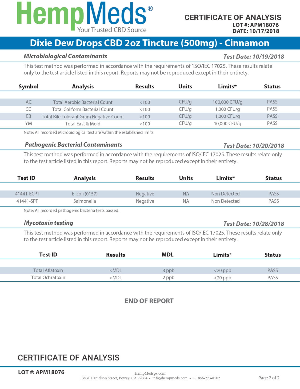 Dixie Botanicals CBD Tincture Cinnamon 2oz Dew Drops 500mg Lab Report