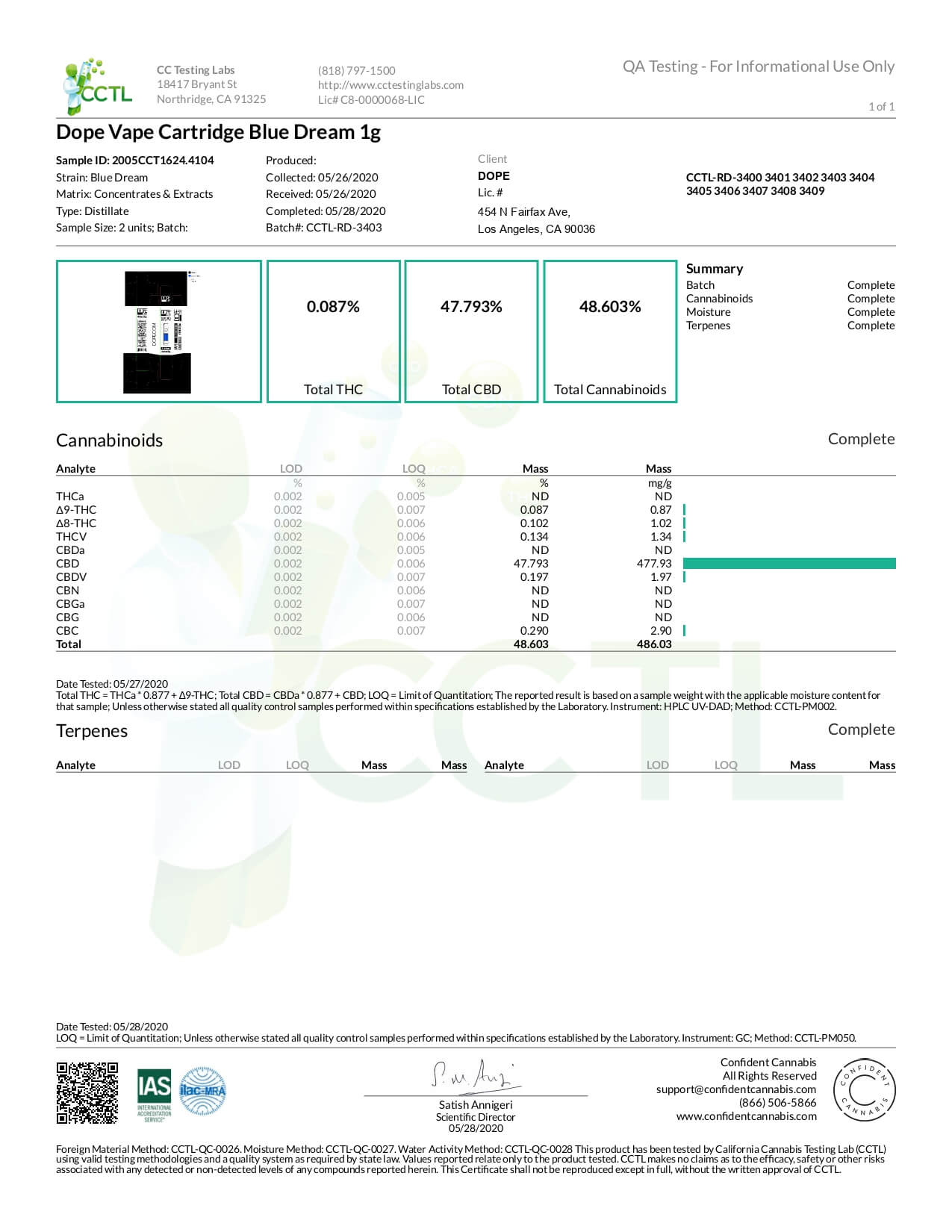 Dope CBD Cartridge Blue Dream Lab Report important details about vaping products.