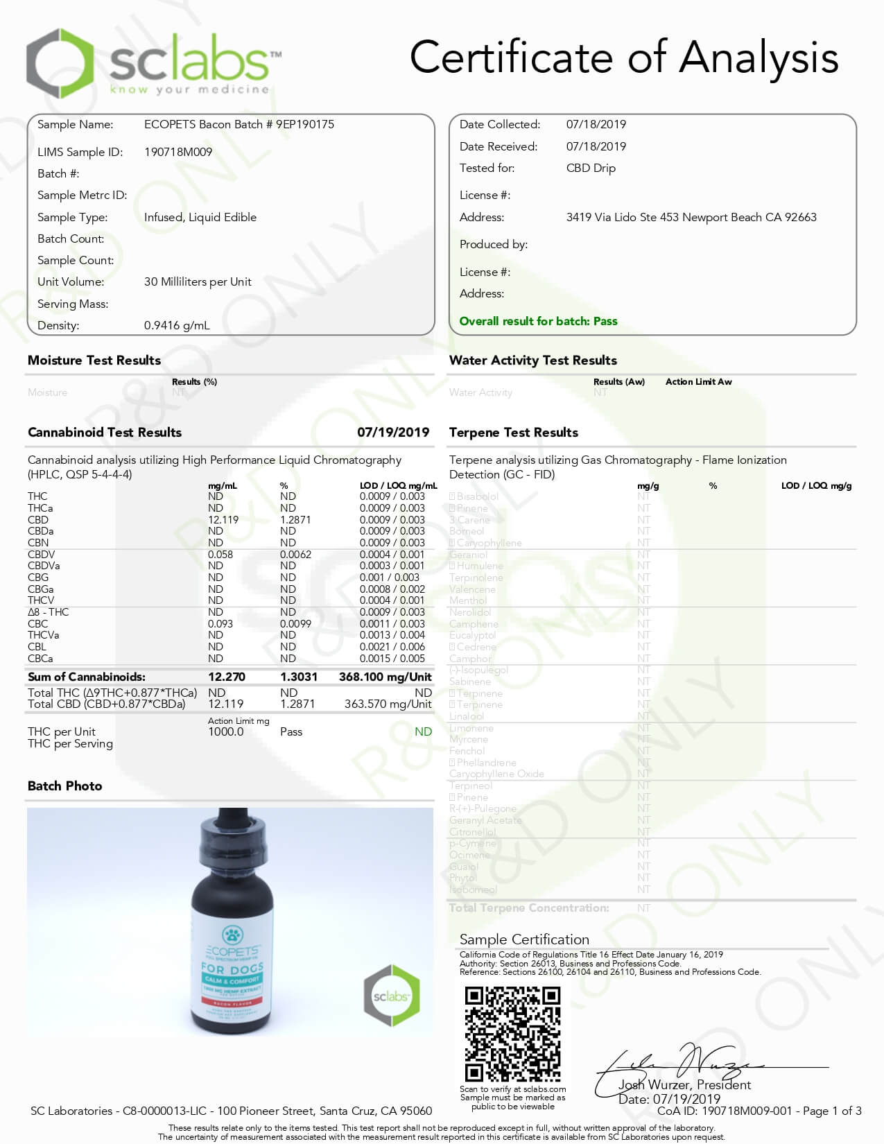 Eco Sciences CBD Pet Tincture ECOPETS Bacon Lab Report important details about vaping products.