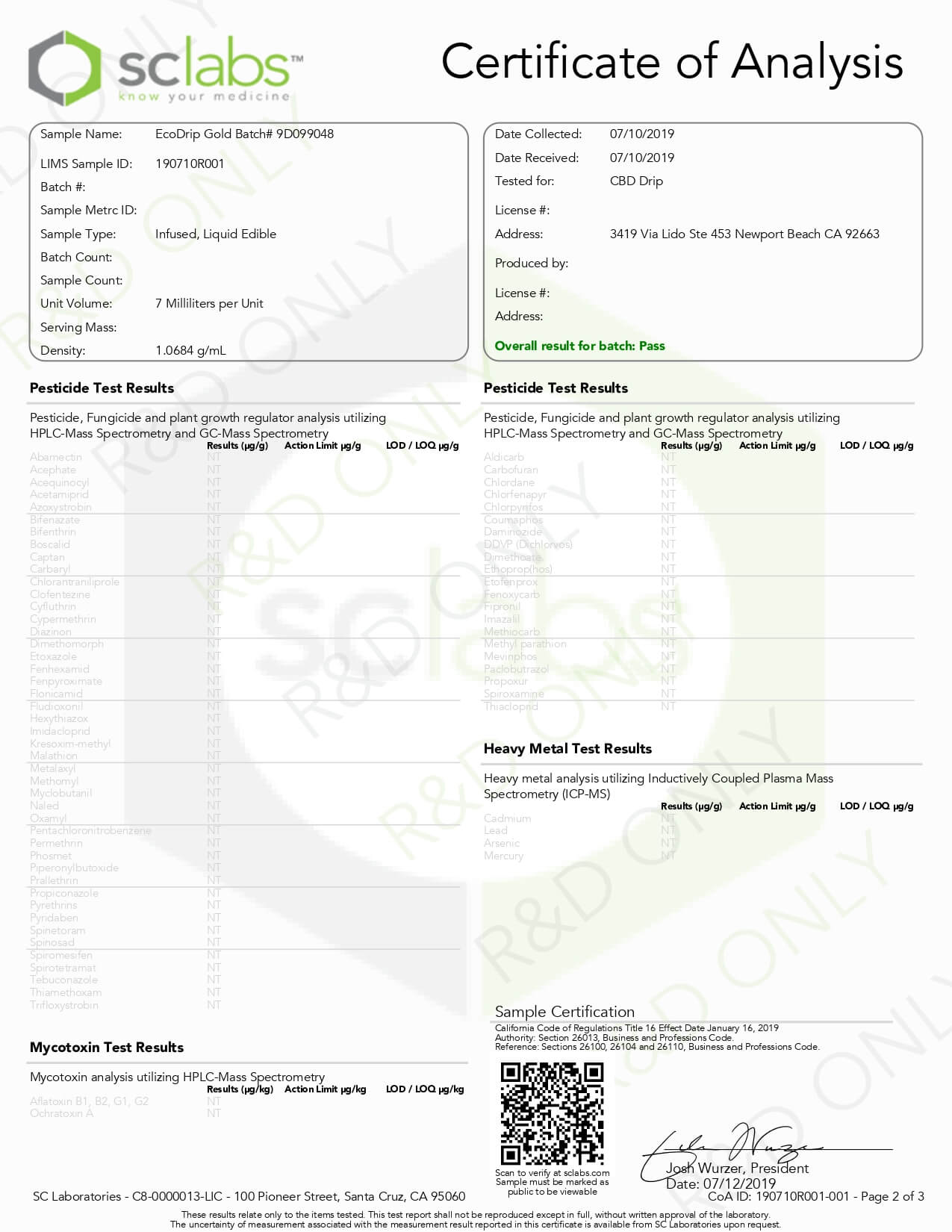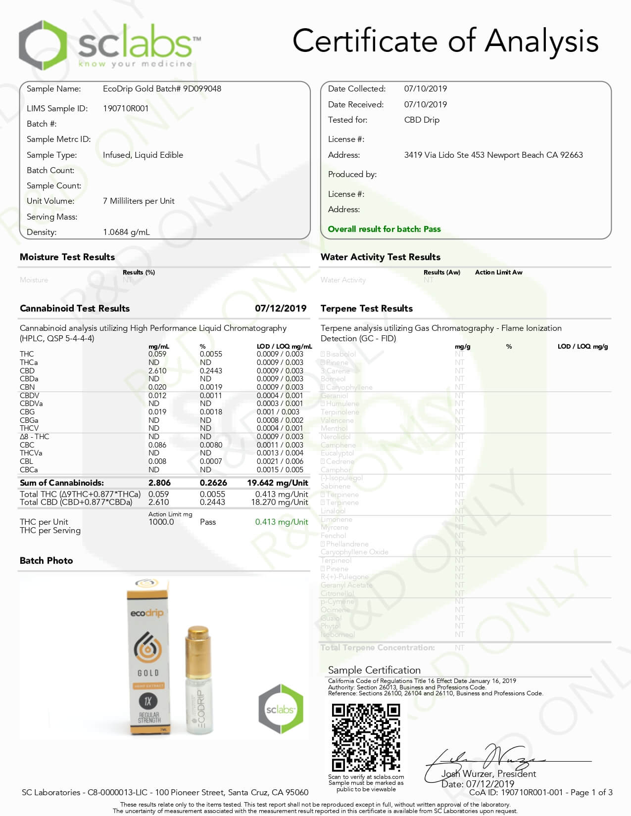 Eco Sciences CBD Tincture Additive ECODRIP Gold Lab Report important details about vaping products.