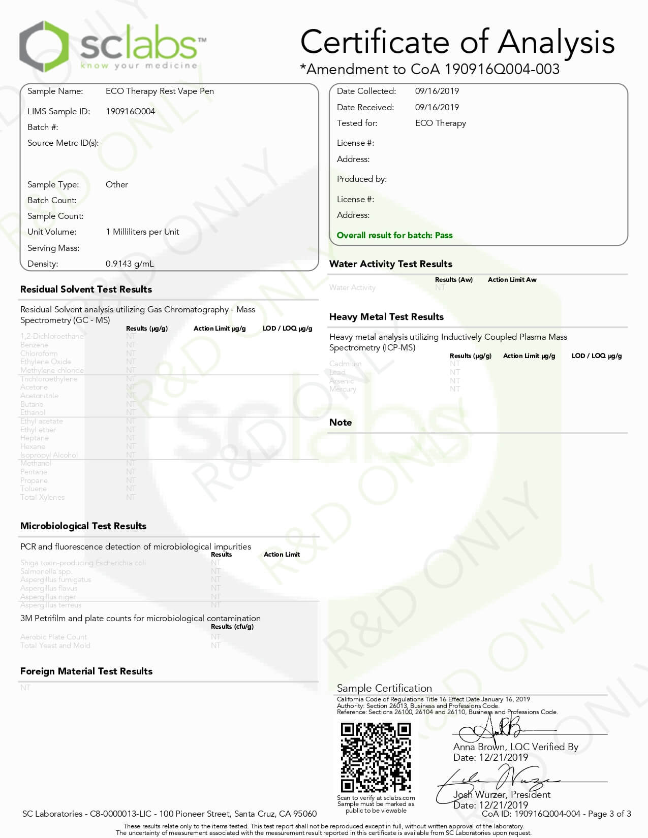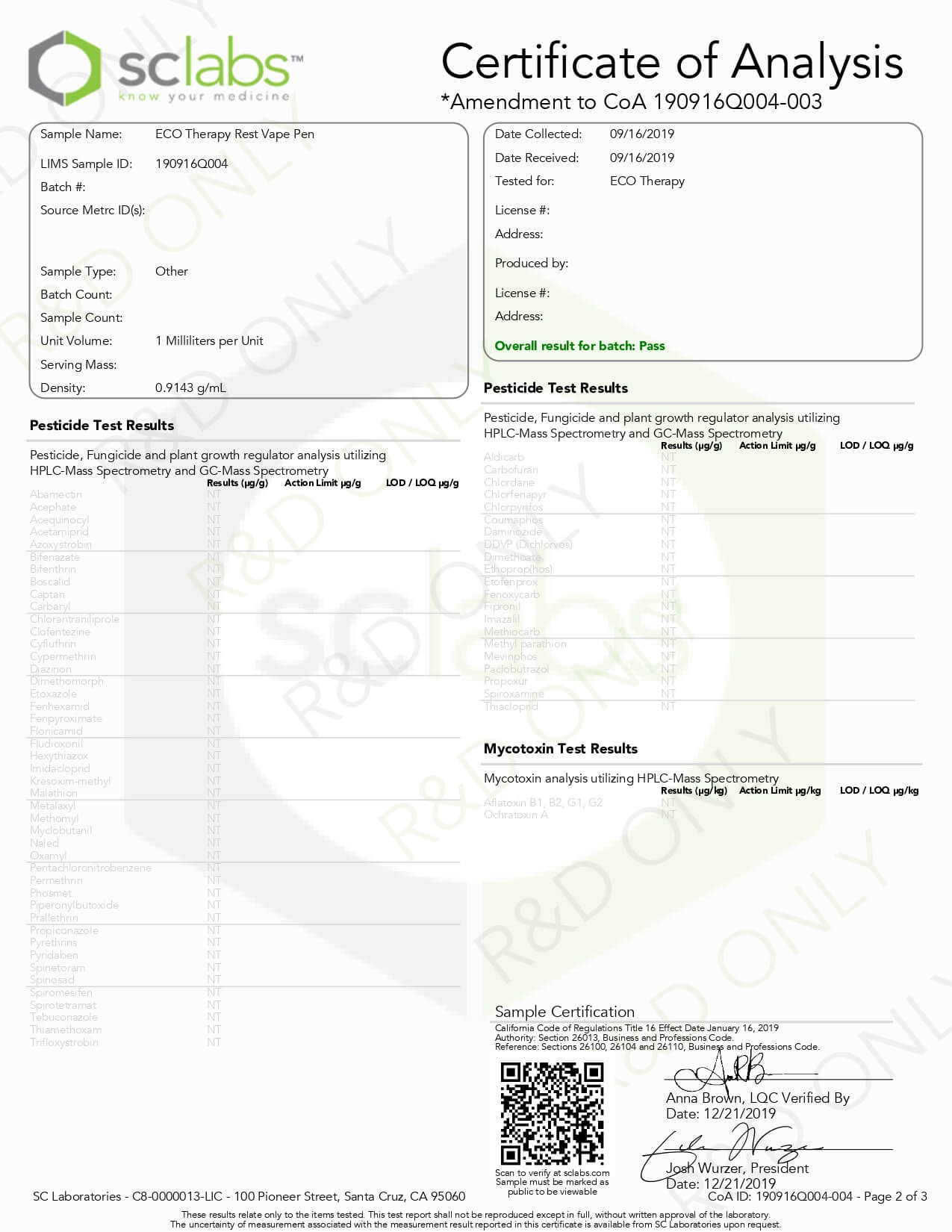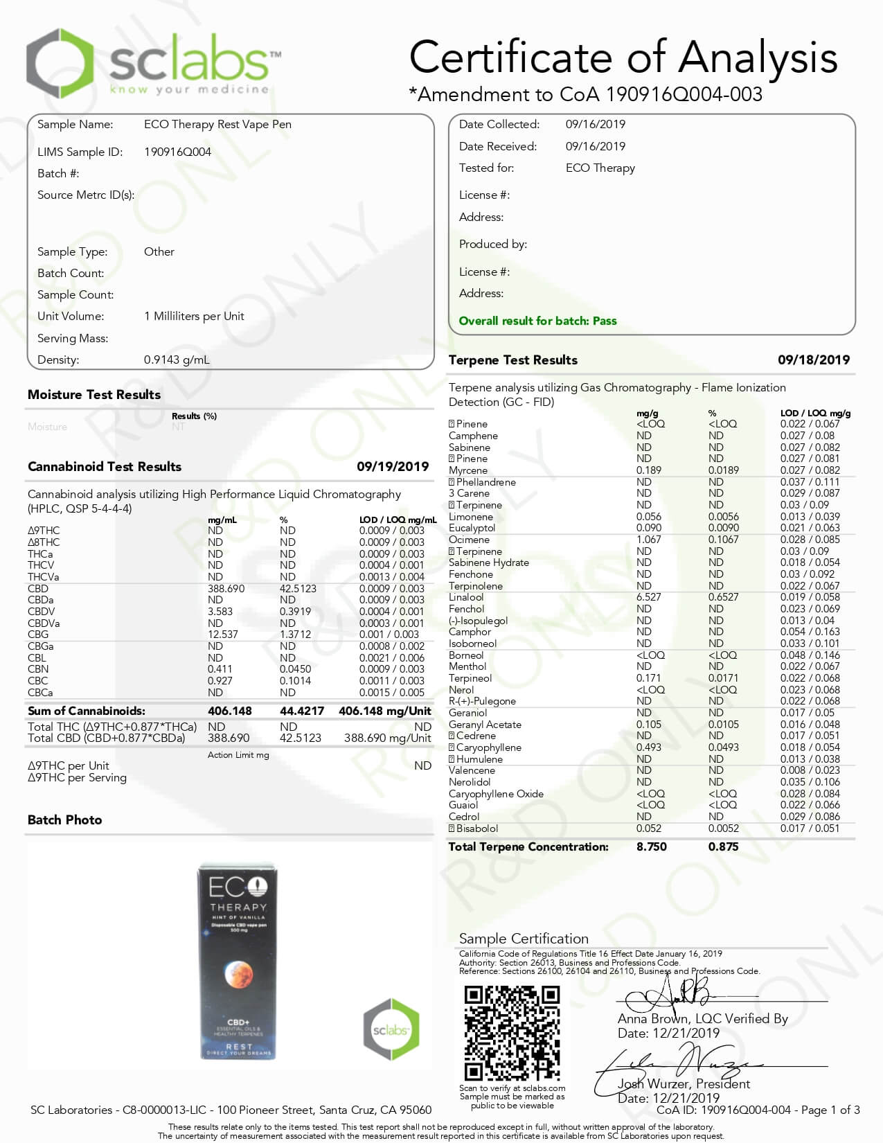 ECO Therapy CBD Vape Rest Disposable Pen Lab Report
