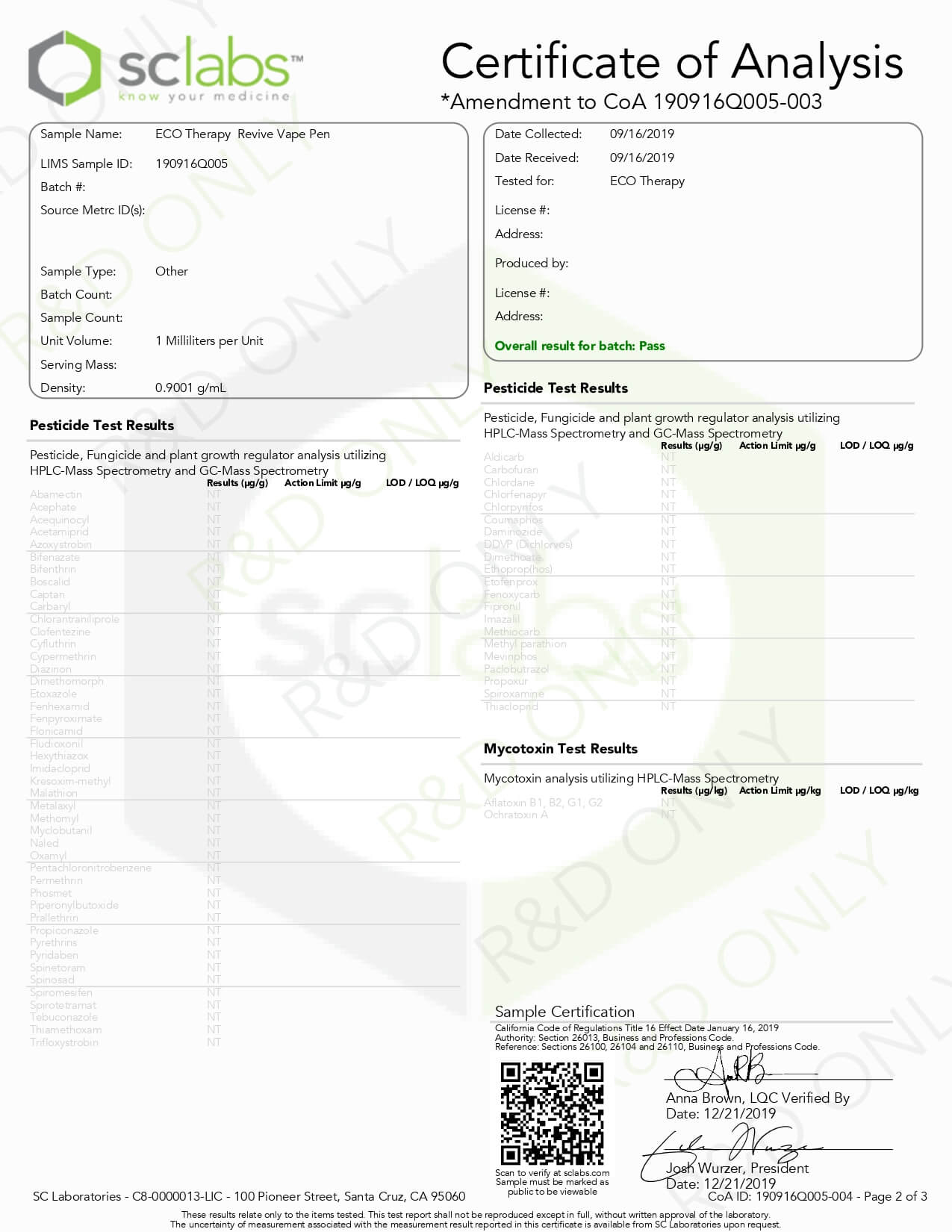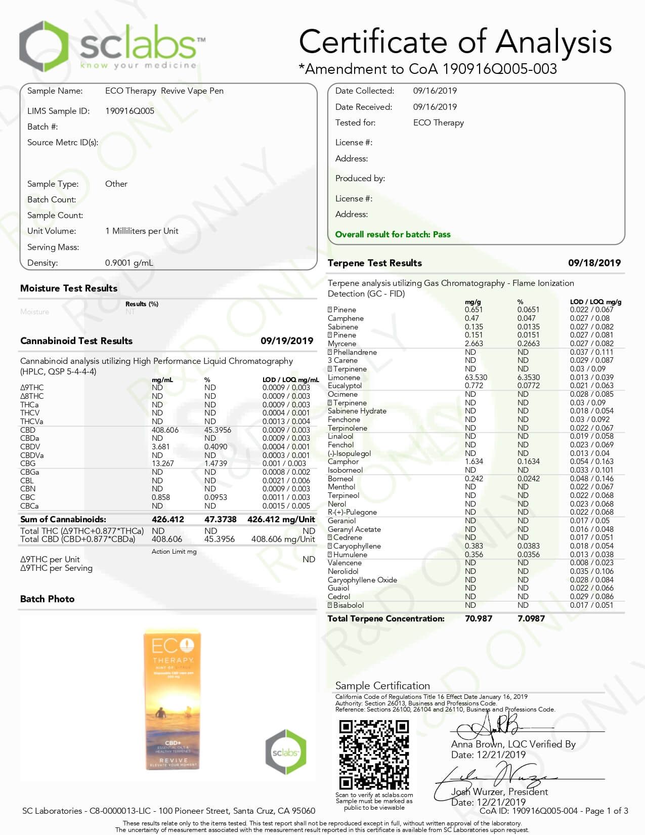 ECO Therapy CBD Vape Revive Disposable Pen Lab Report