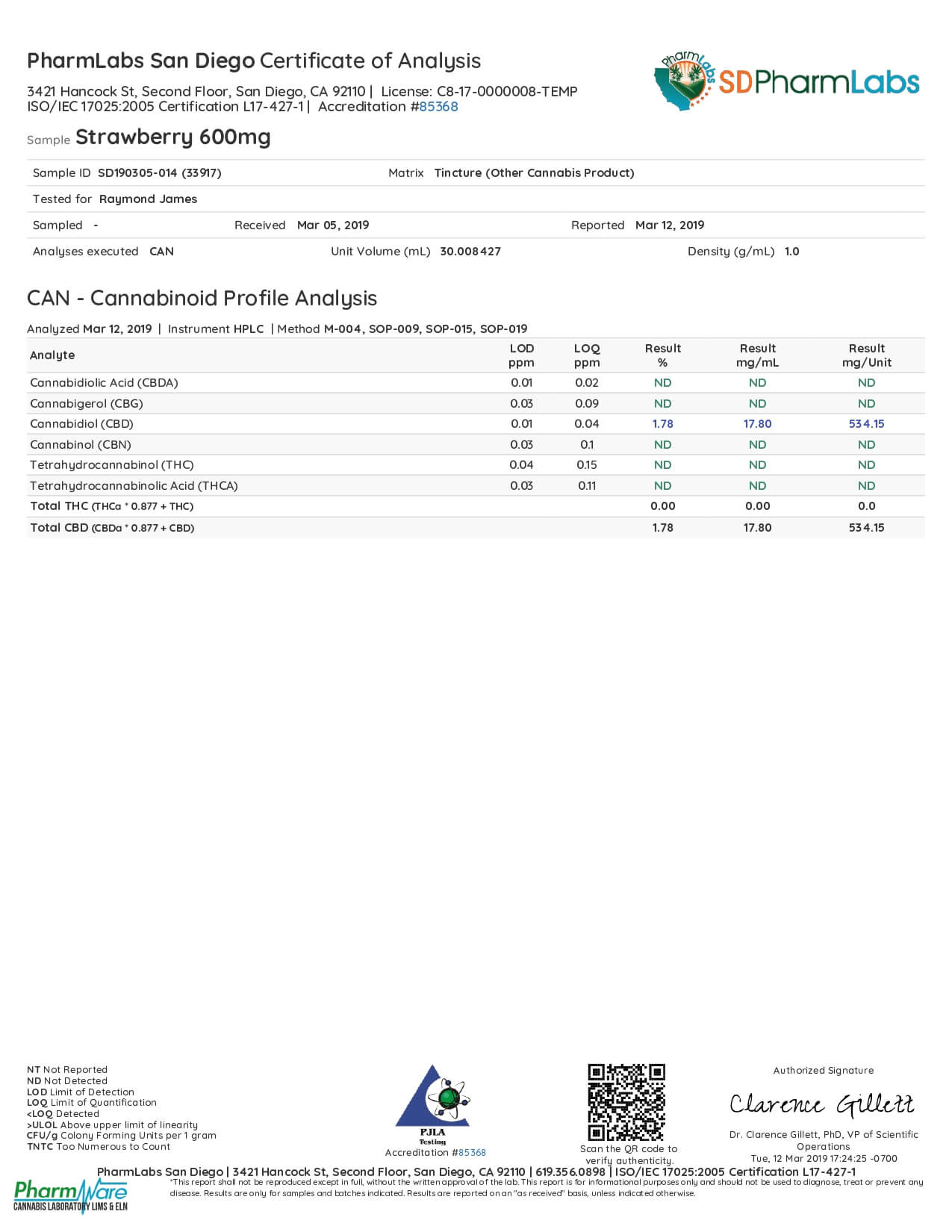 El Gallo CBD Tincture Natural Strawberry 600mg Lab Report