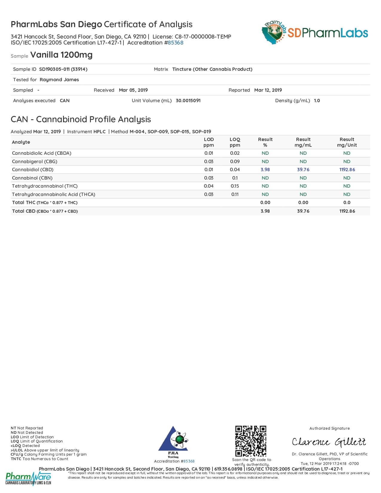 El Gallo CBD Tincture Natural Vanilla 1200mg Lab Report
