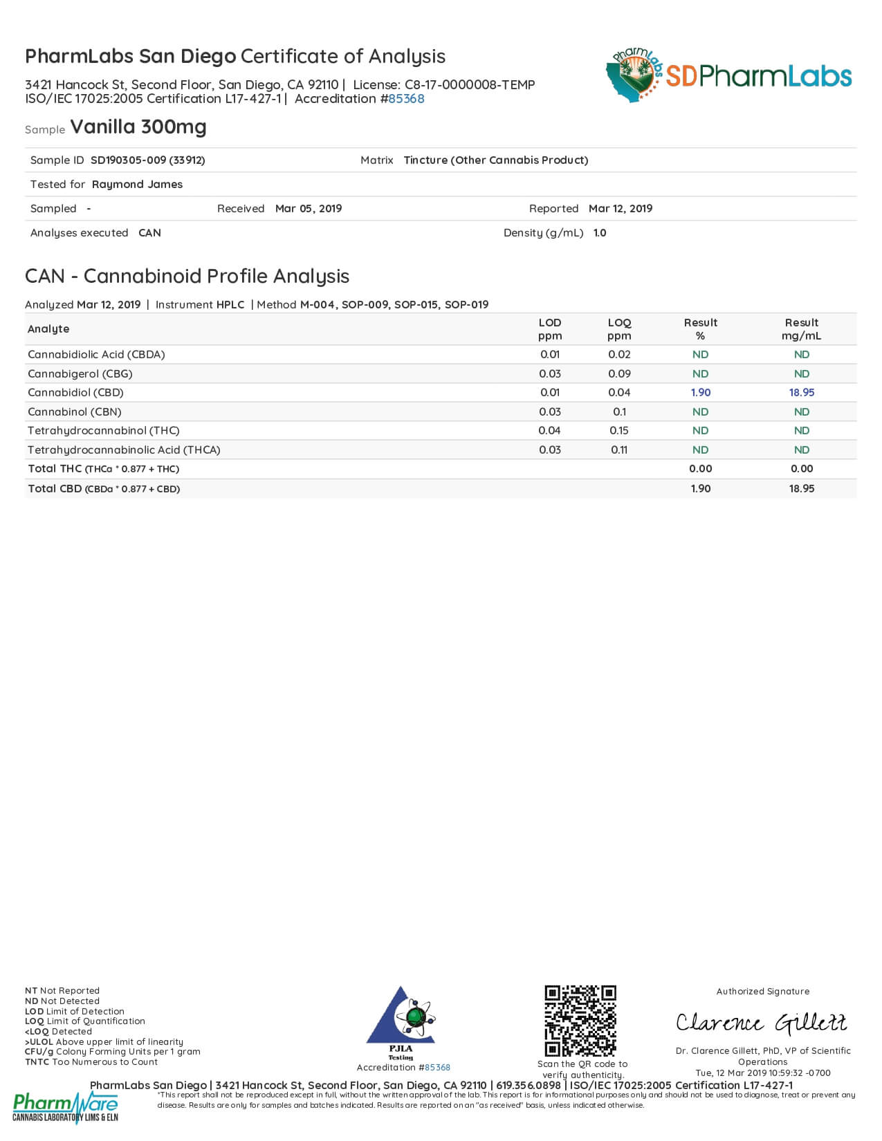 El Gallo CBD Tincture Natural Vanilla Lab Report