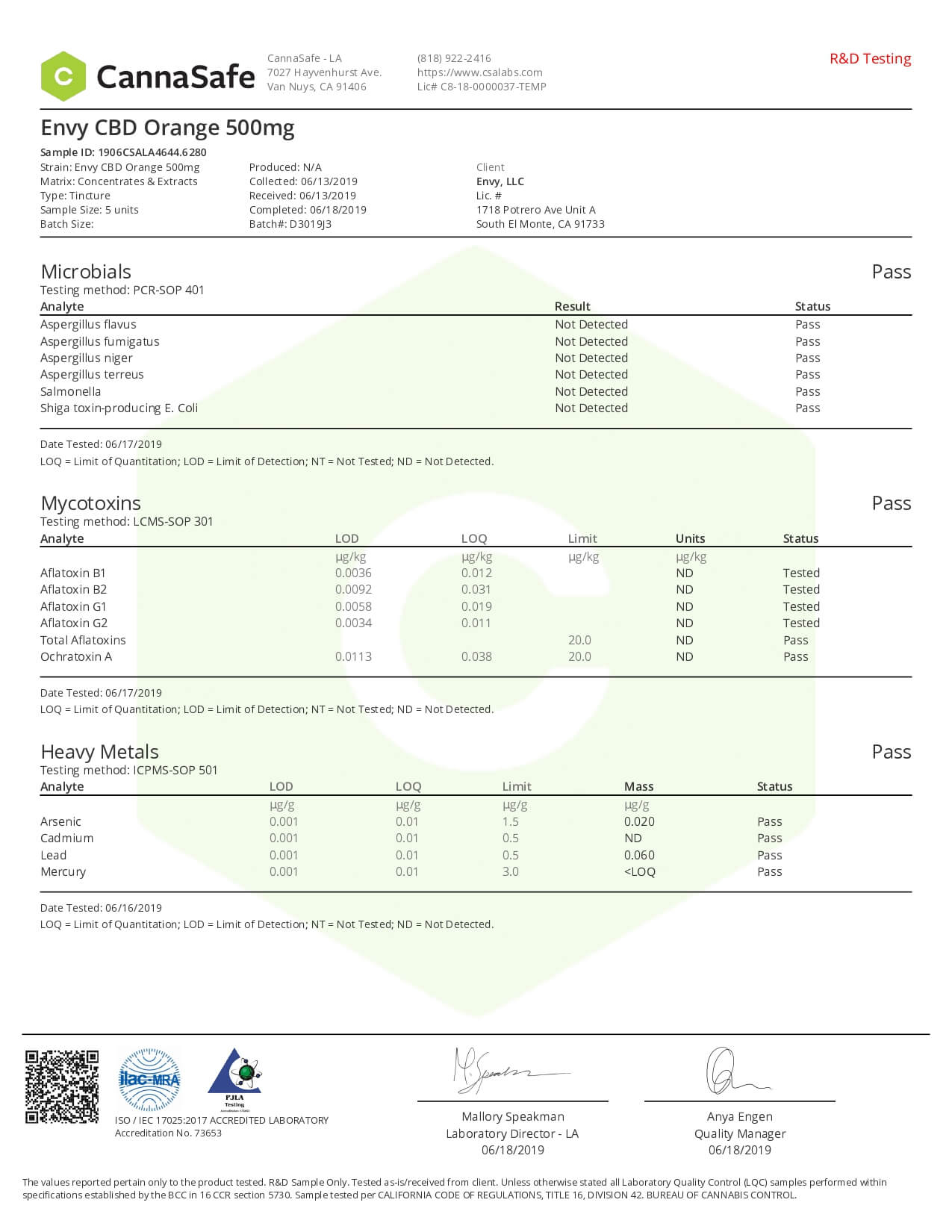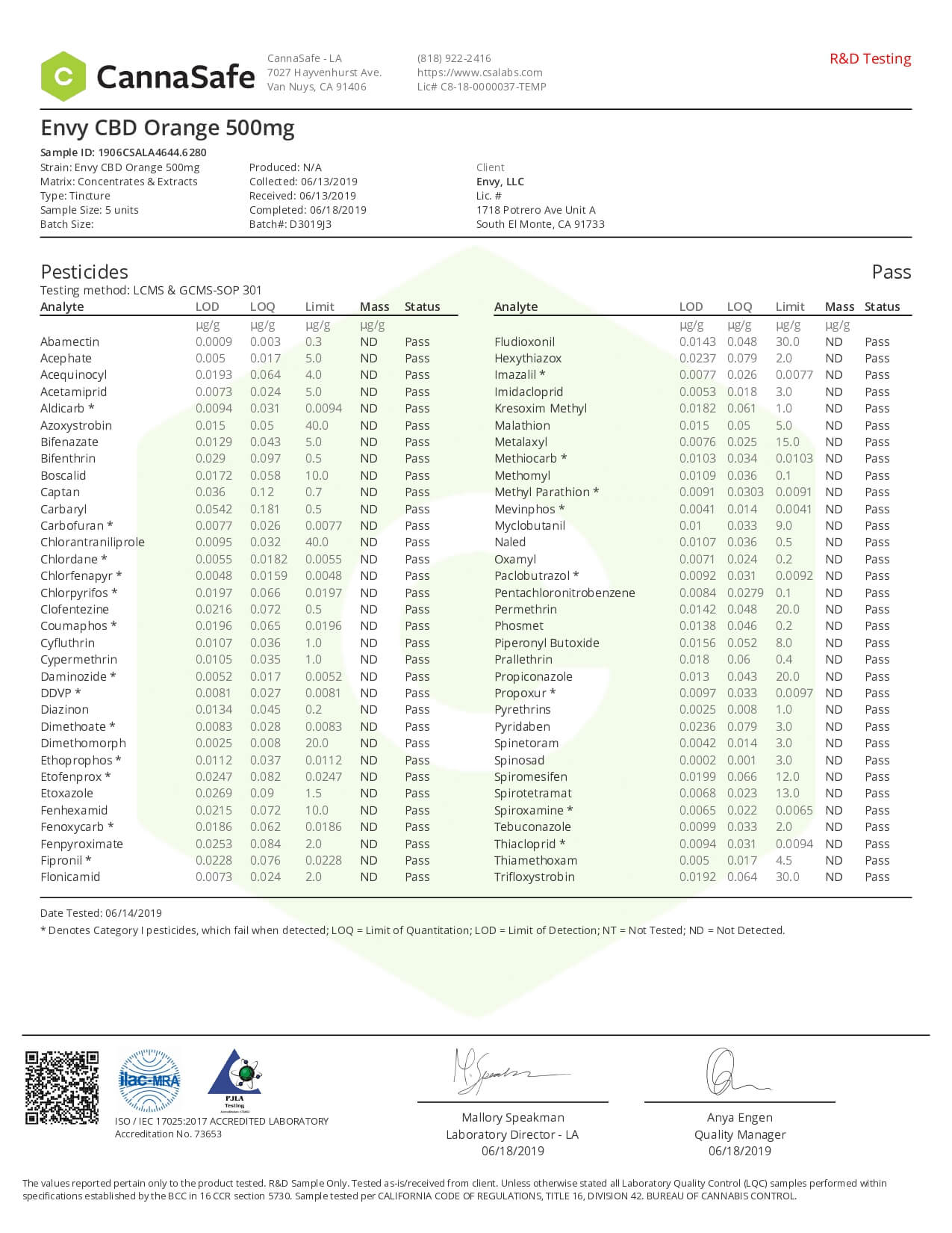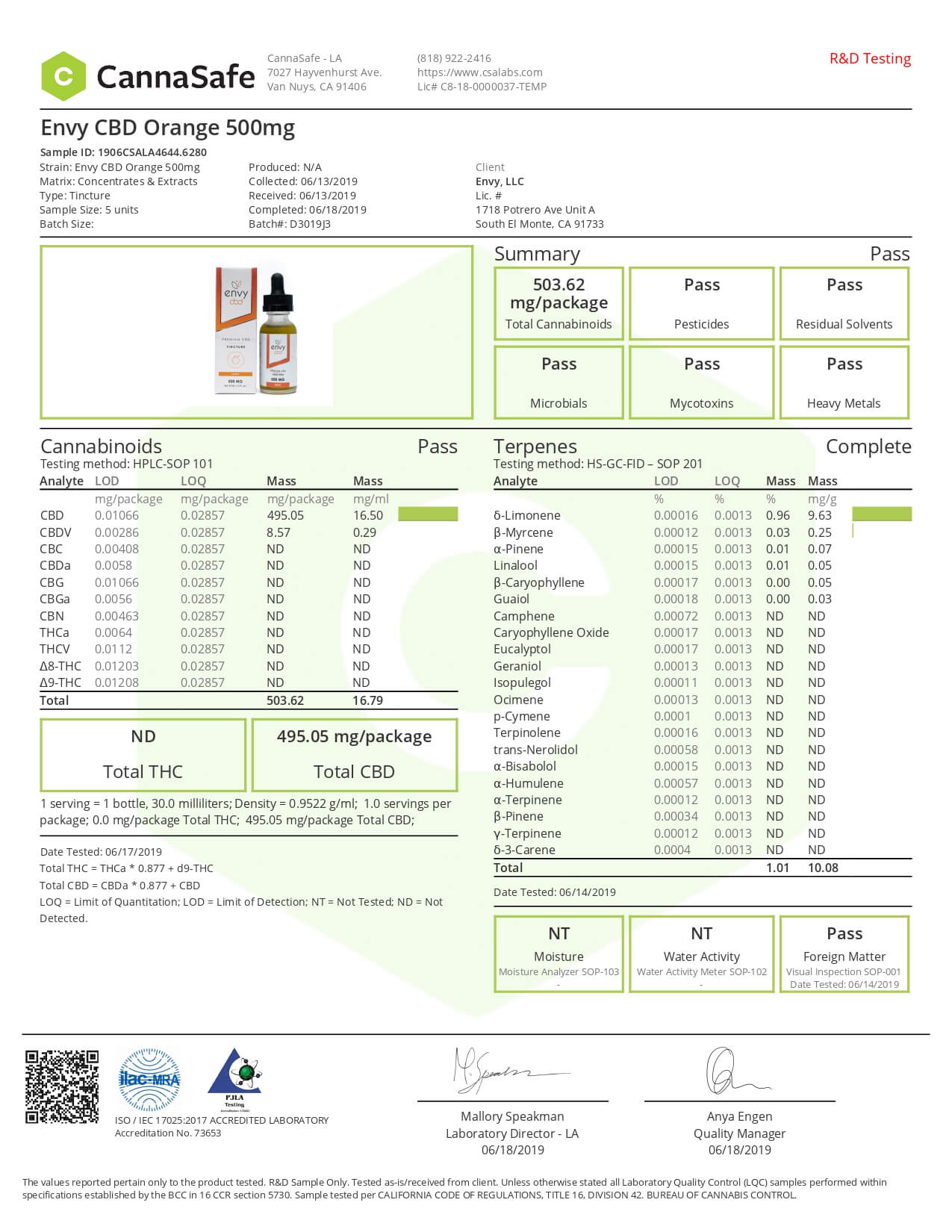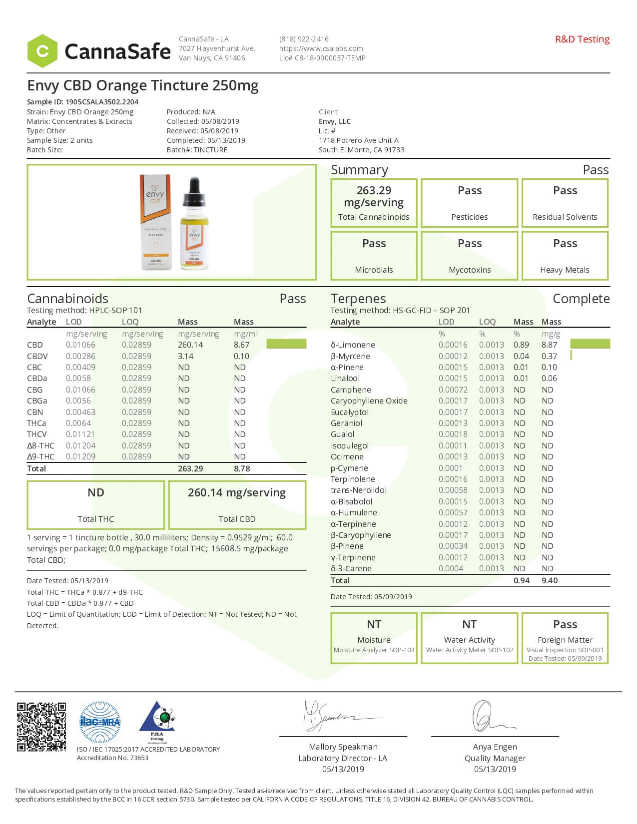 ENVY CBD Tincture Orange Lab Report