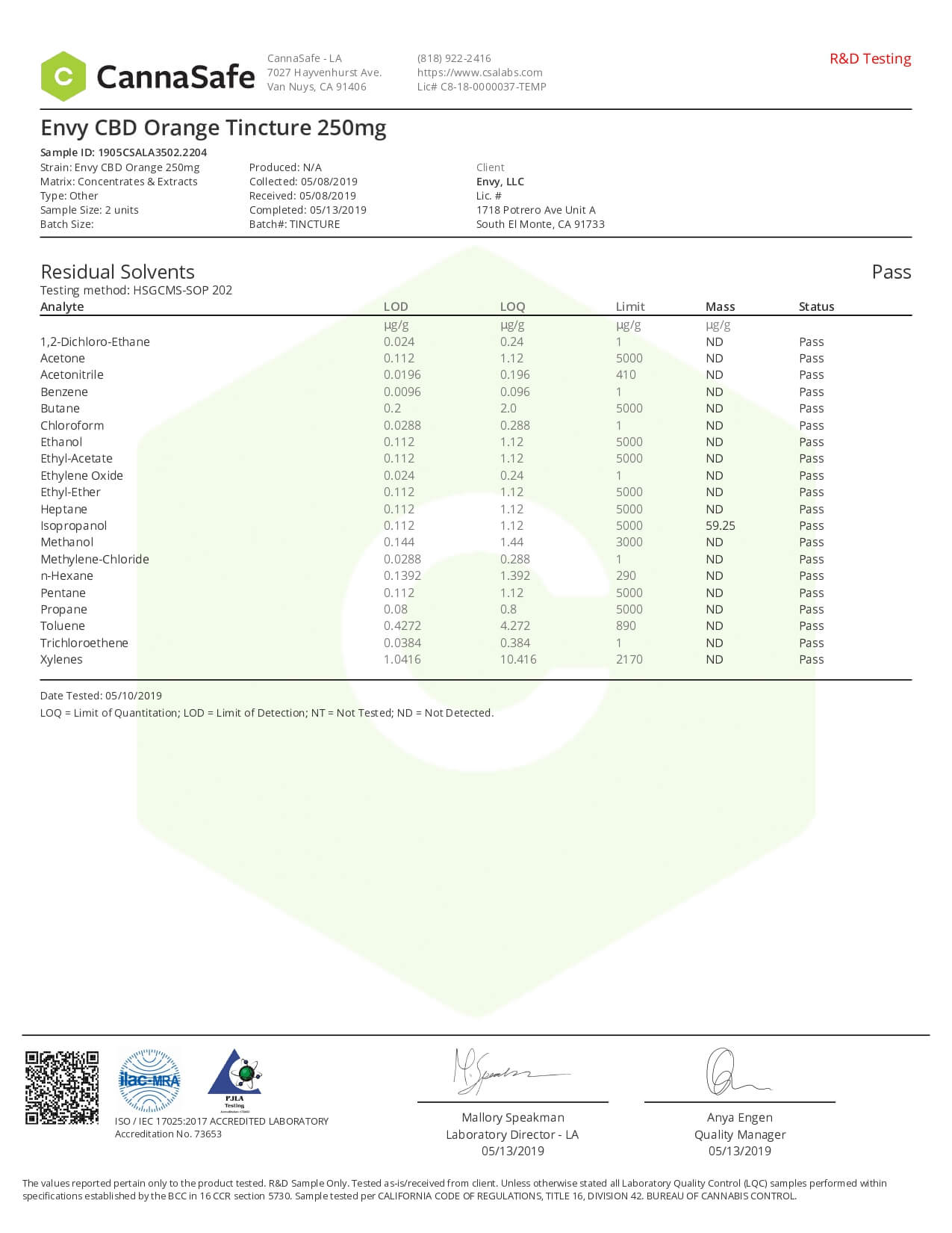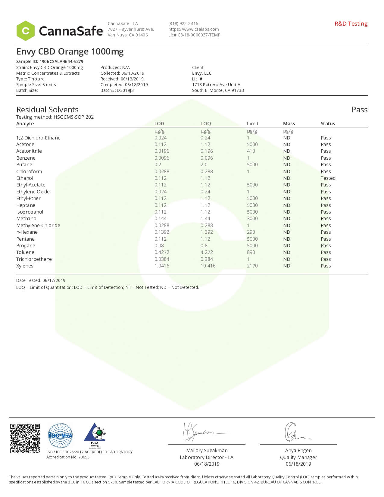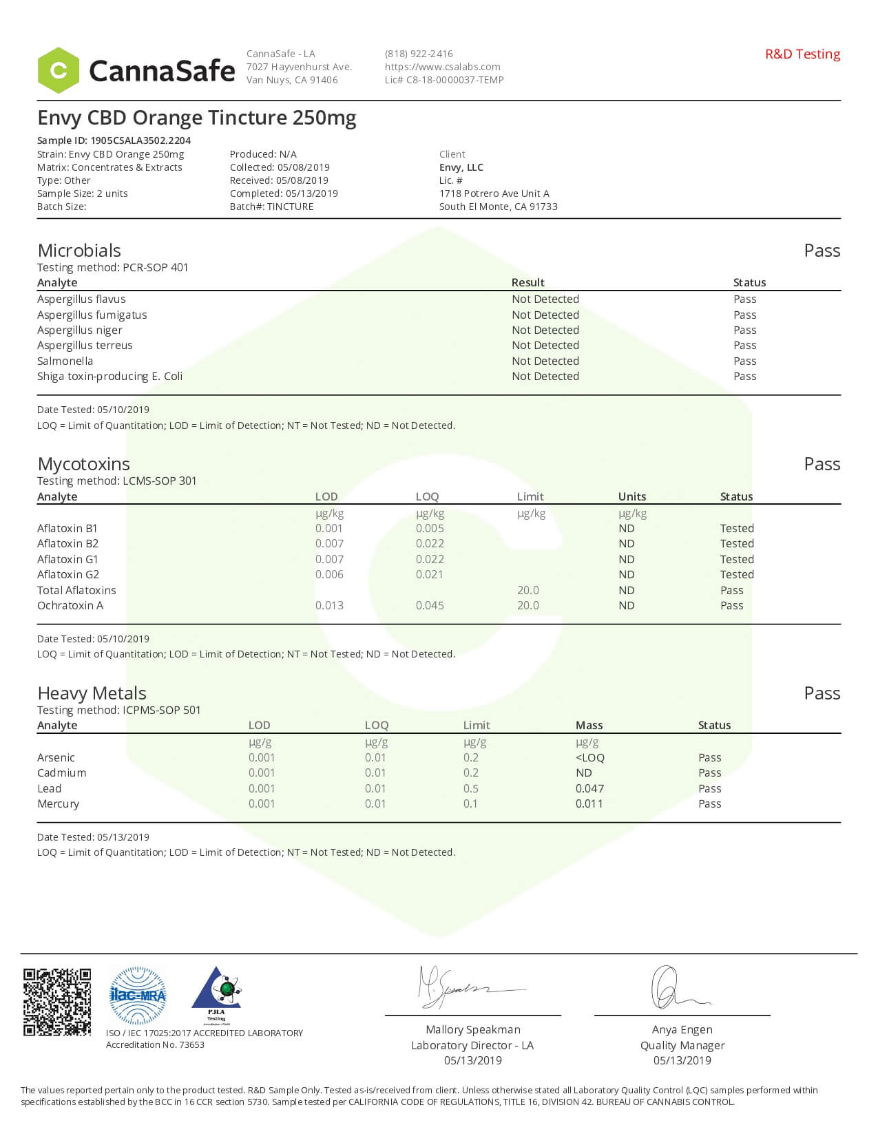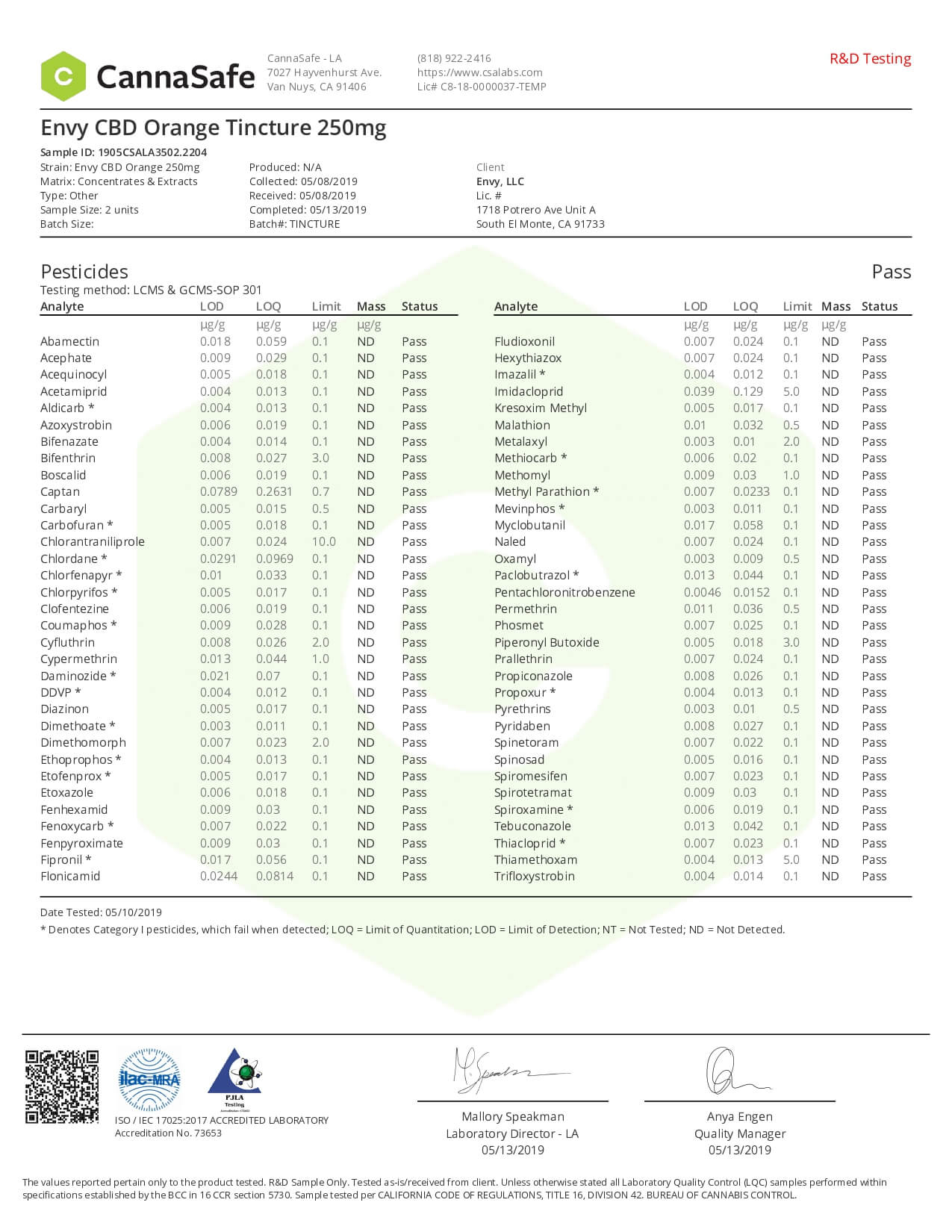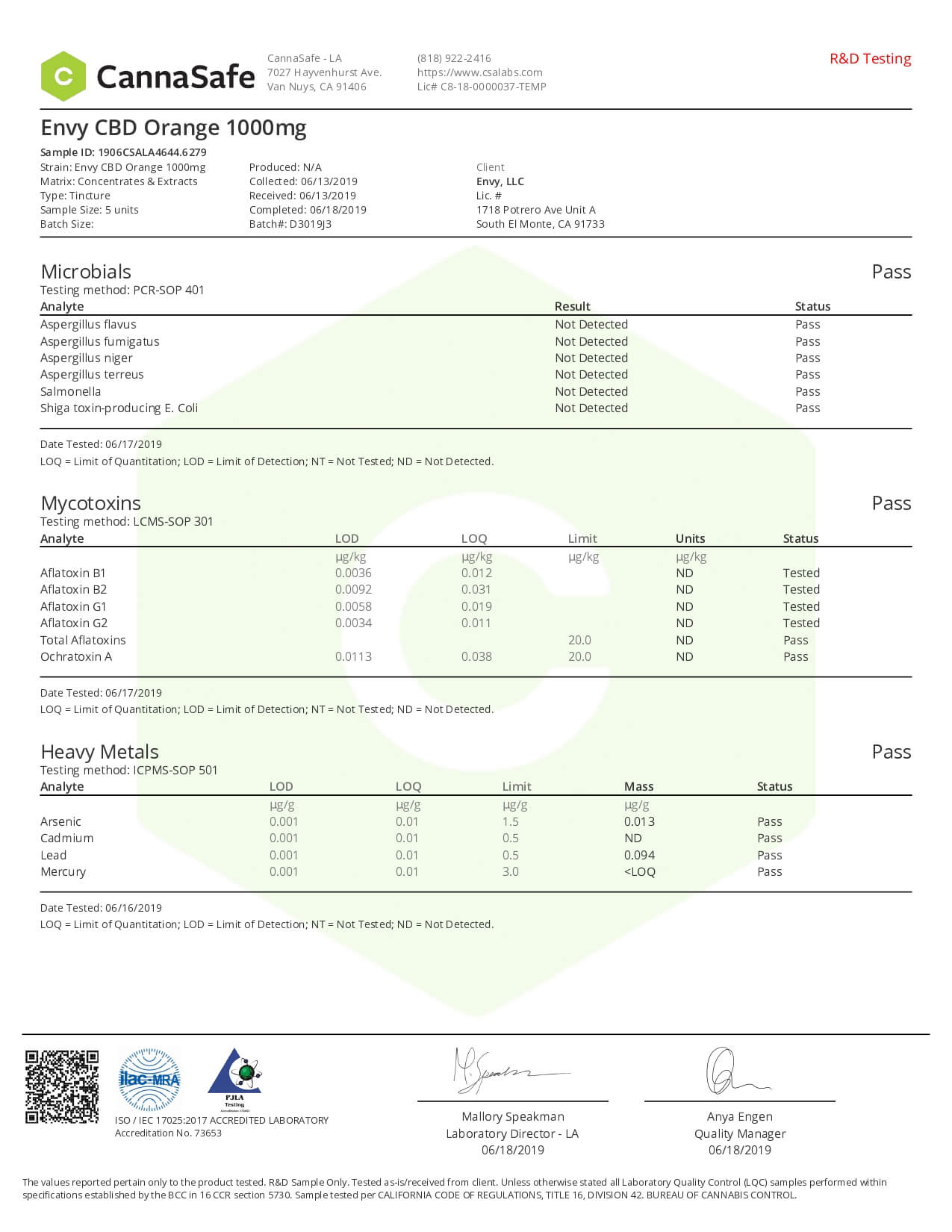 ENVY CBD Tincture Orange Lab Report