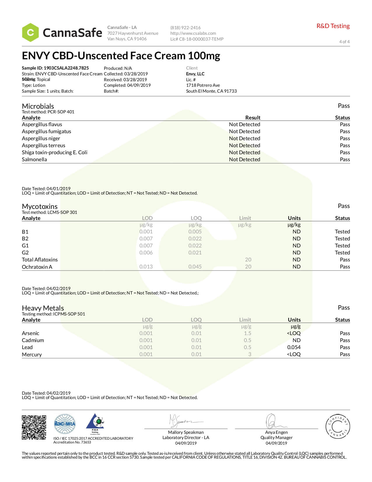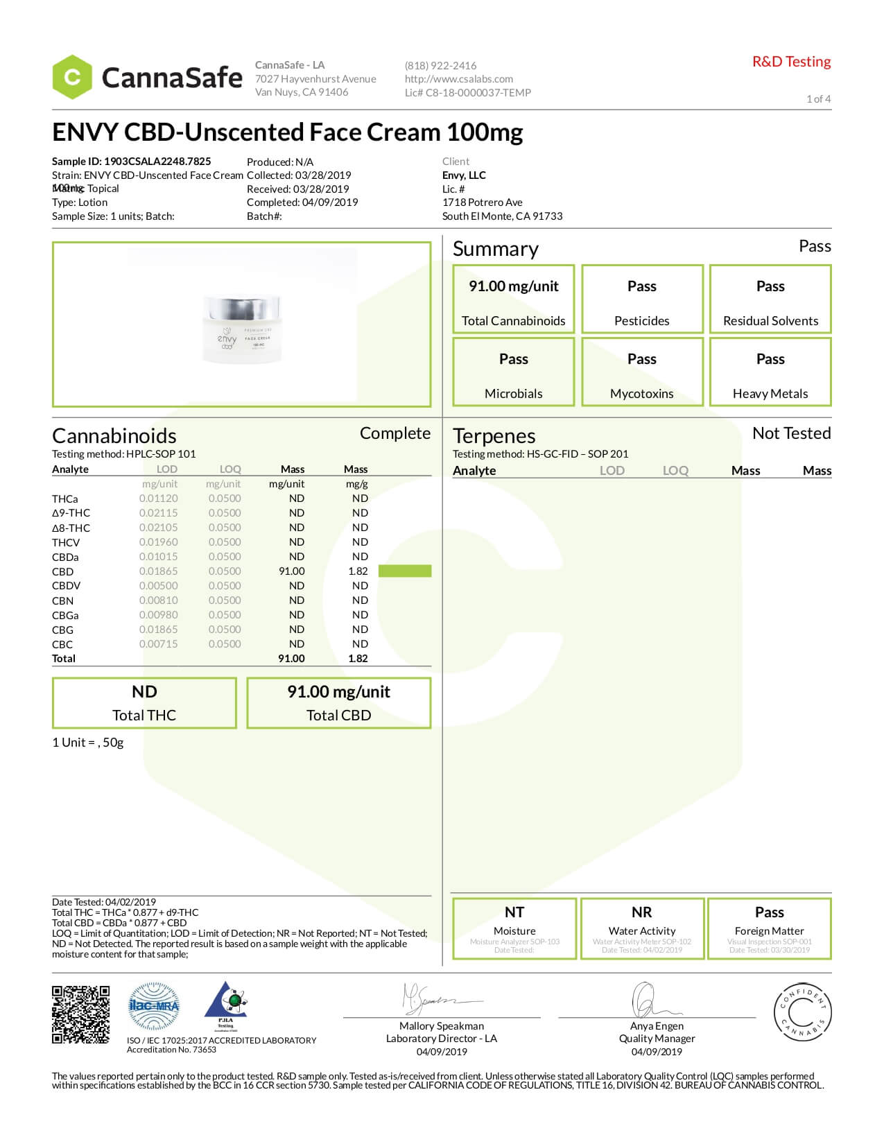 ENVY CBD Topical Unscented Face Cream Lab Report