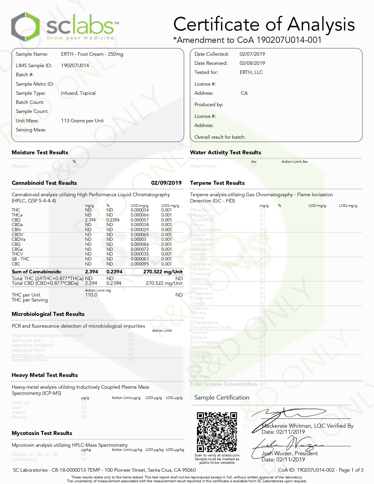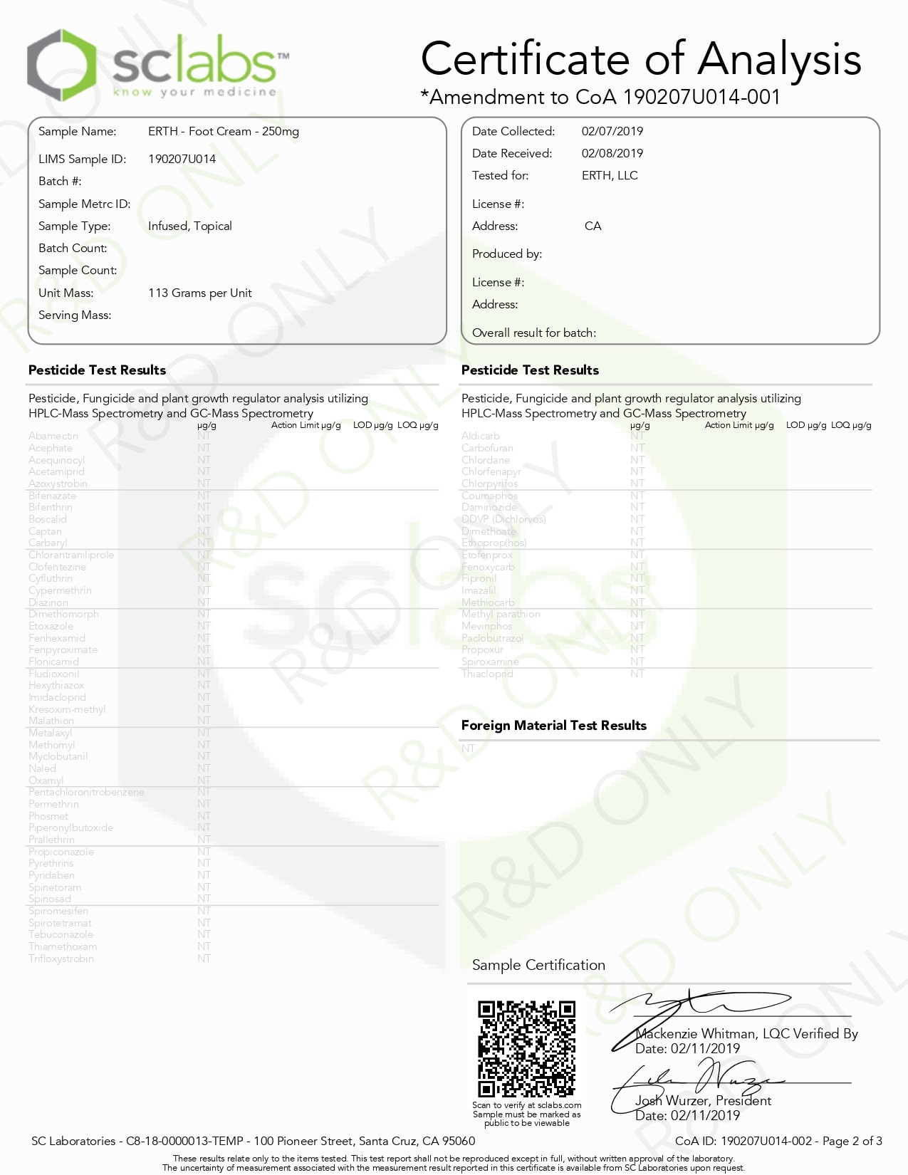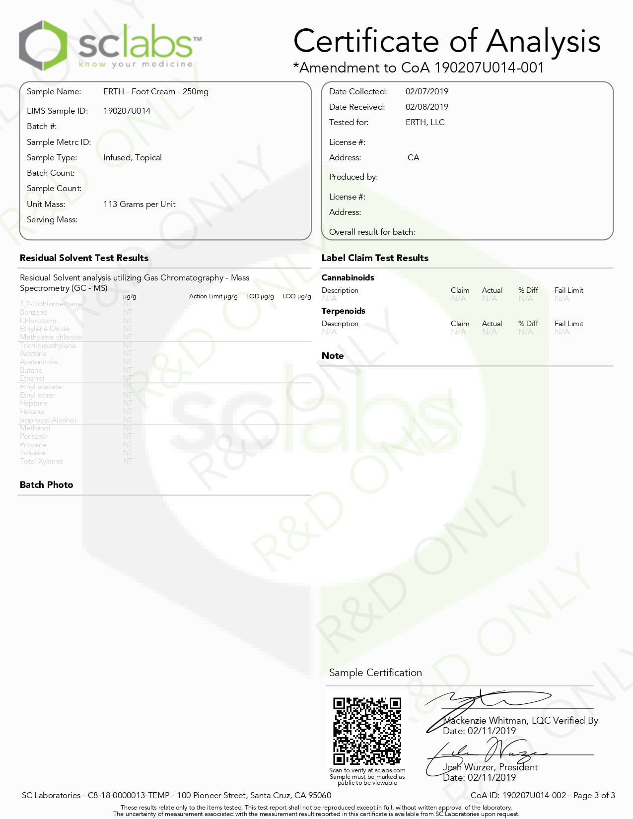 ERTH Hemp CBD Foot Cream Sooth & Refresh Lab Report covering detailed information in regards to vaping products.