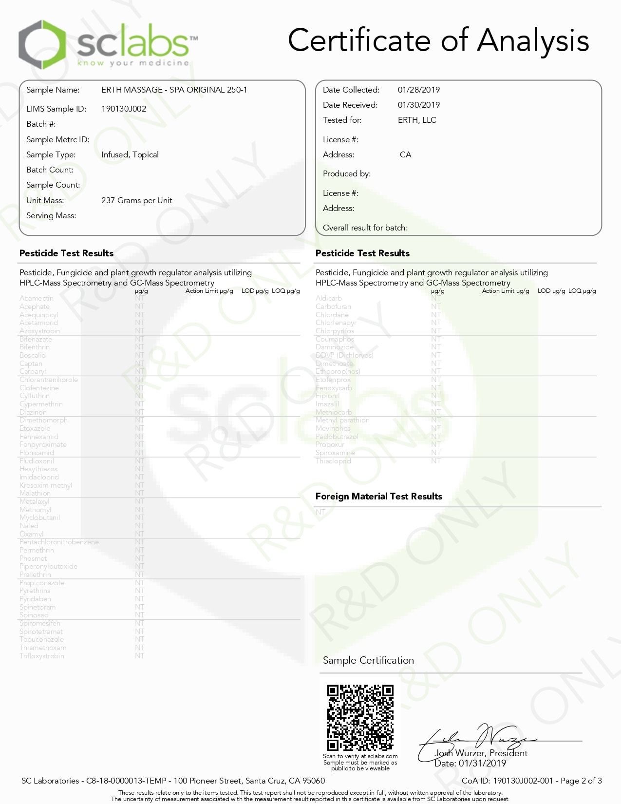 ERTH Hemp CBD Massage Oil Lab Report Spa Original 1000mg
