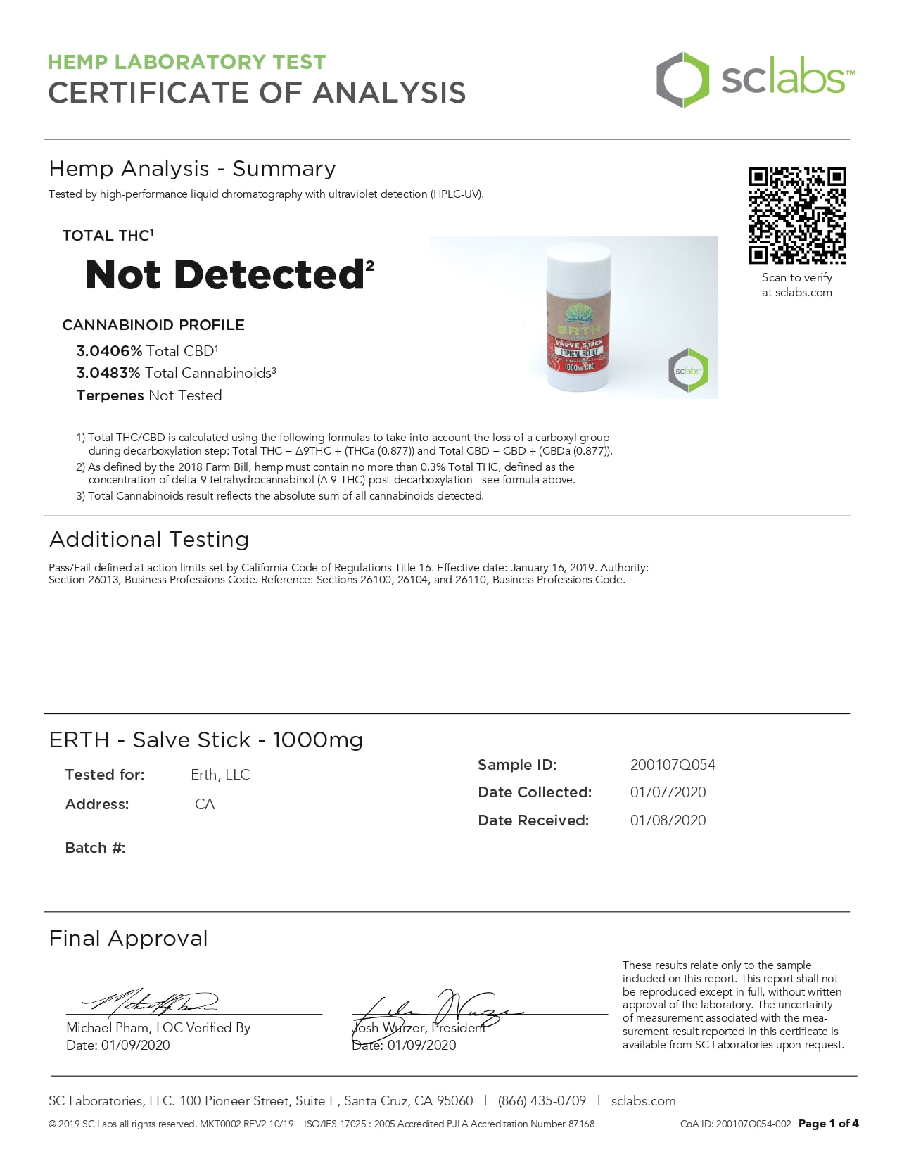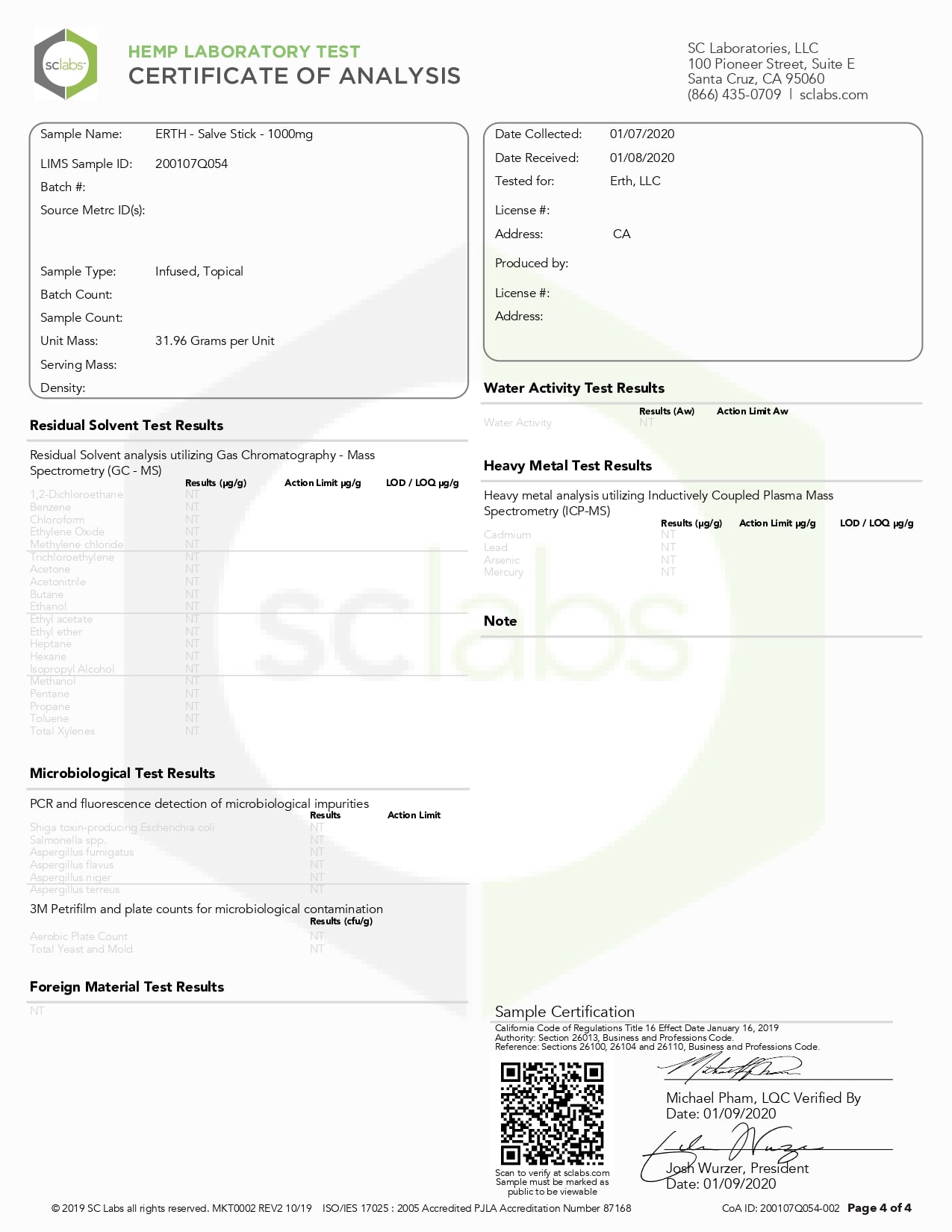 ERTH Hemp CBD Topical Pain Stick Relief 1000mg Lab Report