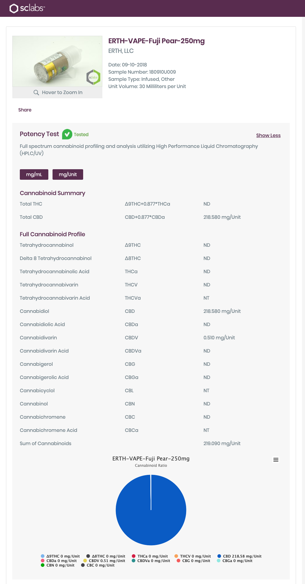 ERTH Hemp Fuji Pear CBD Vape Juice, check out the lab report information to have knowledge relating to vaping products.