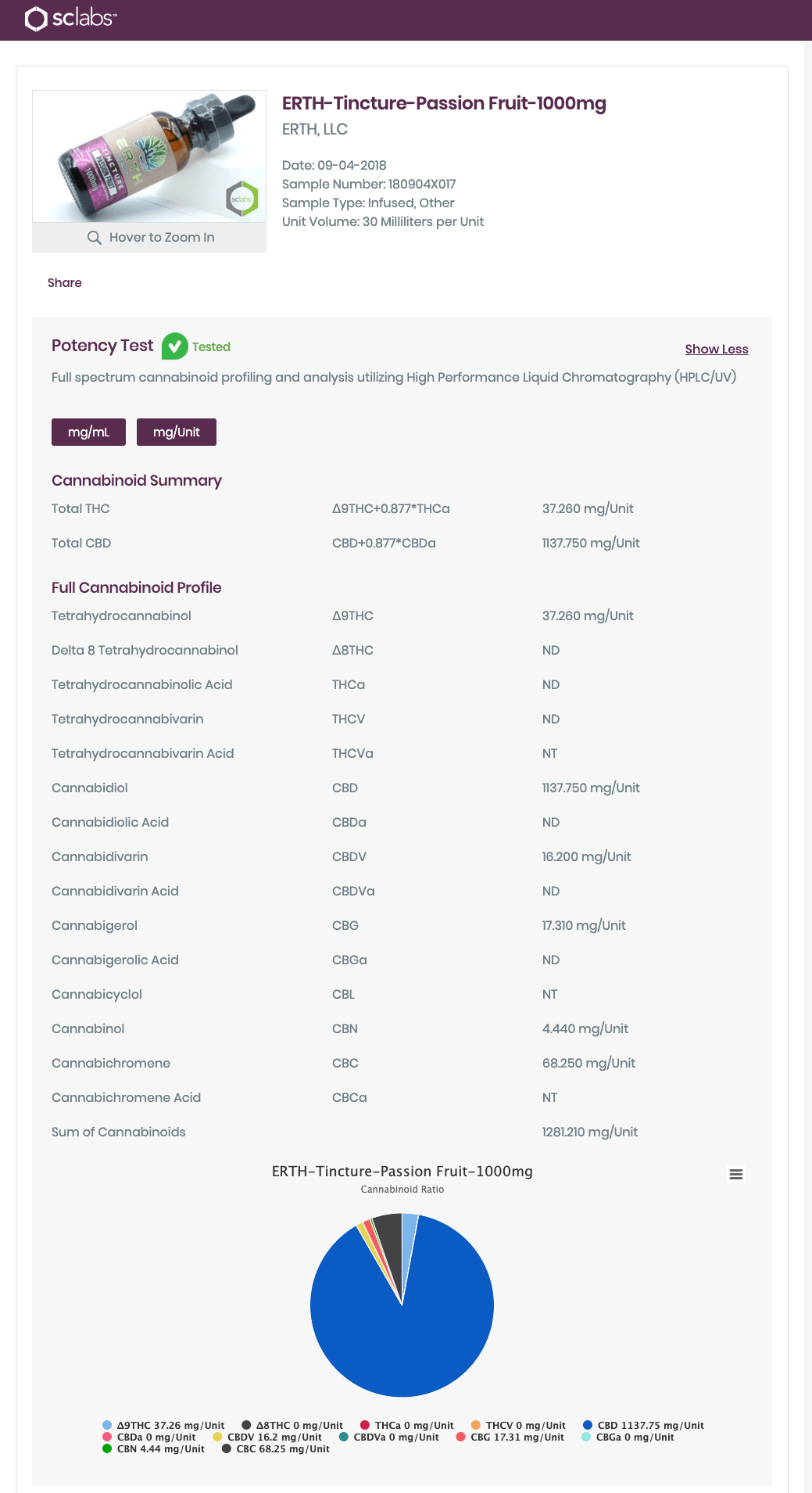 ERTH Hemp Full Spectrum CBD Oil Passion Fruit Tincture lab report documentation includes details in regards to vaping products.