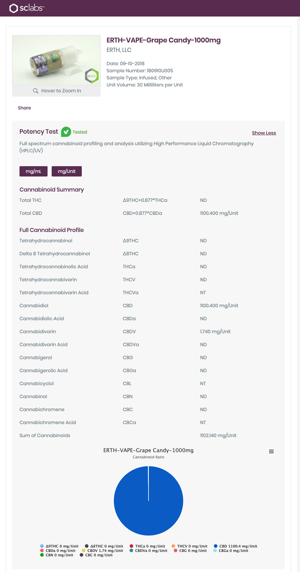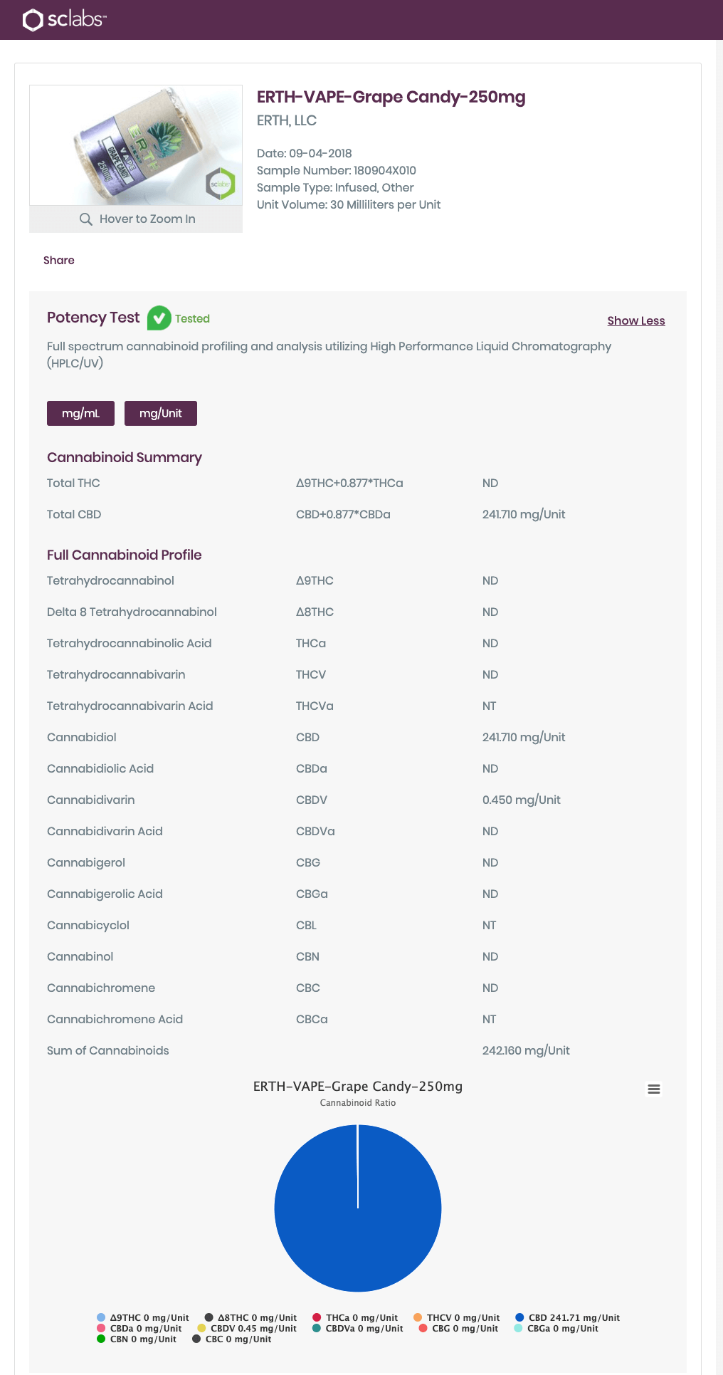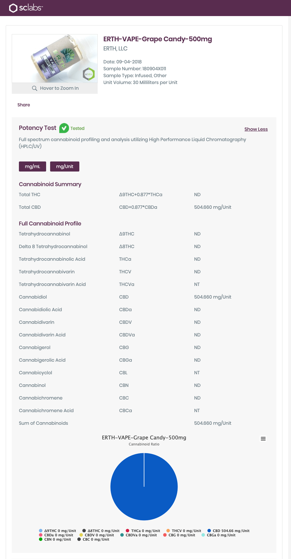 ERTH Hemp Grape Candy CBD Vape Juice Lab Report