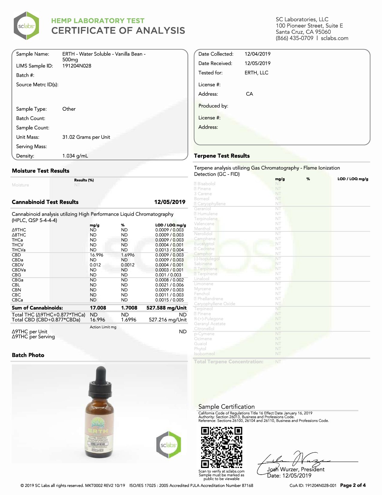 ERTH Hemp Nano-Emulsified Water Soluble CBD Vanilla Bean Lab Report documentation includes details in regards to vaping products.