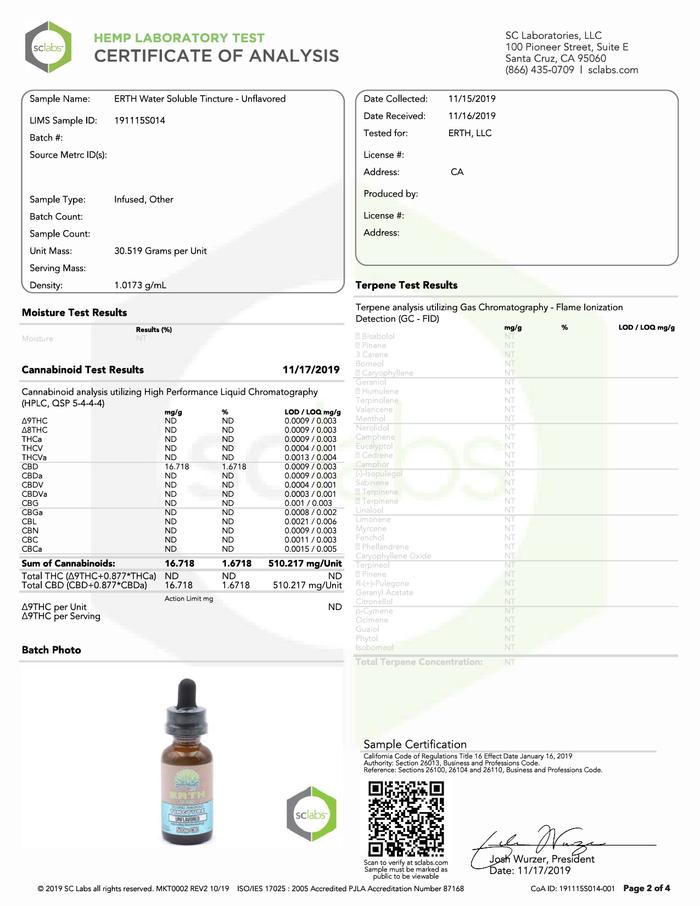ERTH Hemp Water Soluble CBD Tincture Unflavored Lab Report documentation includes details in regards to vaping products.