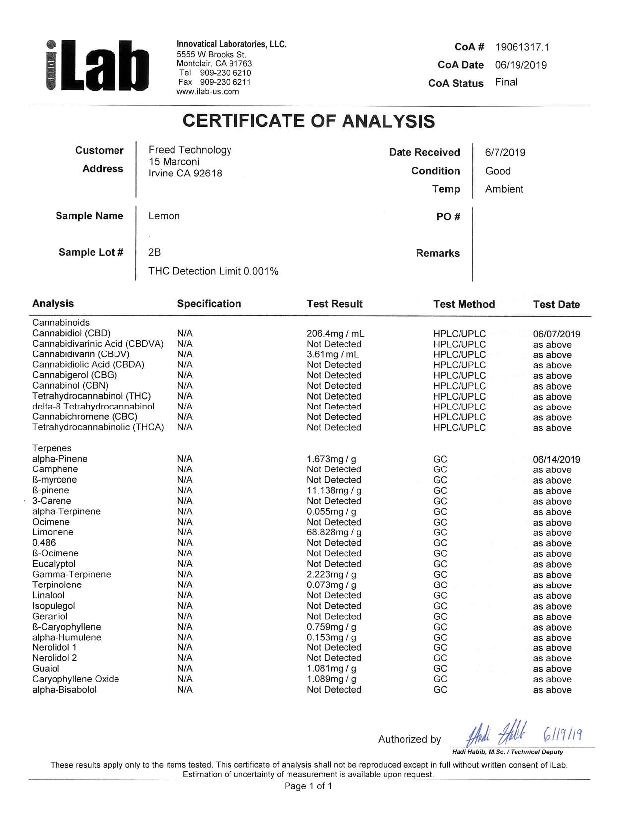 Freed CBD Cartridge Citrus Blend Lab Report important details about vaping products.