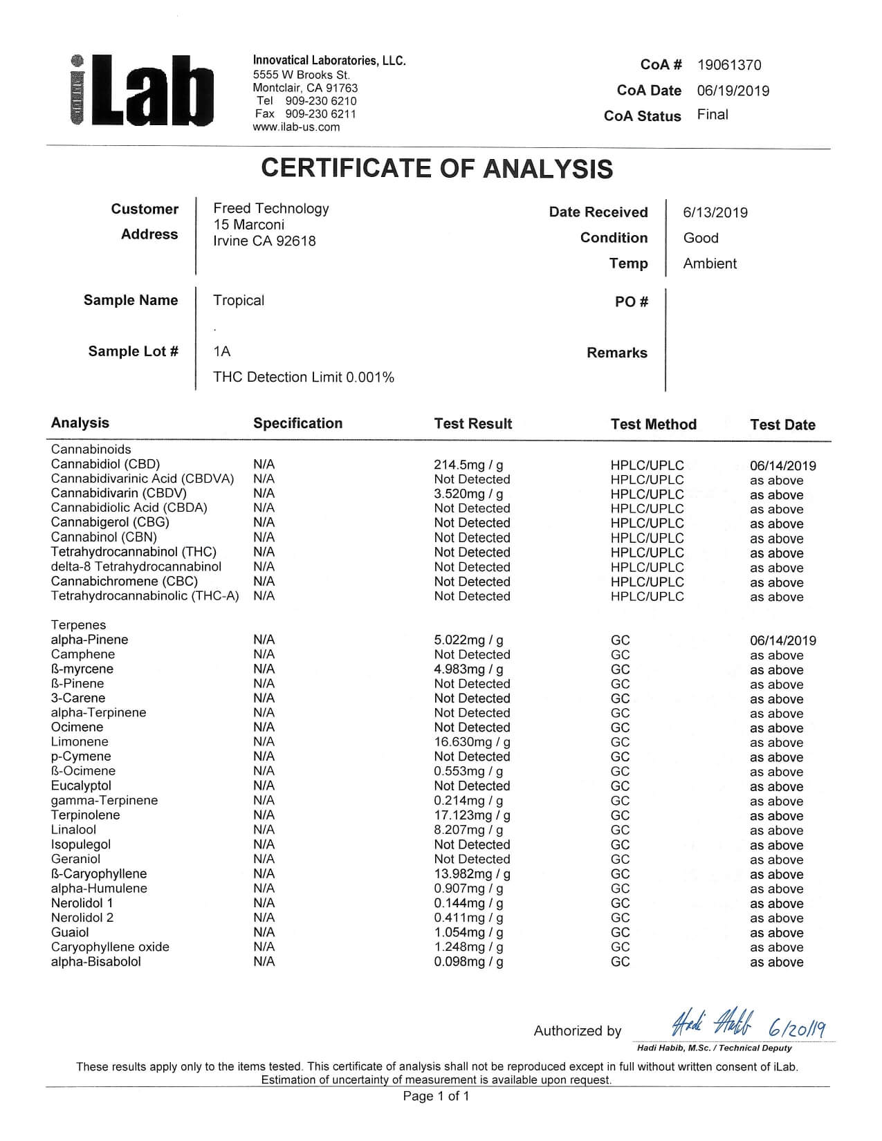 Freed CBD Cartridge Tropical Lab Report important details about vaping products.
