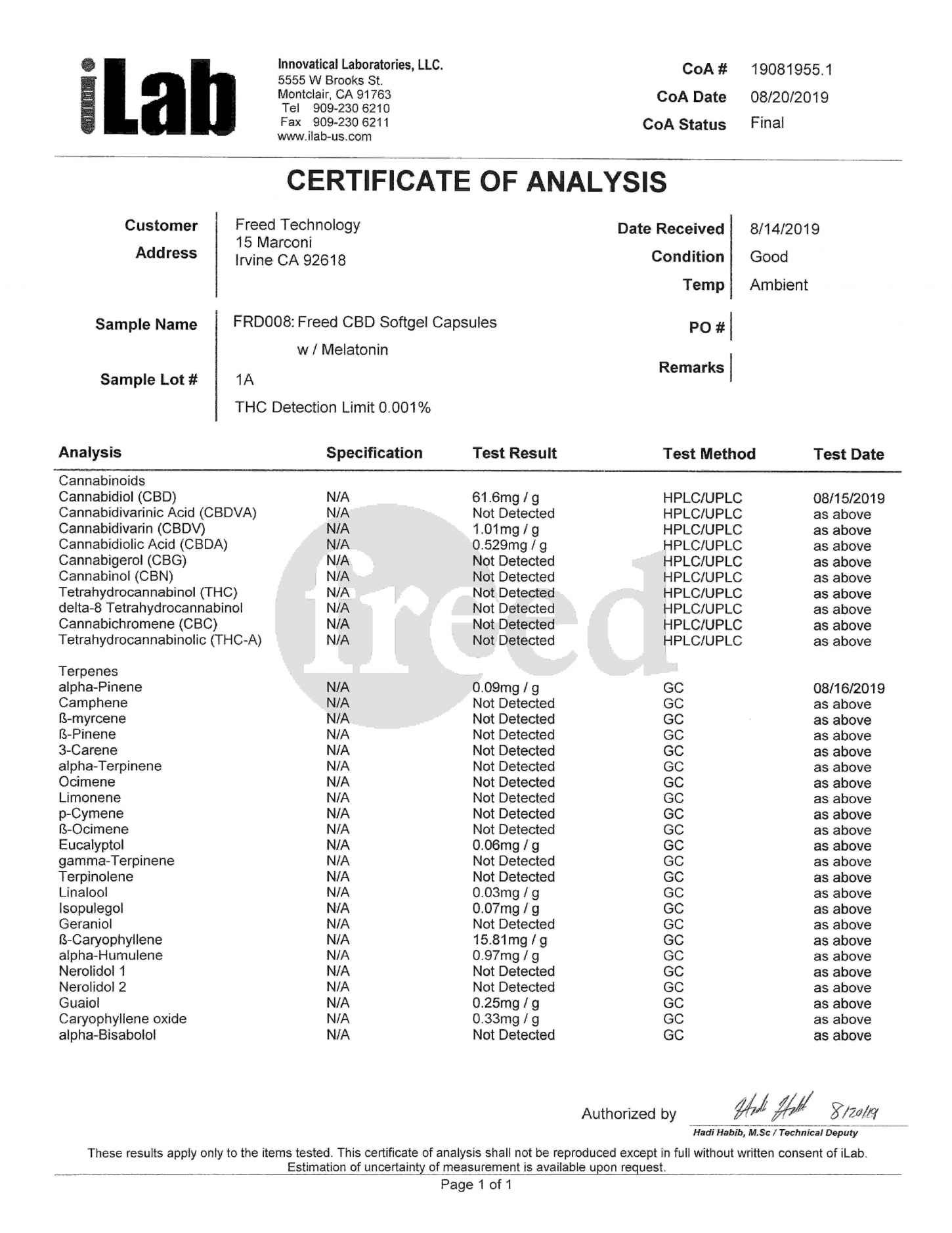 Freed CBD Soft Gel Caps Melatonin Lab Report
