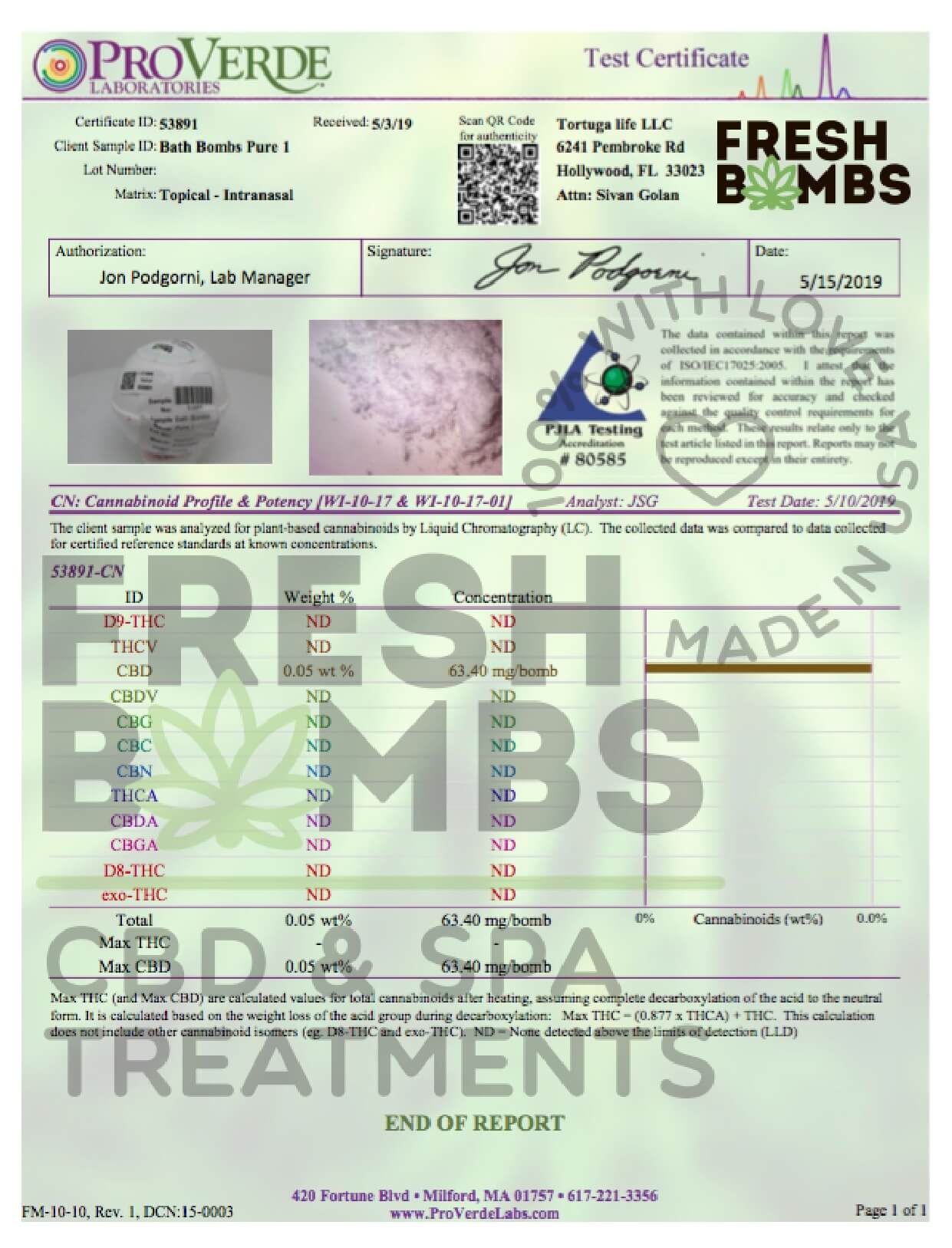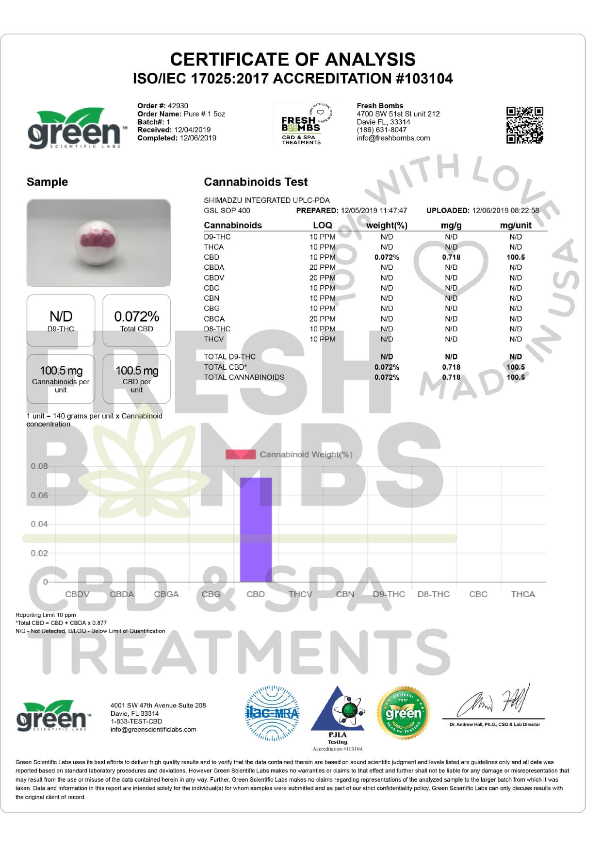 Fresh Bombs CBD Bath Pure Bath Bomb 100mg Lab Report